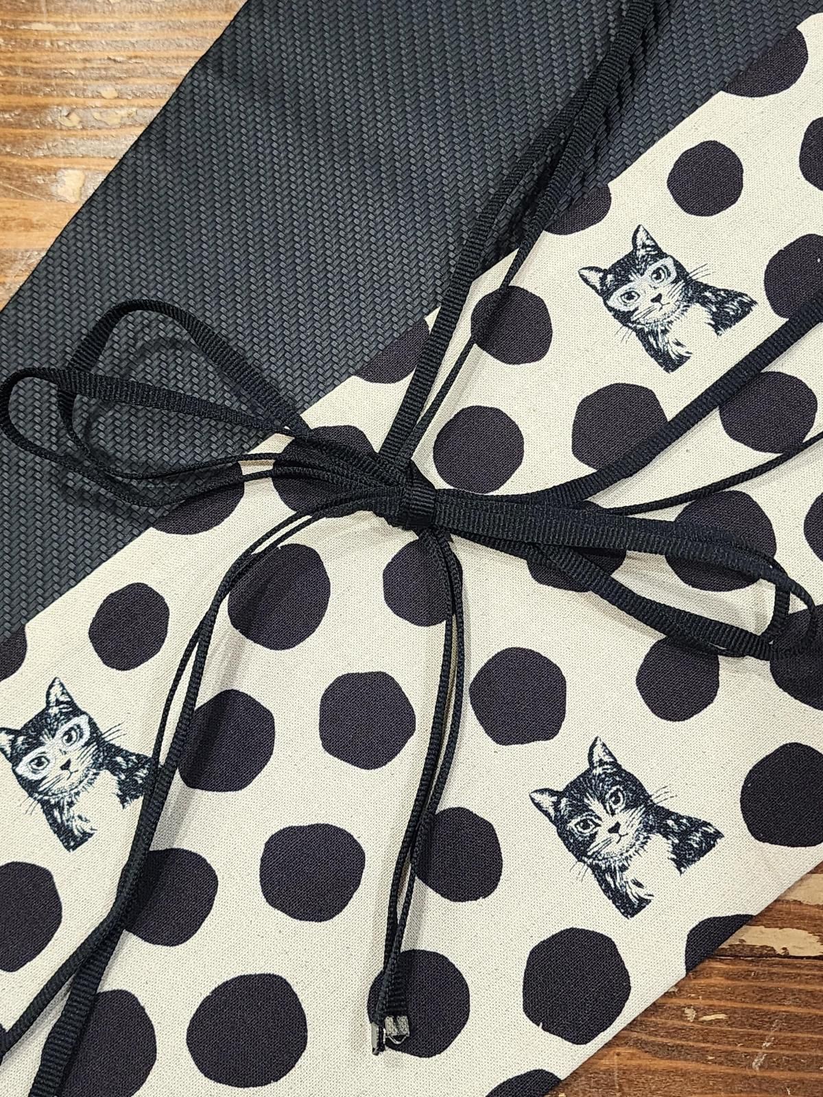 - 表面: ゆらぎポルカドットにおすまし猫、眼鏡猫が隠れた遊び心あるモノトーン柄。