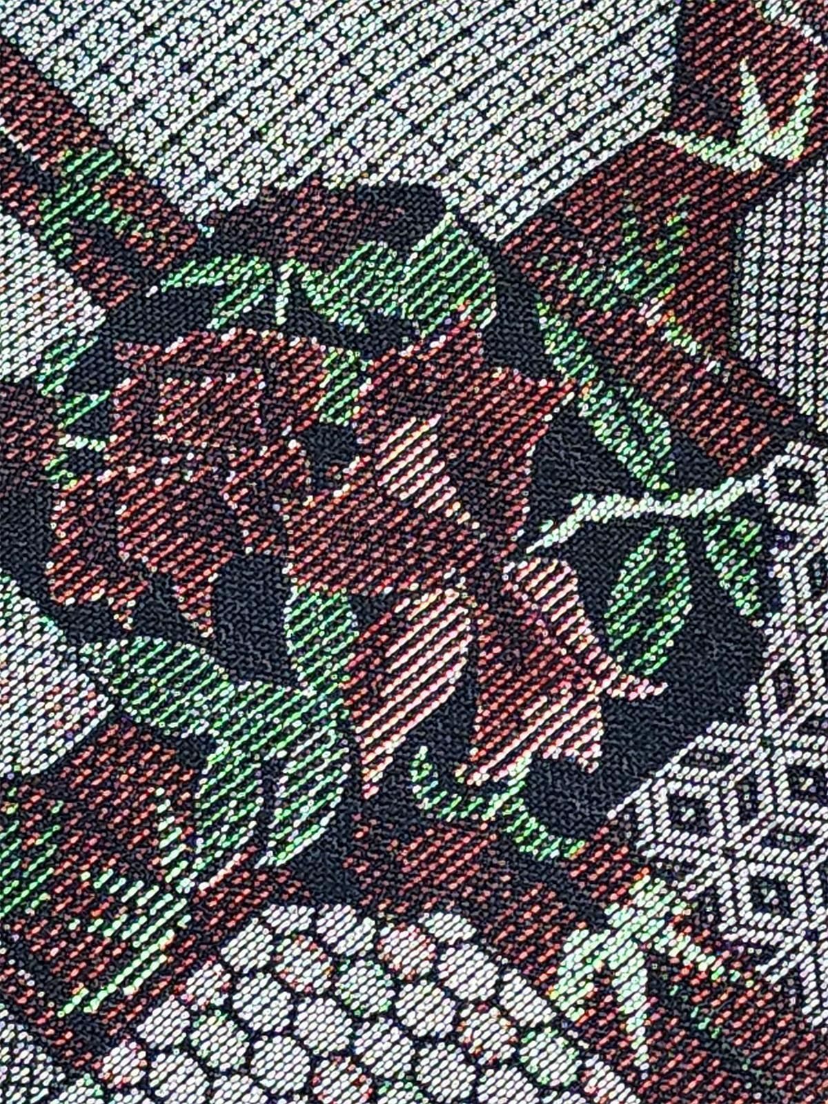 - デザイン: 落ち着いたアッシュ系のダークトーンの地に、繊細な笹の縞と、麻の葉や亀甲、格子、菱、可憐に咲く花枝で飾られた小窓のような幾何学模様が重ねられた、大島紬を思わせる洗練されたデザイン。
