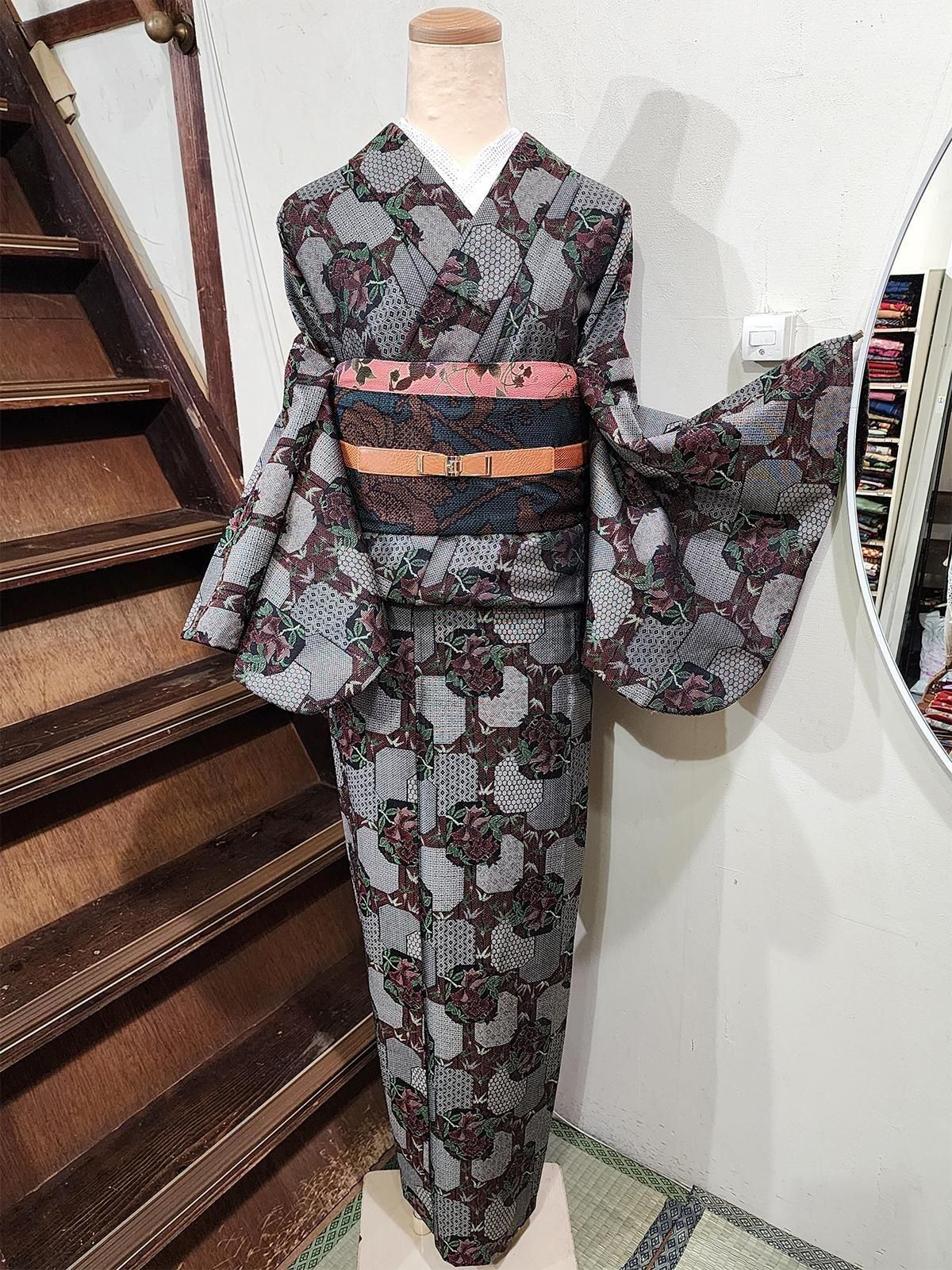 アッシュカラーに花幾何学と笹ストライプ美しい大島風シルクウール単着物 SOLD OUT 販売価格 9,800円(税込10,780円) 在庫数 在庫無し 繊細な笹の縞に、細やかな絣模様と優美に咲く花を重ねて。大島紬風の気品ただようシルクウールの単着物 デザイン: 落ち着いたアッシュ系のダークトーンの地に、繊細な笹の縞と、麻の葉や亀甲、格子、菱、可憐に咲く花枝で飾られた小窓のような幾何学模様が重ねられた、大島紬を思わせる洗練されたデザイン。 印象: 控えめな艶と奥行きのあるモノトーンベースに、深いボルドーとグリーンがアクセントになった落ち着きと華やぎを両立した一枚。 素材・着用感: ざらりとした手触りの中厚の生地で、ウールにシルクと化繊を混紡したシルクウールと思われます。シワになりにくく、ご自宅で気軽にお洗濯できる扱いやすさも魅力です。しなやかに体に沿い、ほどよいハリで体の線を拾いにくく、すっきりと着こなしていただけけそうです。 季節・シーン: 裏地のない軽やかな単仕立てですが、ウールなので真冬も暖か。暑さが落ち着いた初秋から春までスリーシーズン活躍。街歩きや旅行、雨の日のお出かけなどの普段使いから、食事会、観劇などのちょっとおめかししたお出かけまで幅広く楽しめます。 コーデ提案: 無地系や幾何の帯で柄を引き立てて端正に。花や更紗の帯でロマンティックに寄せるのもおすすめ。小物は黒・ボルドー・深緑が好相性。 着物の種類:シルクウール着物(ウール・化繊・絹混紡) / 単仕立て / 織模様 ウール着物の魅力については下記の特集ページでもご紹介しています。ぜひご覧ください。 姉妹屋イチオシアイテム!ウール着物のススメ 仕立て: エリはバチ衿で手縫い仕立てです。※手縫いかどうかについての判断は、スソまわりとソデまわり、ソデ付け、脇線の縫い目で確認しております。それ以外の部分ミシン縫いの場合は見逃しがあることがございますので、ご了承ください。 サイズ(単位:cm) 身丈158.5cm 裄丈66.5cm 袖丈45.5cm 前幅22cm 後幅30cm 目安:身長 153.5cm〜163.5cm 前後の方向け 体型により個人差あり 着物サイズについて サイズなどのご相談はLINEでお気軽に! 発送日: 5営業日以内に発送いたします。 丈について: 肩山から裾までの長さです。 裄について: 裄の項目で、裄出しが可能な場合は 「(縫代◯cm)」 と表記しています。※縫代の記載がない商品は、裄出しの余裕がない、または袷仕立てのため判別できないものです。 実測サイズ: 平置きでの採寸のため、多少の誤差が生じる場合があります。 状態 写真に写らない若干の小汚れや小キズ、アクやクスミがあります。 昔のお着物に慣れた方であれば十分お召しになっていただけるかと思います。 検品にはできるだけ注意を払い、シミ・汚れ等を記載しておりますが、微小の汚れ等につきましては見落としがある場合もあります。ユーズド品であることにご理解のうえご購入をお願いいたします。 胴裏につきましては、ユーズド・アンティークの着物はホシやシミが生じているものが大半のため、状態が軽度のものにつきましては記載を省かせていただいております。 当店で取り扱いしている着物の状態については、「姉妹屋について」のページの「着物の状態について」をご参照ください。 その他注意事項 商品は、『着物または浴衣』のみになります。写真のその他のアイテムは別売りまたは撮影用の参考商品です。 写真につきましては、実際の商品に近くなるよう努めておりますが、モニターの違いや光のあたり具合により、色や雰囲気が実物とやや異なる場合がございます。あらかじめご了承ください。 この商品について問い合わせる この商品を友達に教える 買い物を続ける ツイート この商品をログピでつぶやく Yahoo!ブックマークに登録する はてなブックマークに登録する