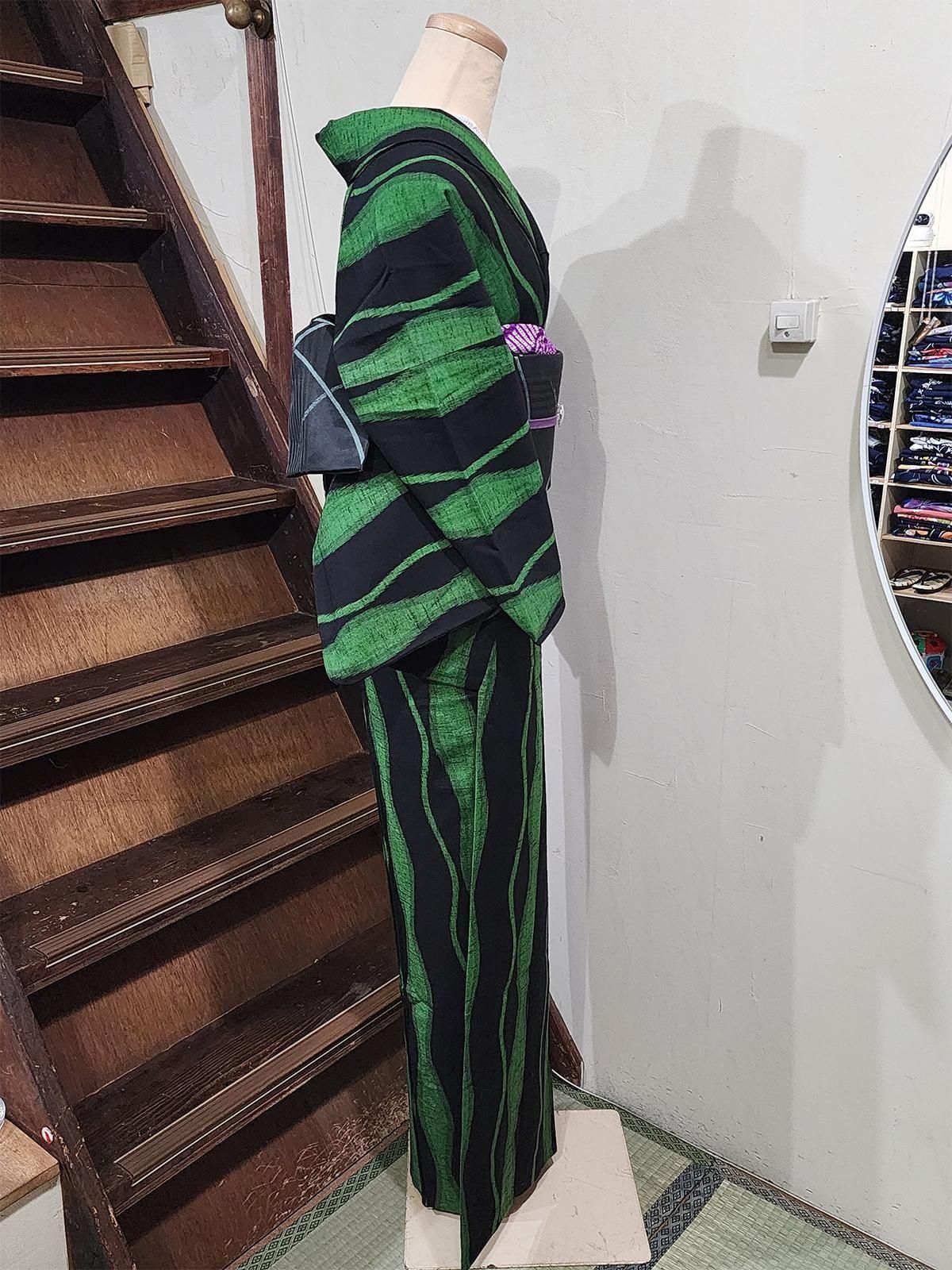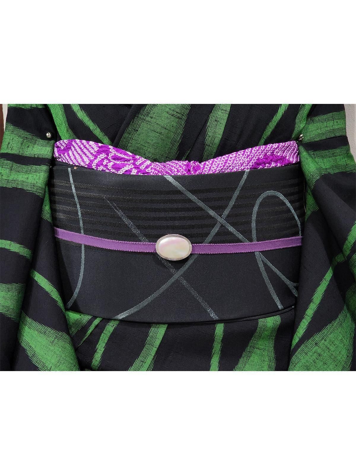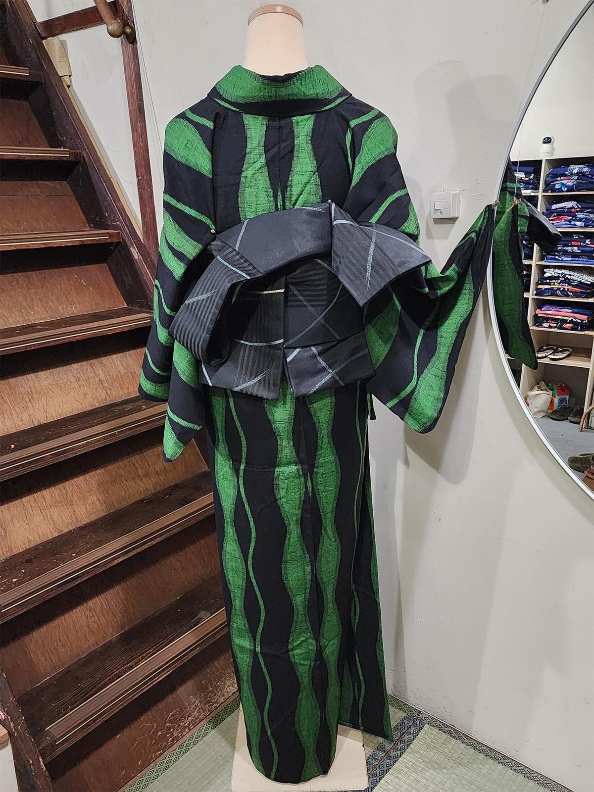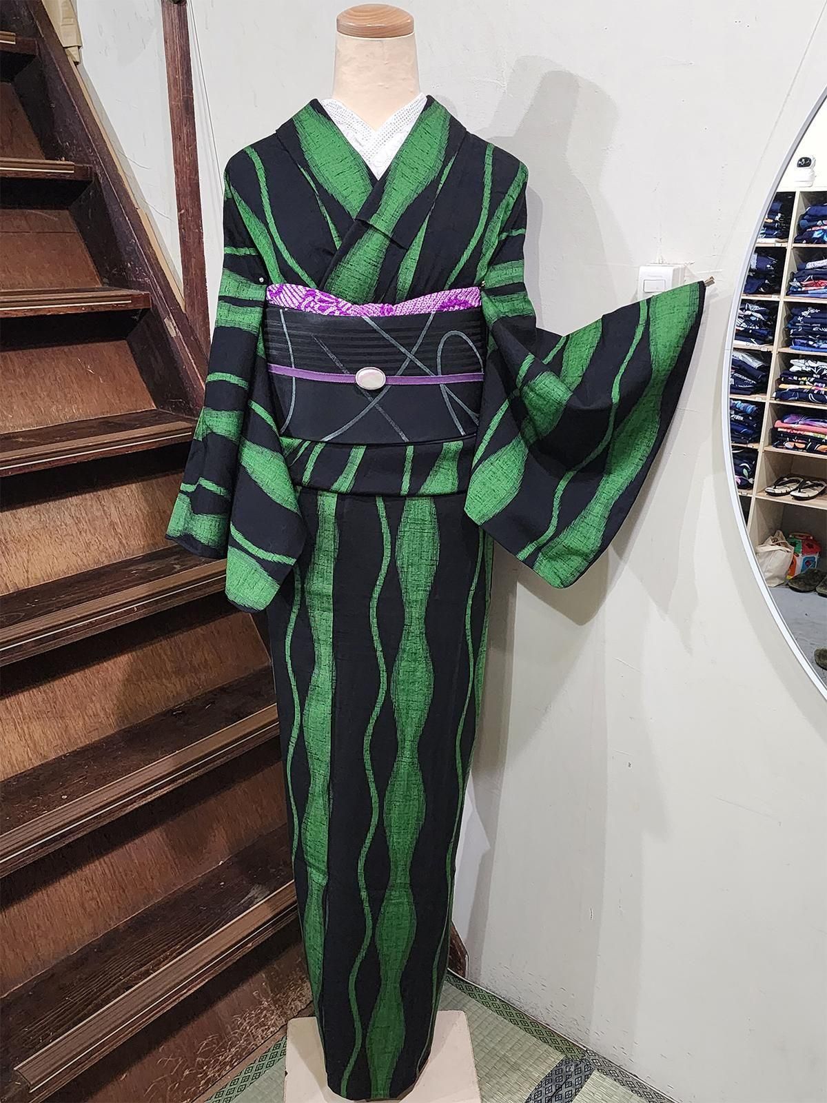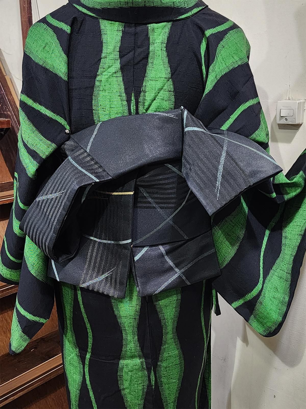 - コーデ提案: 黒・グレー系の着物に合わせてシャープに、グリーンや紫の小物でアクセントを。結び方によって柄の出方が異なり、いろいろなアレンジを楽しんでいただけます。