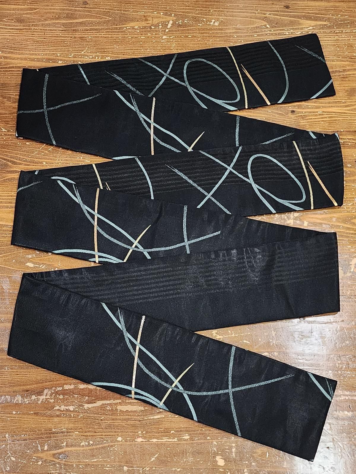 漆黒にメタリックな錆浅葱とゴールドの曲線が走る、モードな表情の正絹リファイン半幅帯