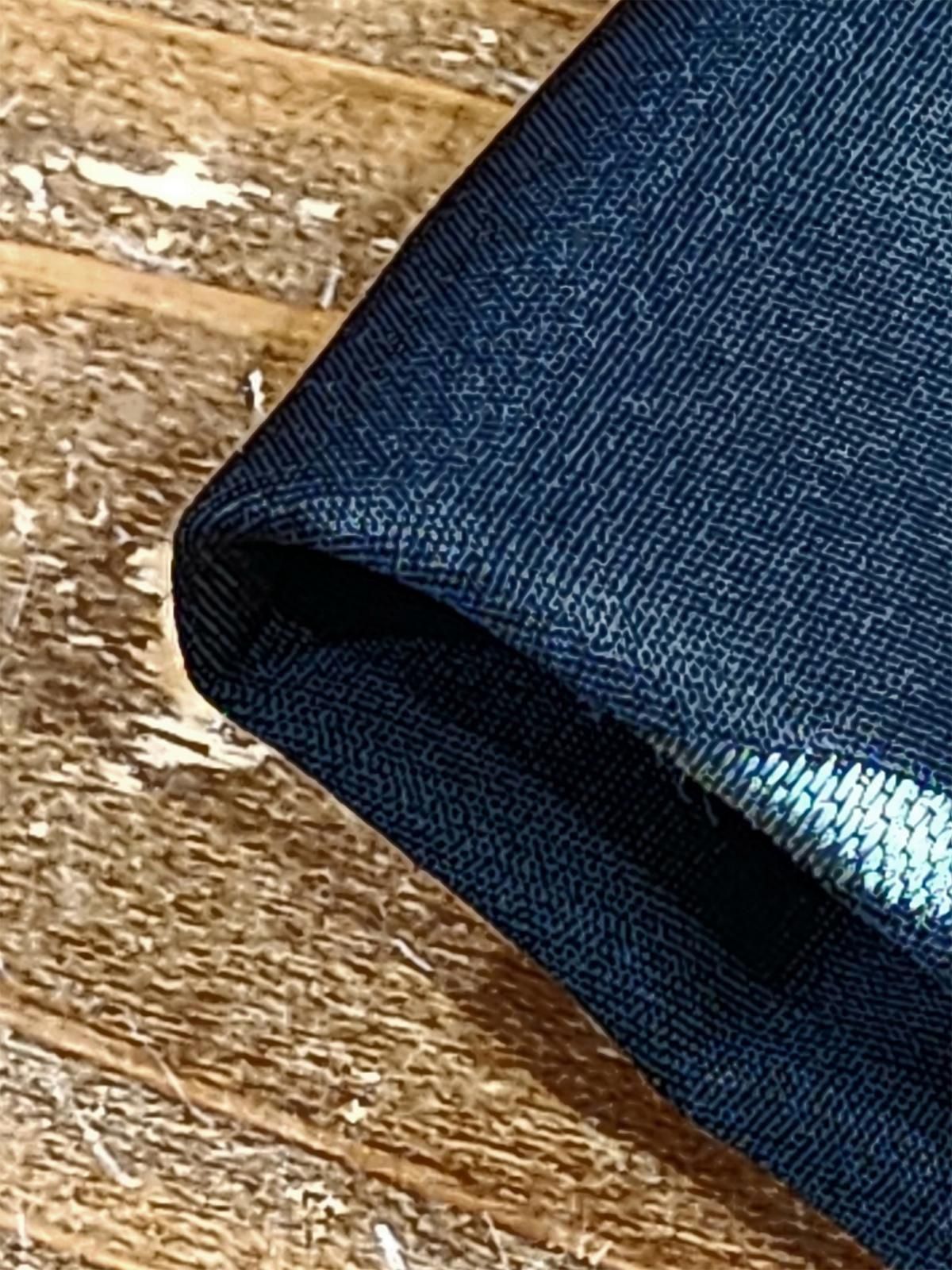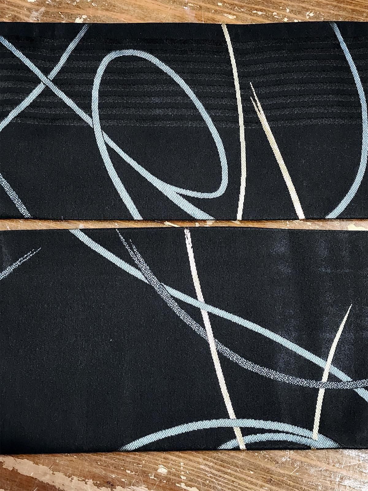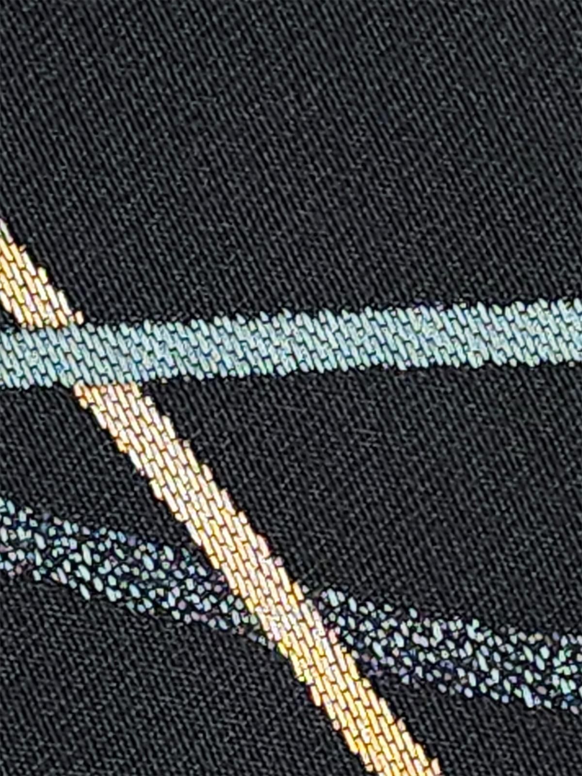 - デザイン: 深い黒地に、錆浅葱色のラインとメタリックな金のストロークが重なり合う抽象的な曲線模様。片面には織模様のストライプの陰影が浮かび上がり、リズミカルなアクセントを添えています。