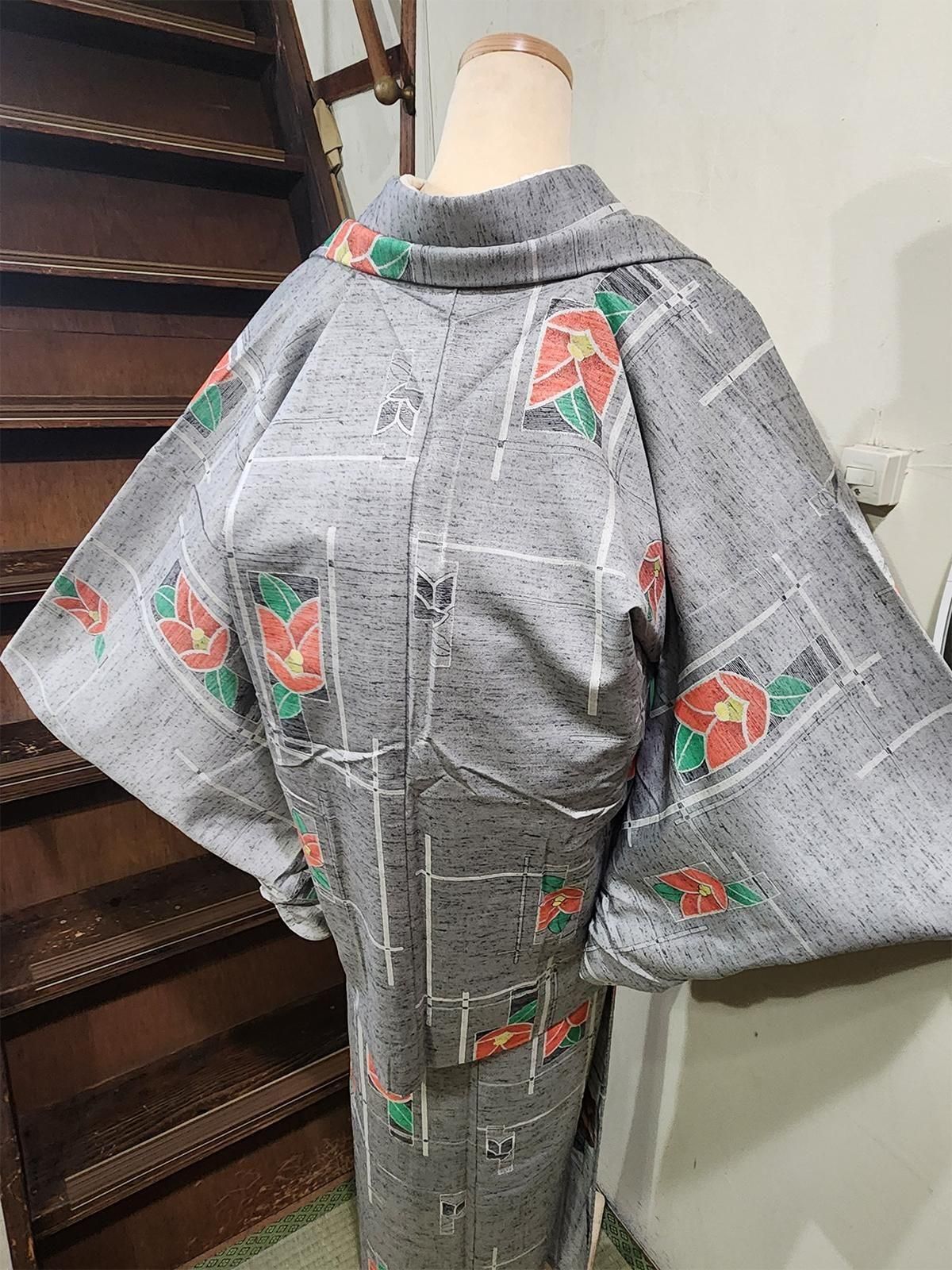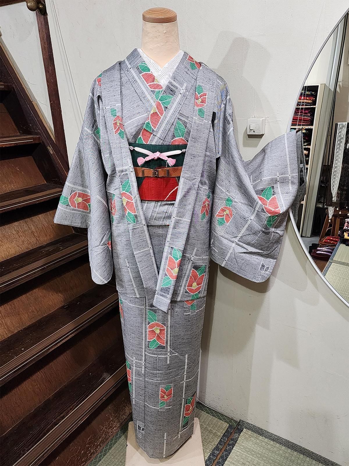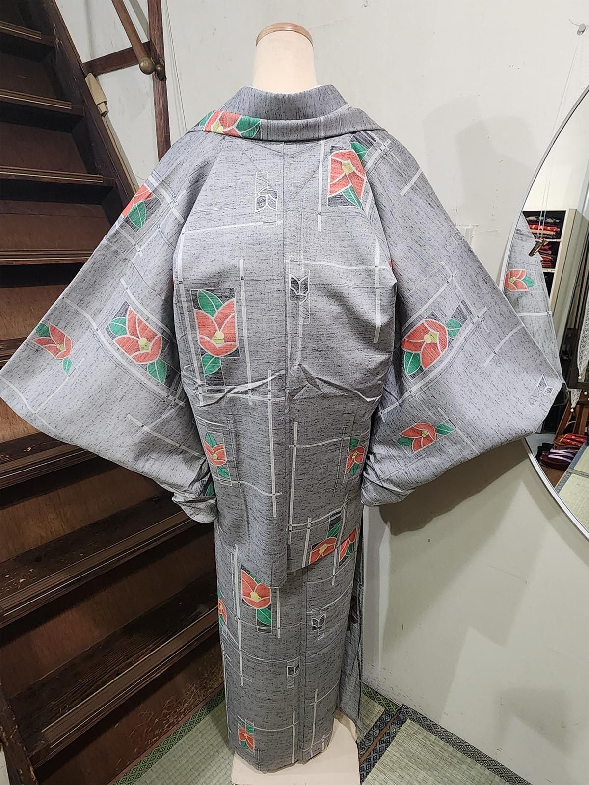 杢グレーにモダンな幾何学とがすっと交差し、ノスタルジックな椿の花があしらわれたシルクウールのアンサンブル(着物+羽織)