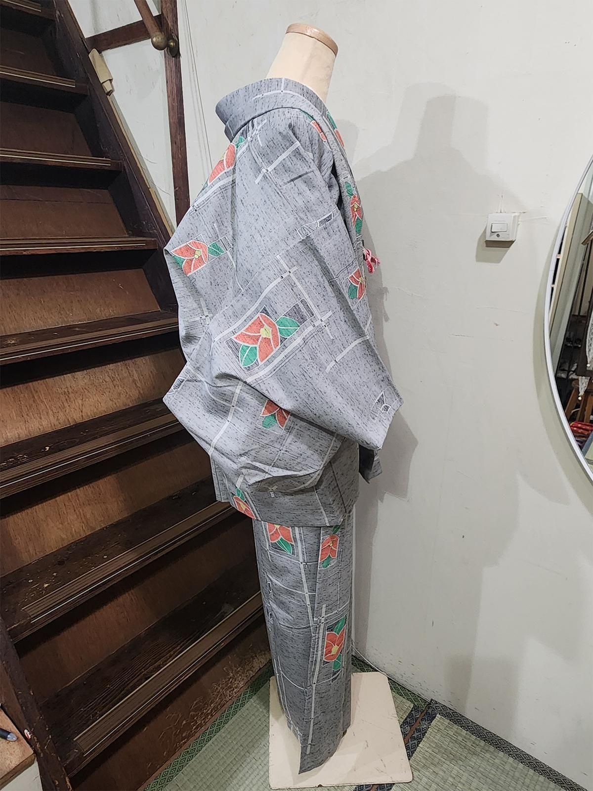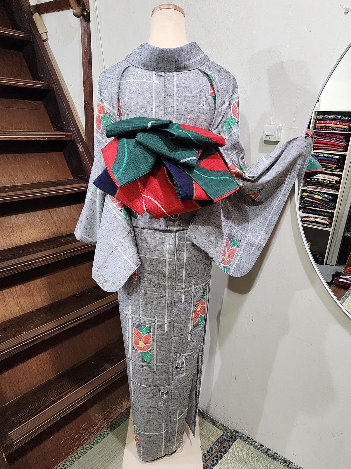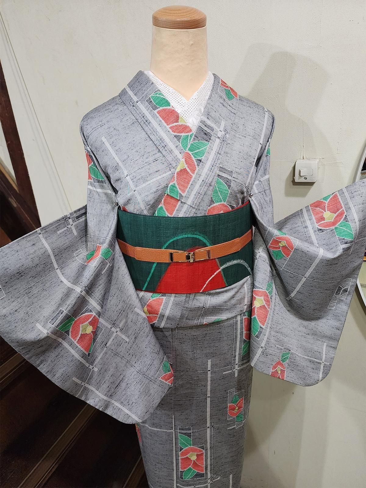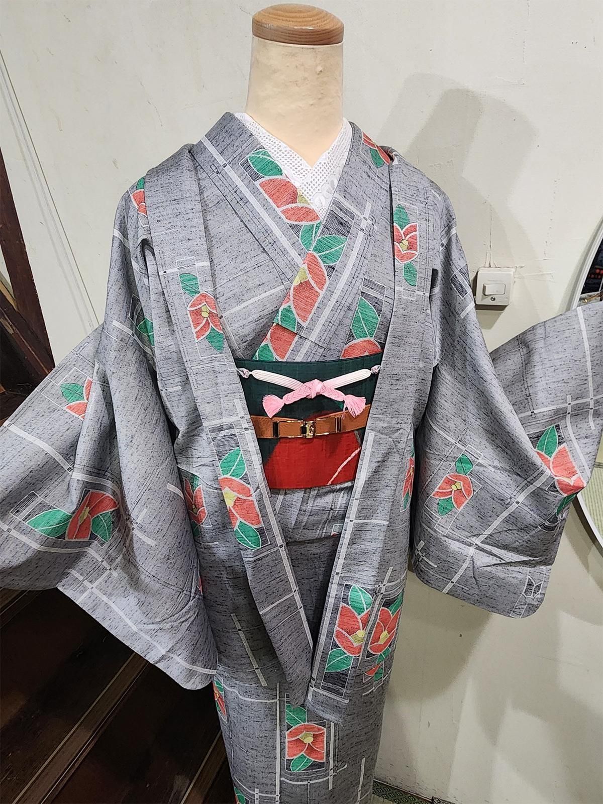 杢グレーにモダンな幾何学とがすっと交差し、ノスタルジックな椿の花があしらわれたシルクウールのアンサンブル(着物+羽織)
