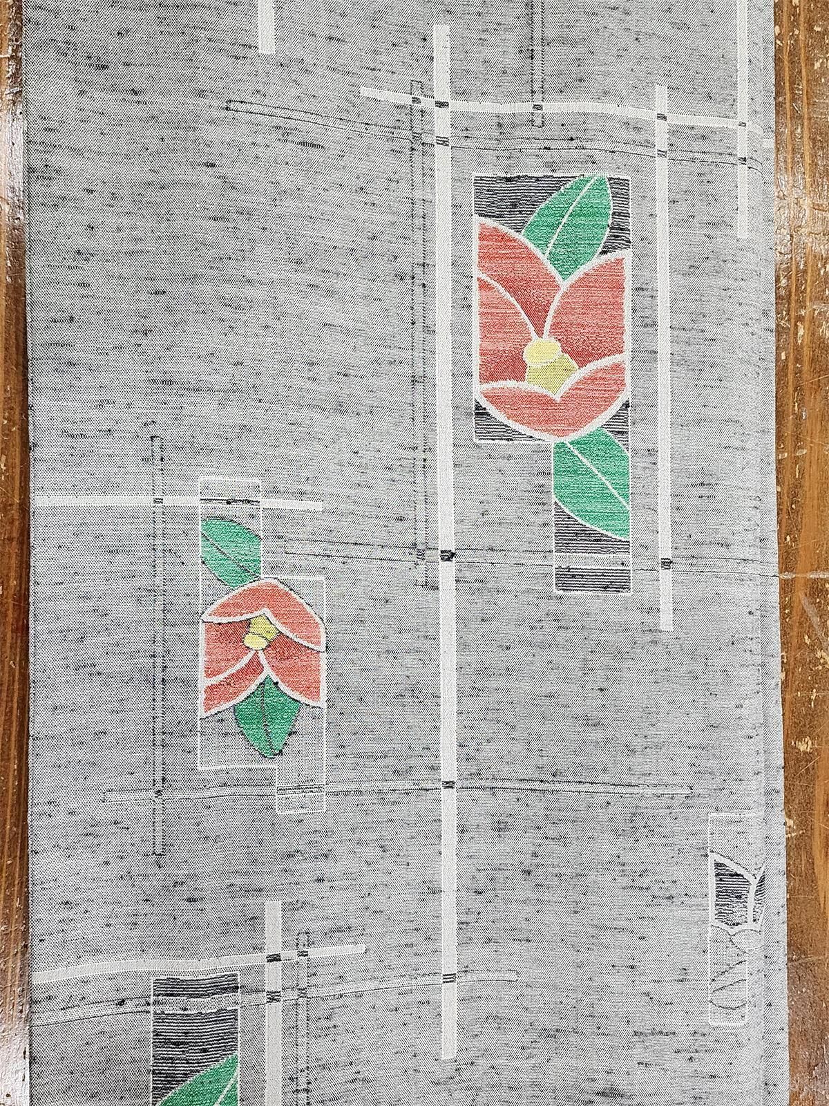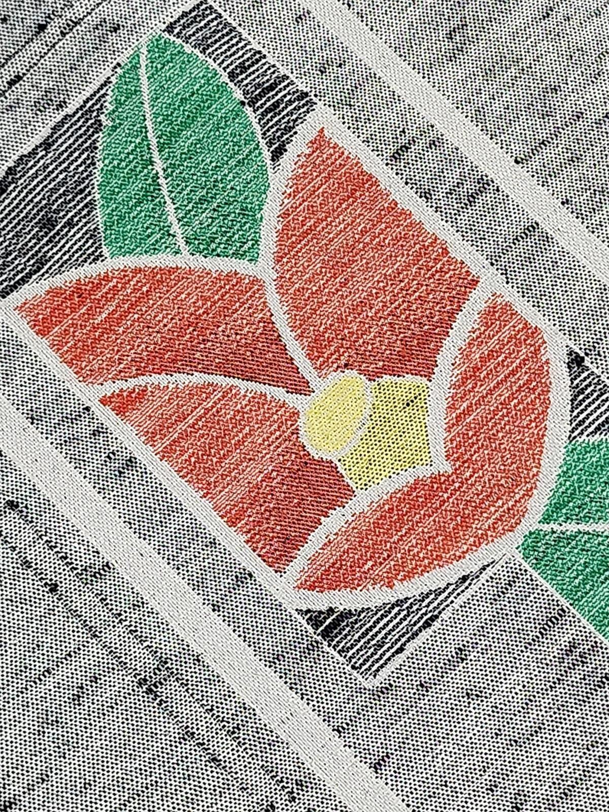 - デザイン: オフホワイトとブラックの糸が織りなす杢調のグレーの地に、リズミカルに交差する直線がつくりだすアートな幾何学パターンが織りだされ、愛らしい椿の花がタイルのように重ねられたトロとモダンが溶け合うデザイン。