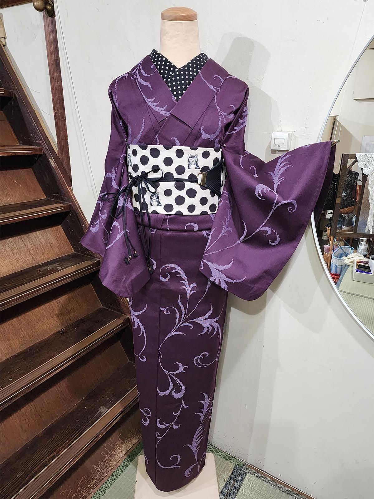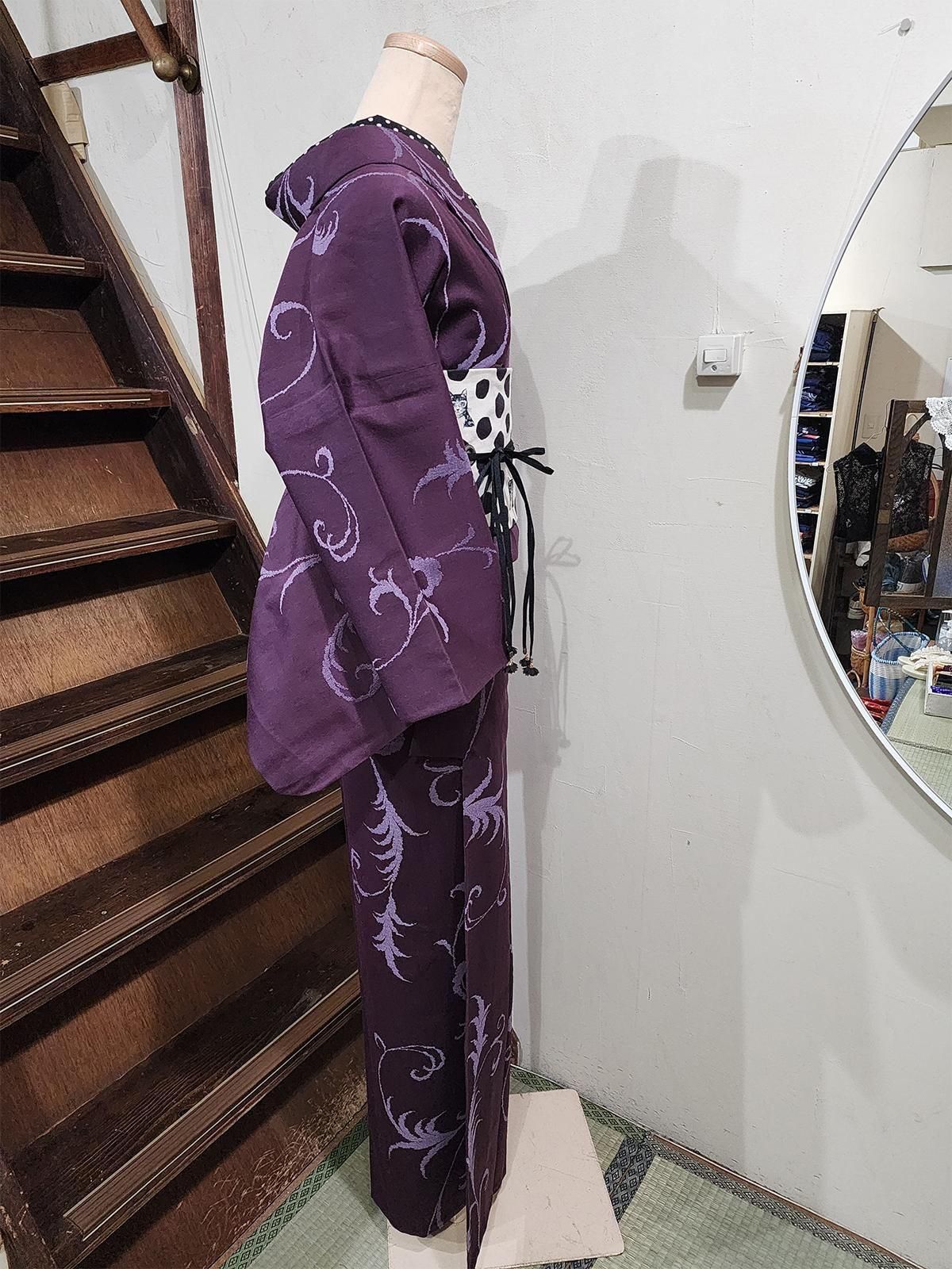 大人の洗練を感じるスモークがかったプラムパープルに、ビアズリーの装画のようなアラベスク模様が優美に浮かぶウール単着物