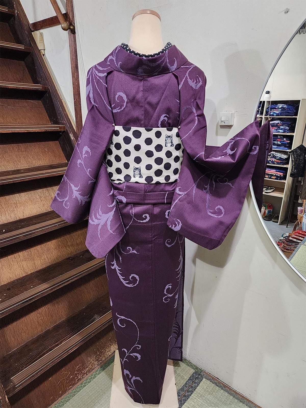 - コーデ提案: 黒やグレー、アイボリーの帯でシックに、ボルドーやオレンジの帯をアクセントにしてドラマチックに。グリーンやピンクの帯でさりげない個性を演出して。色数を抑えたデザインなので、華やかな柄や個性的な柄の帯もベストマッチ。シルバーやメタリックな小物で艶感を増しても素敵。