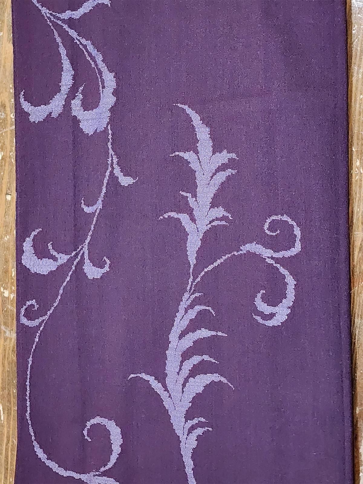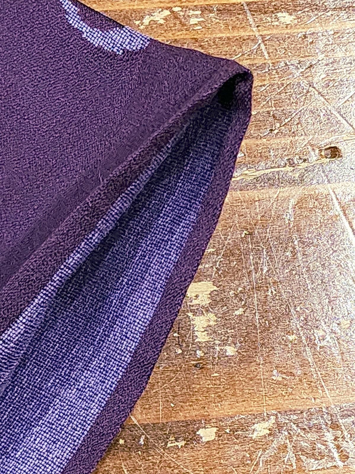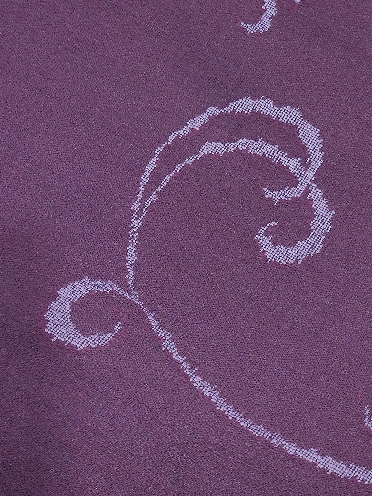- デザイン: 深いプラムパープルに、淡藤色のアラベスクが流れるように浮かぶモダンな織り柄。さりげないツヤ感があり、見る角度や光の加減で色や柄の表情が変わってドラマチックなムードを高めてくれます。ぐっと沈んだグレーっぽい色味に見えたり、紫の青みが強く見えたり、赤みが強く見えたりします。
