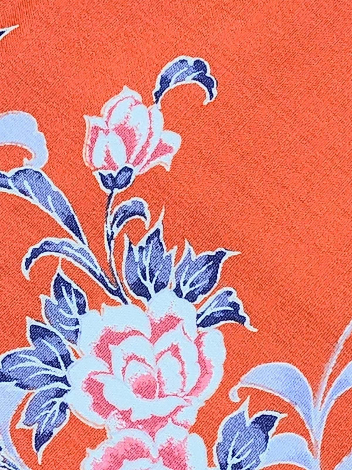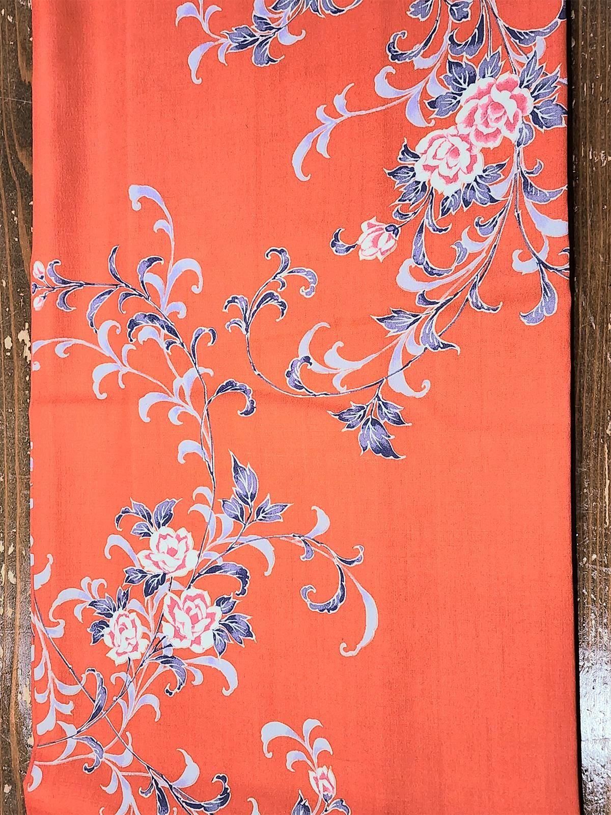 - デザイン: 鮮やかなルージュオレンジをベースに、流れるように描かれた流麗な薔薇のアラベスクがロマンチックな一枚。影のような濃淡で表現されたリーフアラベスクに、薔薇の花のアラベスクを重ねることで立体感と奥行きが生まれ、ジョルジュ・バルビエのイラストレーションのような装飾的で幻想的な世界を描き出しています。