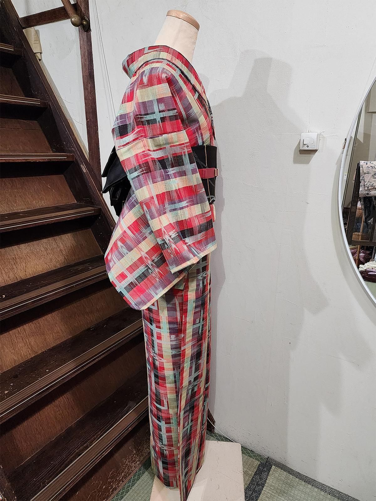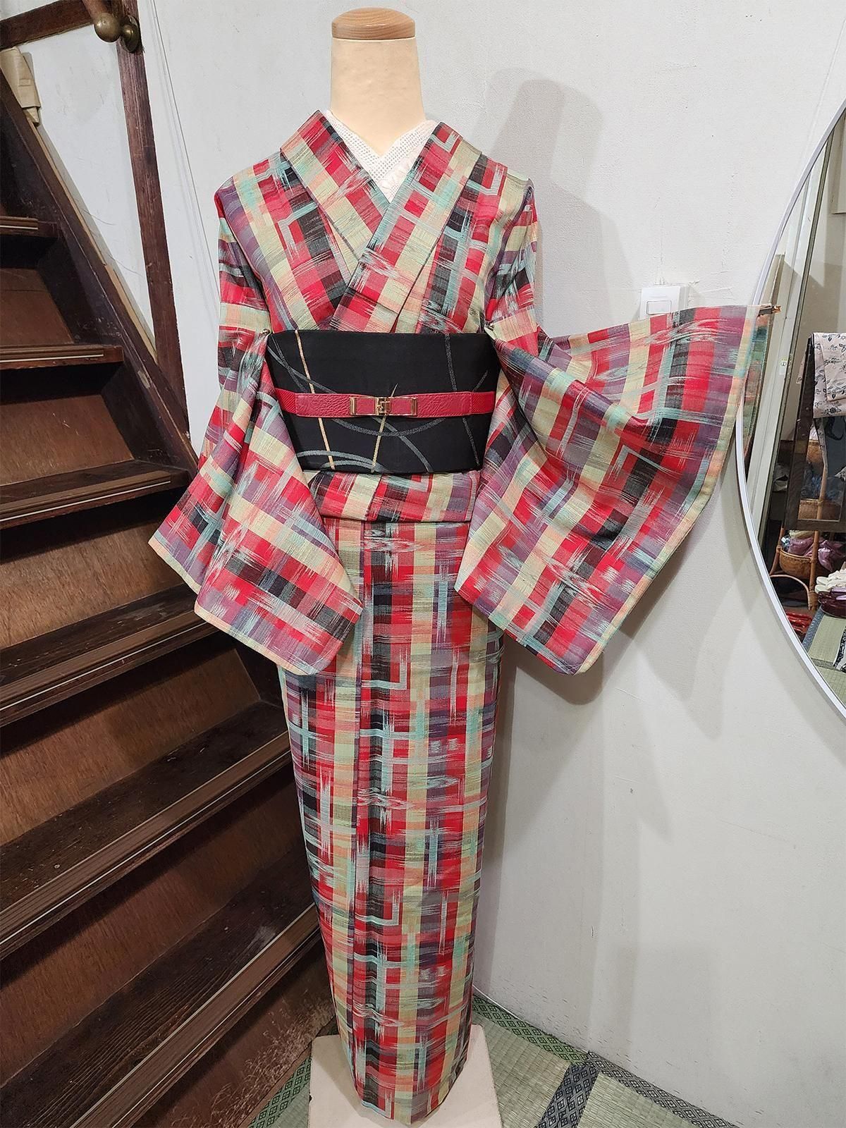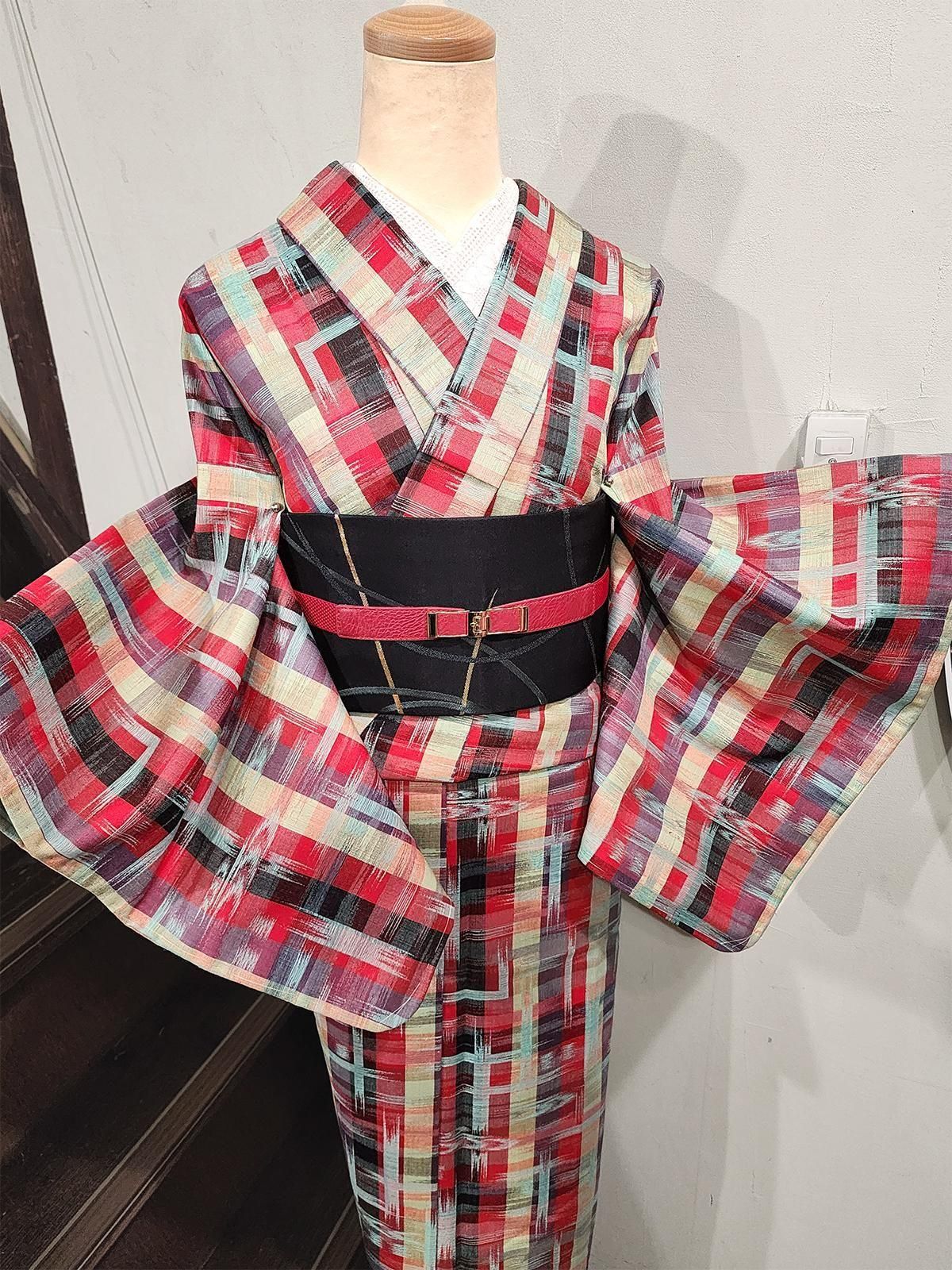 ルージュ×ミントブルー×チャコールの思いがけない色合わせがおしゃれ心をくすぐるブラッシュチェックのウール単着物