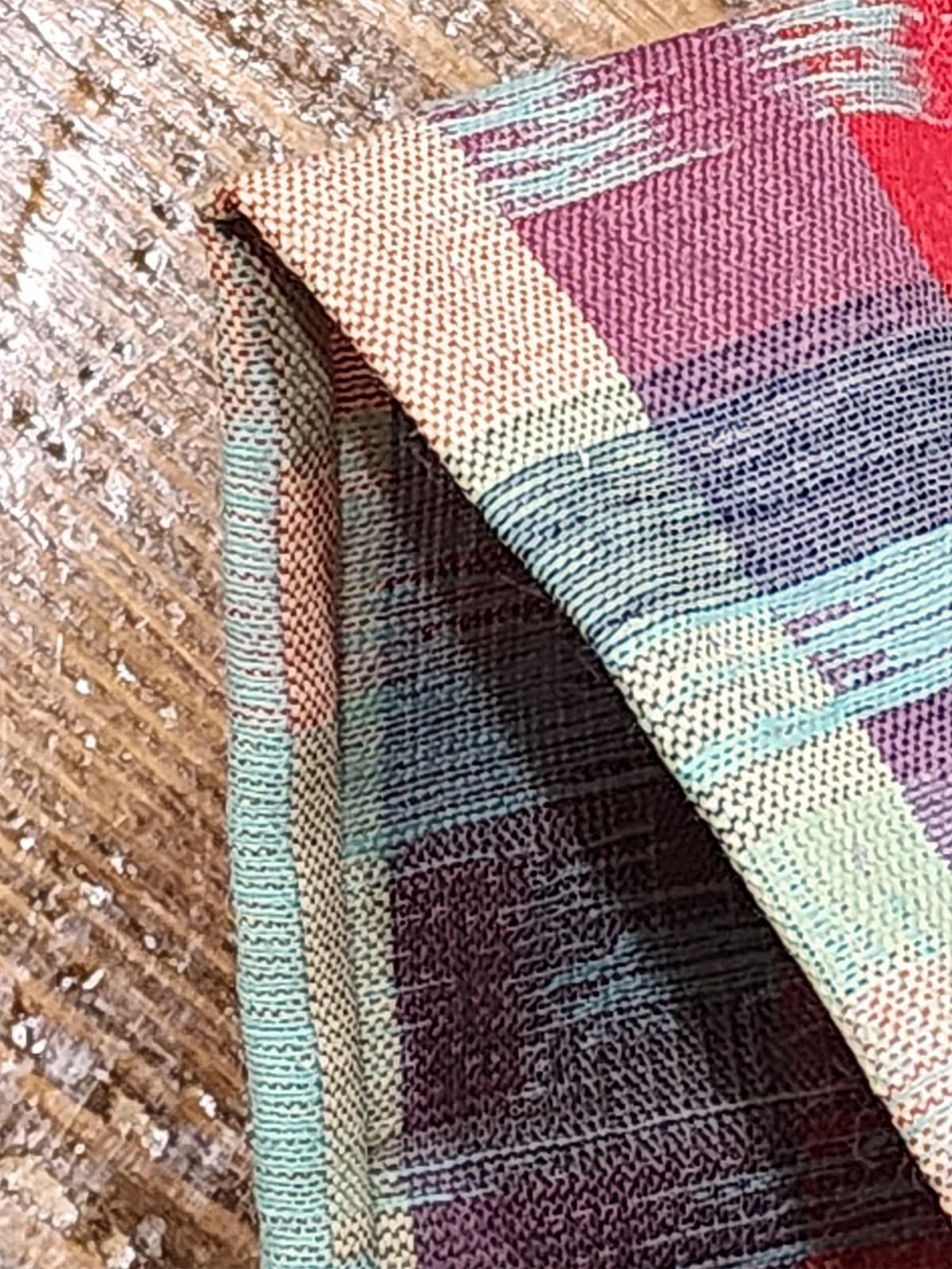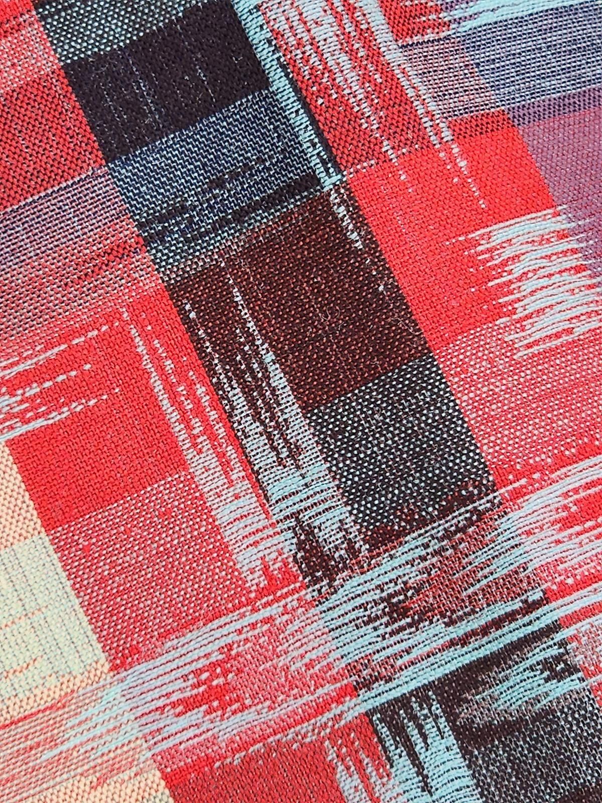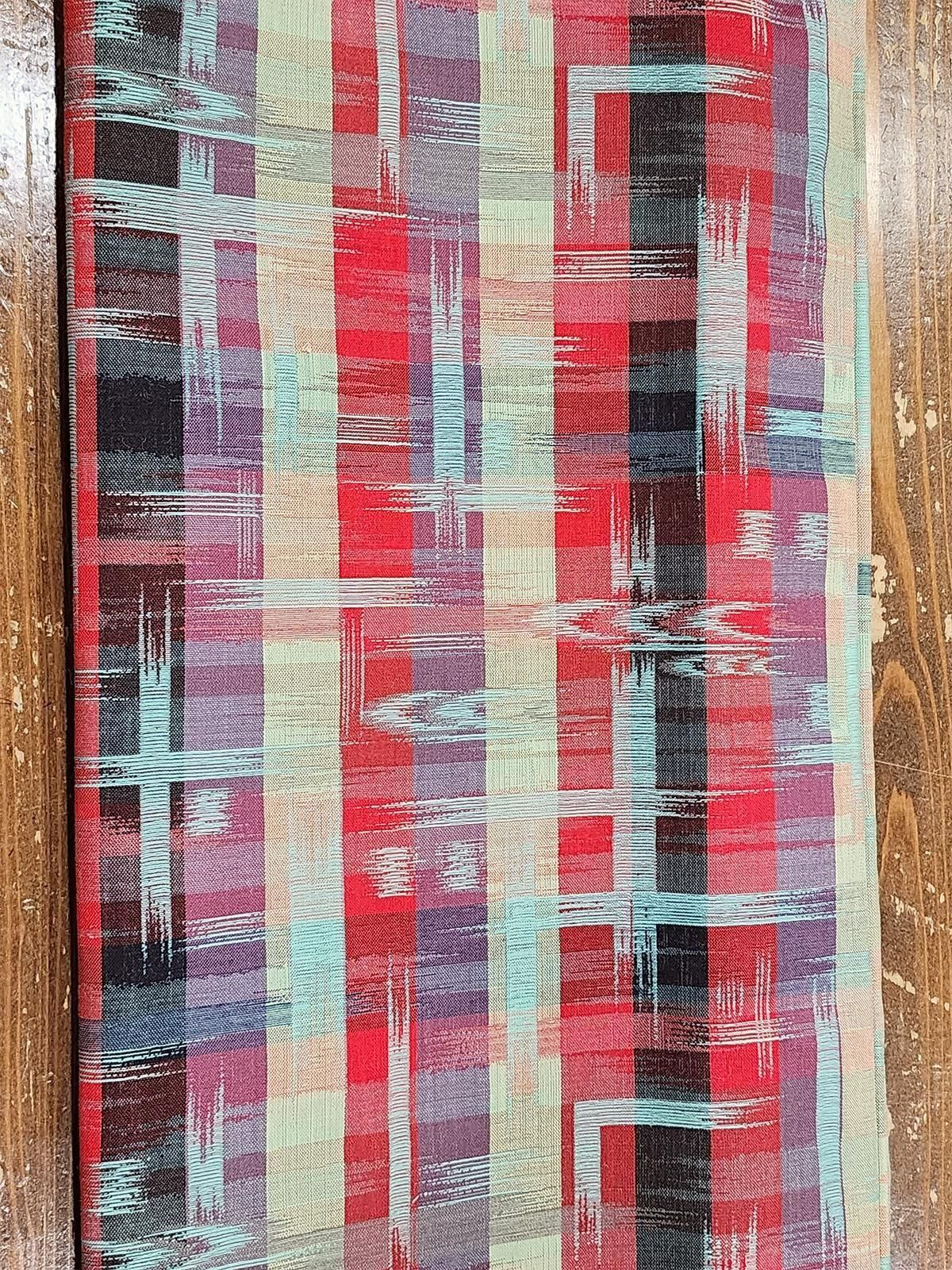 - デザイン: スカーレットルージュ、クリームイエロー、パープルグレー、チャコールの広幅ストライプに、ミントブルーの十字や霞の絣織り模様を重ねたグラフィカルなデザイン。