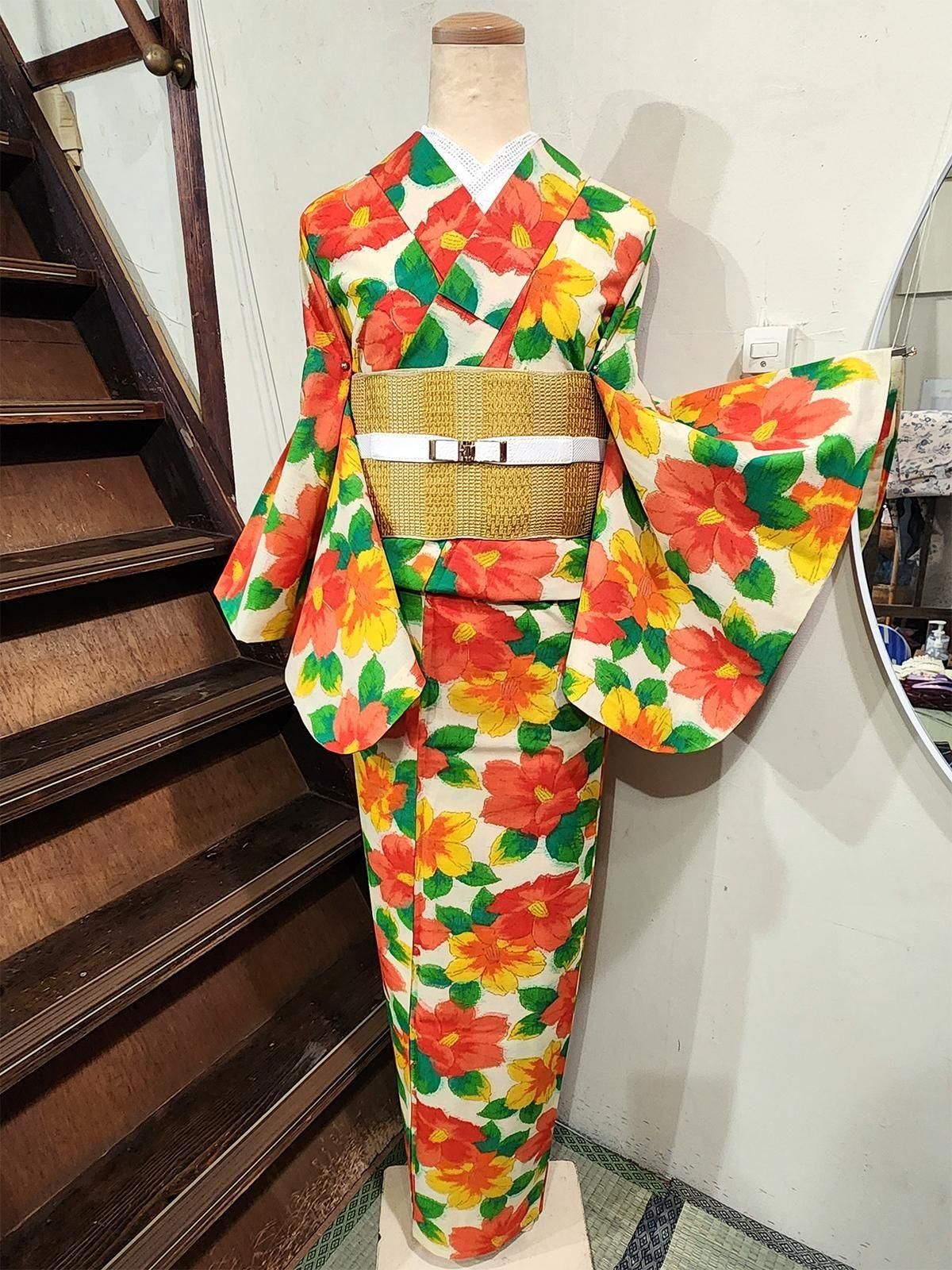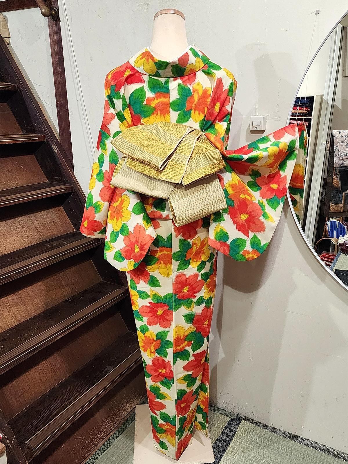 - コーデ提案: 着物の色から一色とった、ルージュやオレンジ、イエロー、グリーンの帯をあわせてポップかつまとまりよく。紫やブルー、ネイビーなどのディープカラーを効かせても素敵。水玉やボーダーなどのアートな幾何学模様の帯をあわせても遊び心がひきたちます。