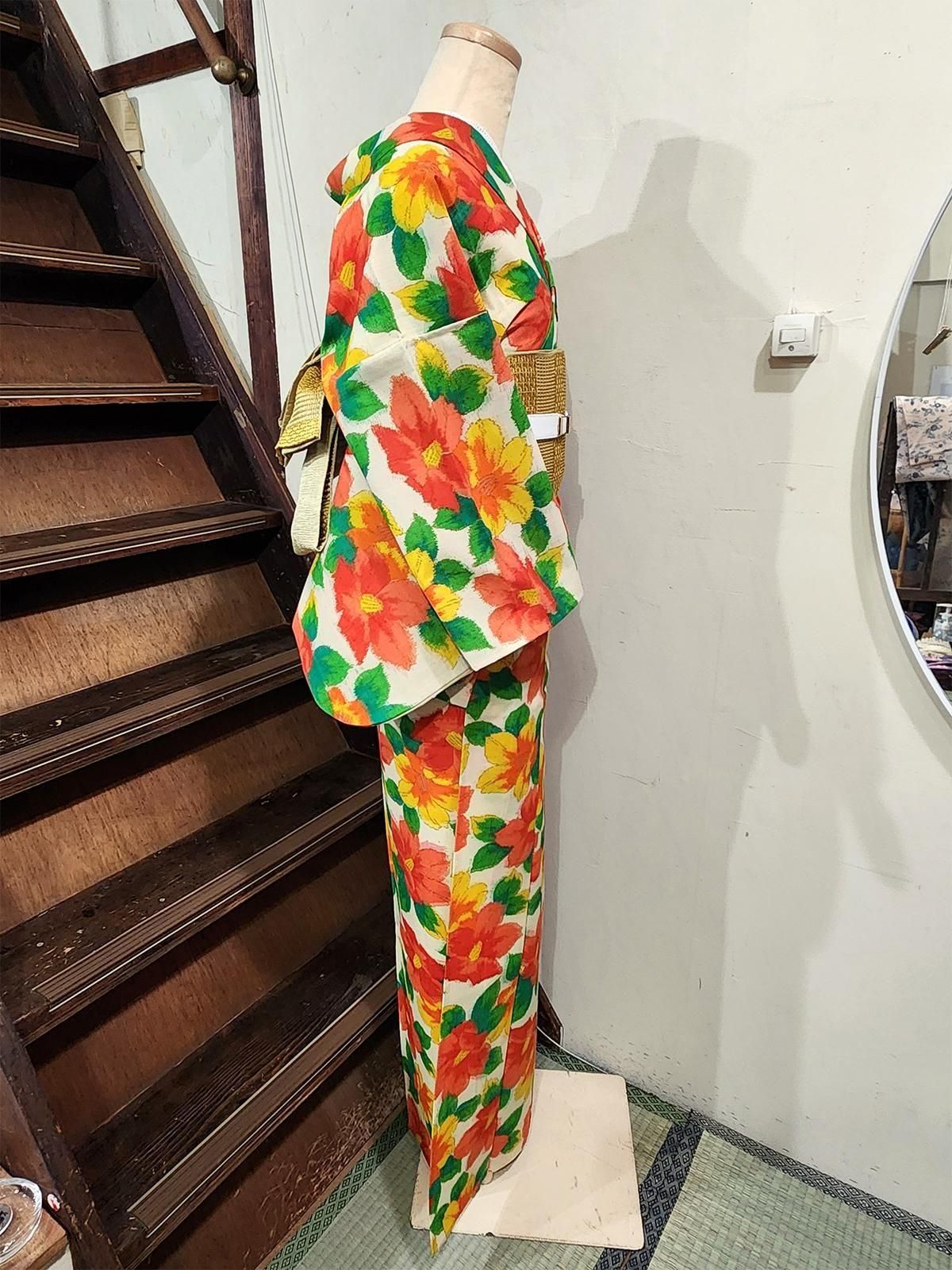 マリメッコを思わせる大胆なボタニカルデザインが視線をひきつける一枚。秋冬の景色にぱっと映えて、心まで華やぐウール単着物