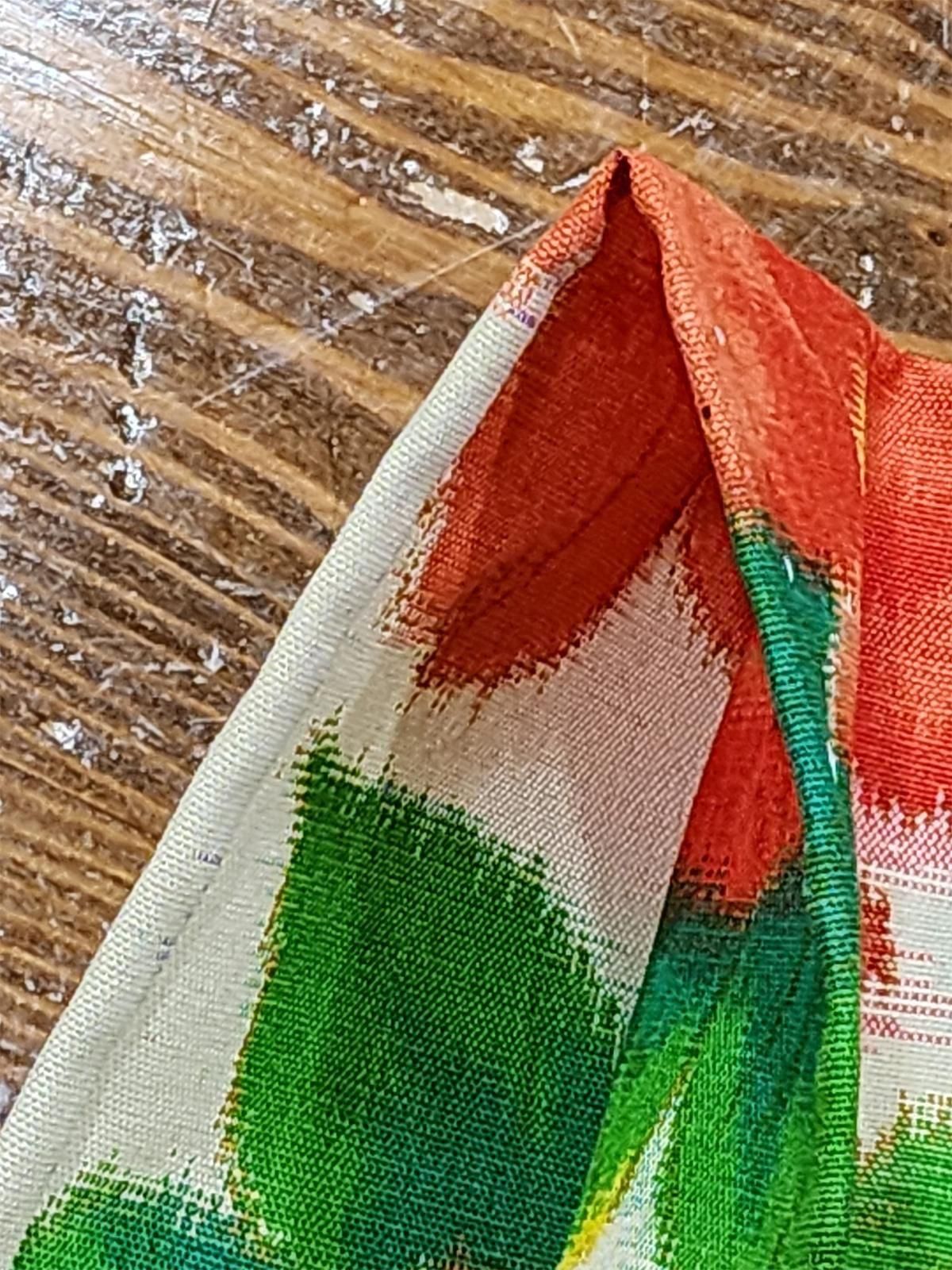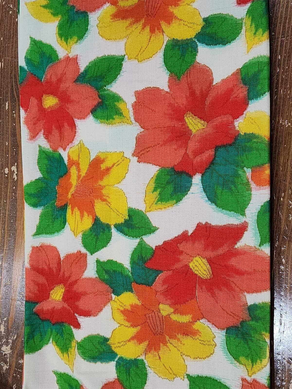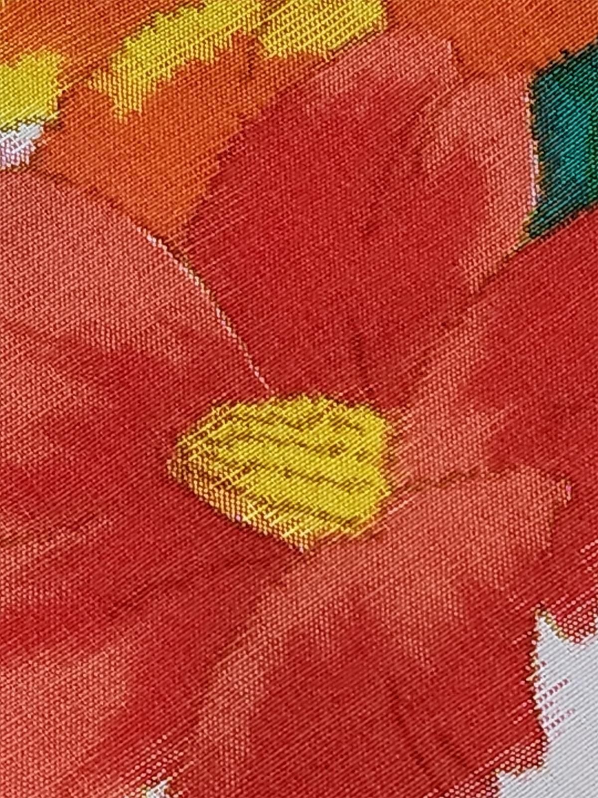 - デザイン: 柔らかなクリーム地をキャンバスに、椿のような大輪の花がリズミカルに咲く華やかなデザイン。イエロー、オレンジルージュの花にグリーンの葉が爽やかなアクセントになった色彩は鮮やかな存在感がありながら調和のとれた品の良さがあり、まるで北欧ファブリックのよう。絵になる存在感と、洗練が同居する完成度の高いデザインです。