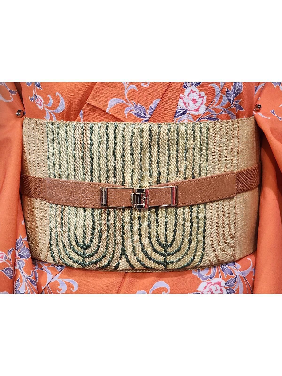 - 印象:落ち着いた中にほのかな華やぎ香るベージュのベースカラーが大人の上品さを引き出し、柄色のグリーンが木陰のようにやさしく爽やかなムードを演出します。幅広い色柄の着物にマッチして、コーディネートに軽やかで洗練されたおしゃれ感をプラスしてくれます。