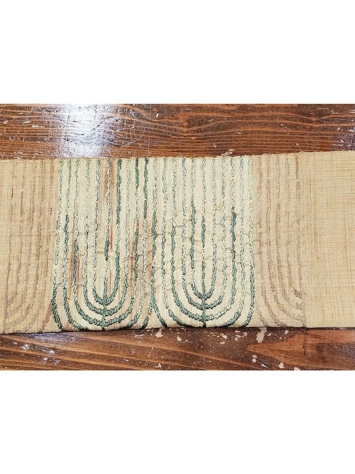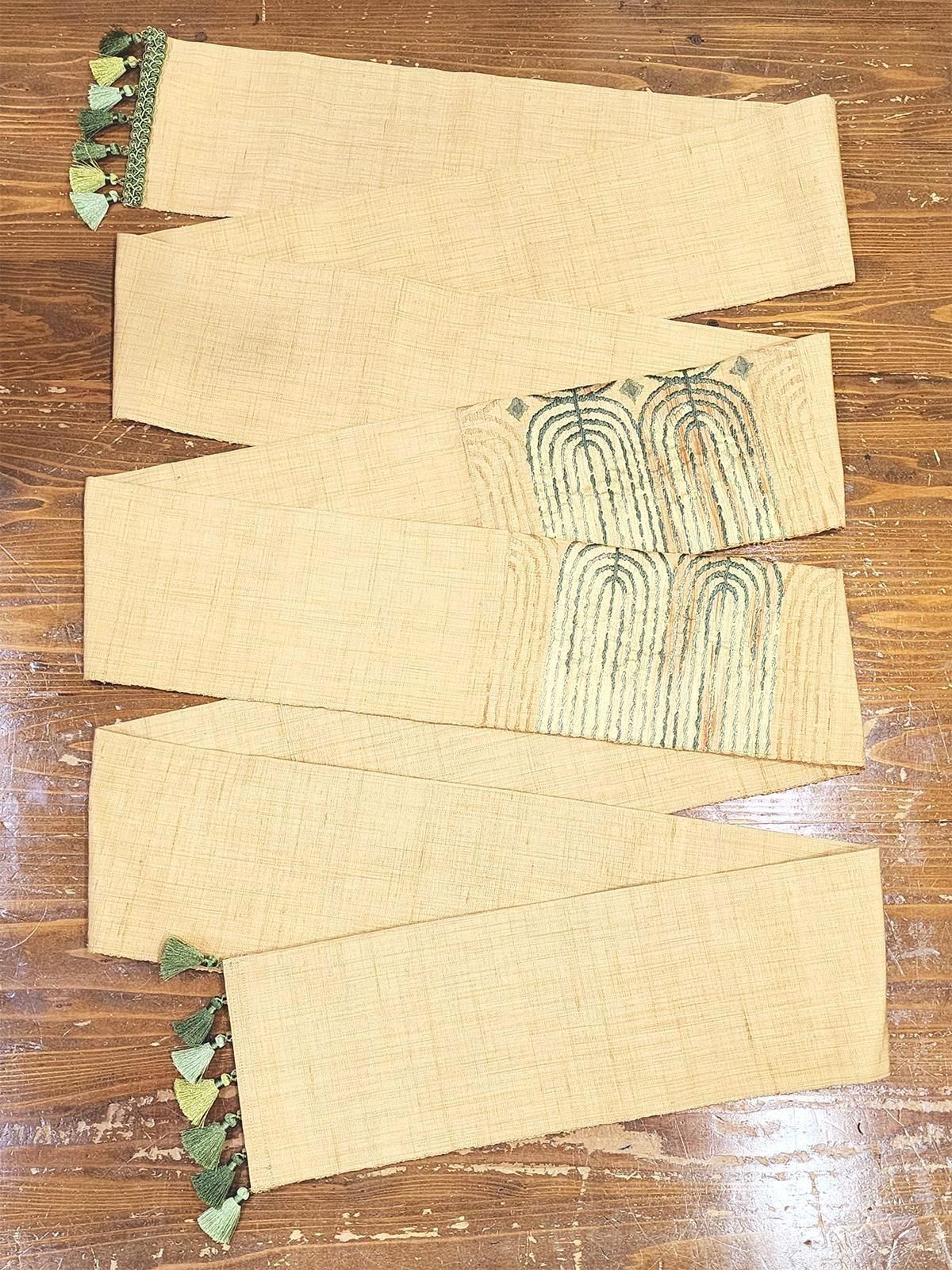 ベージュにアールデコ・アートのようなグリーンの装飾模様と、ゆらりと揺れるタッセル飾りが爽やかに映える正絹紬のロングサイズ・リファイン半幅帯