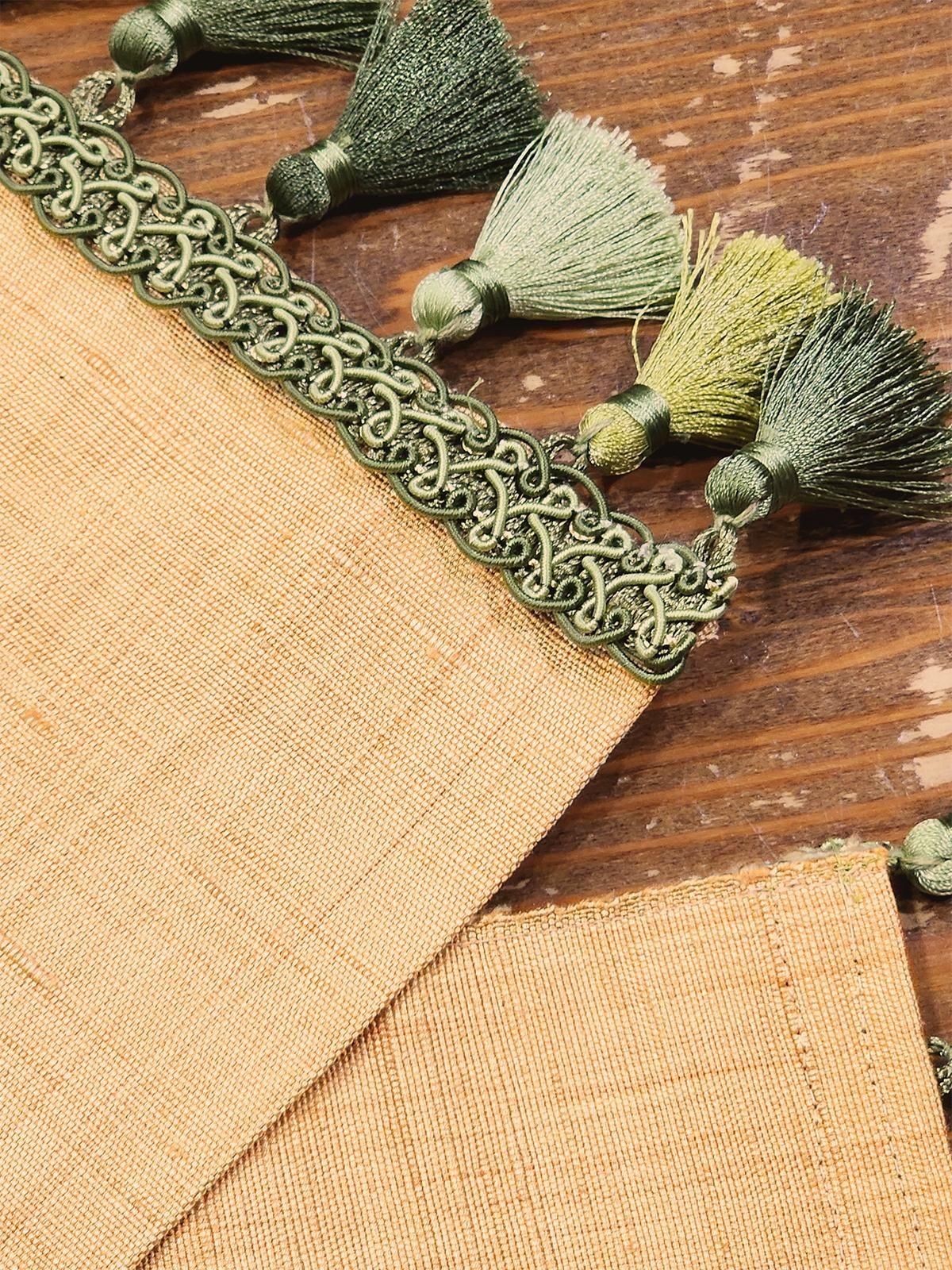 - デザイン: 華やぎのあるオレンジがかったベージュ地に、草木染を思わせる自然なグリーンのカラーで織りだされた、アールデコ・アートのような幾何学的で優美な装飾模様がアクセントになったシンプルでいて、さりげない存在感のある一本です。節のある織地と、杢調の色合いが心地よく、モダンでアートなムードの中にフォークロアなエッセンスがプラスされています。タッセルのトリムが身体の動きによってゆらりと揺れ、コーディネートのアクセントになってくれます。