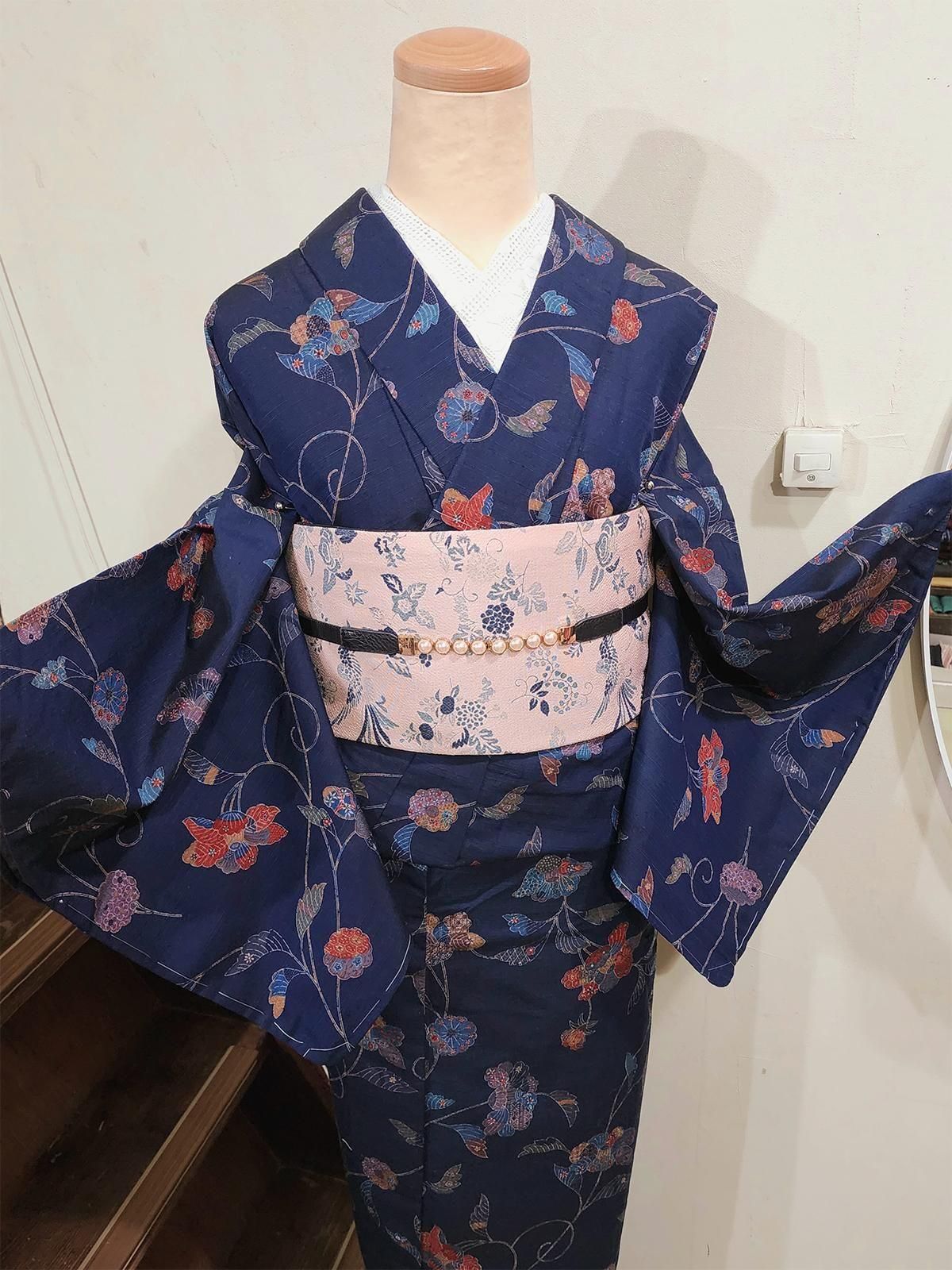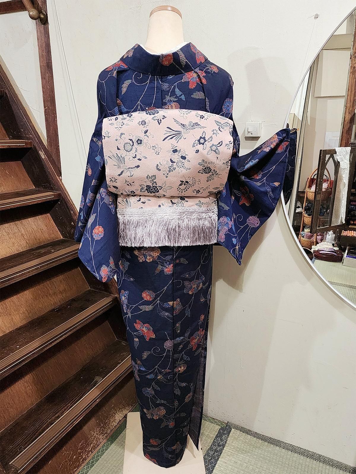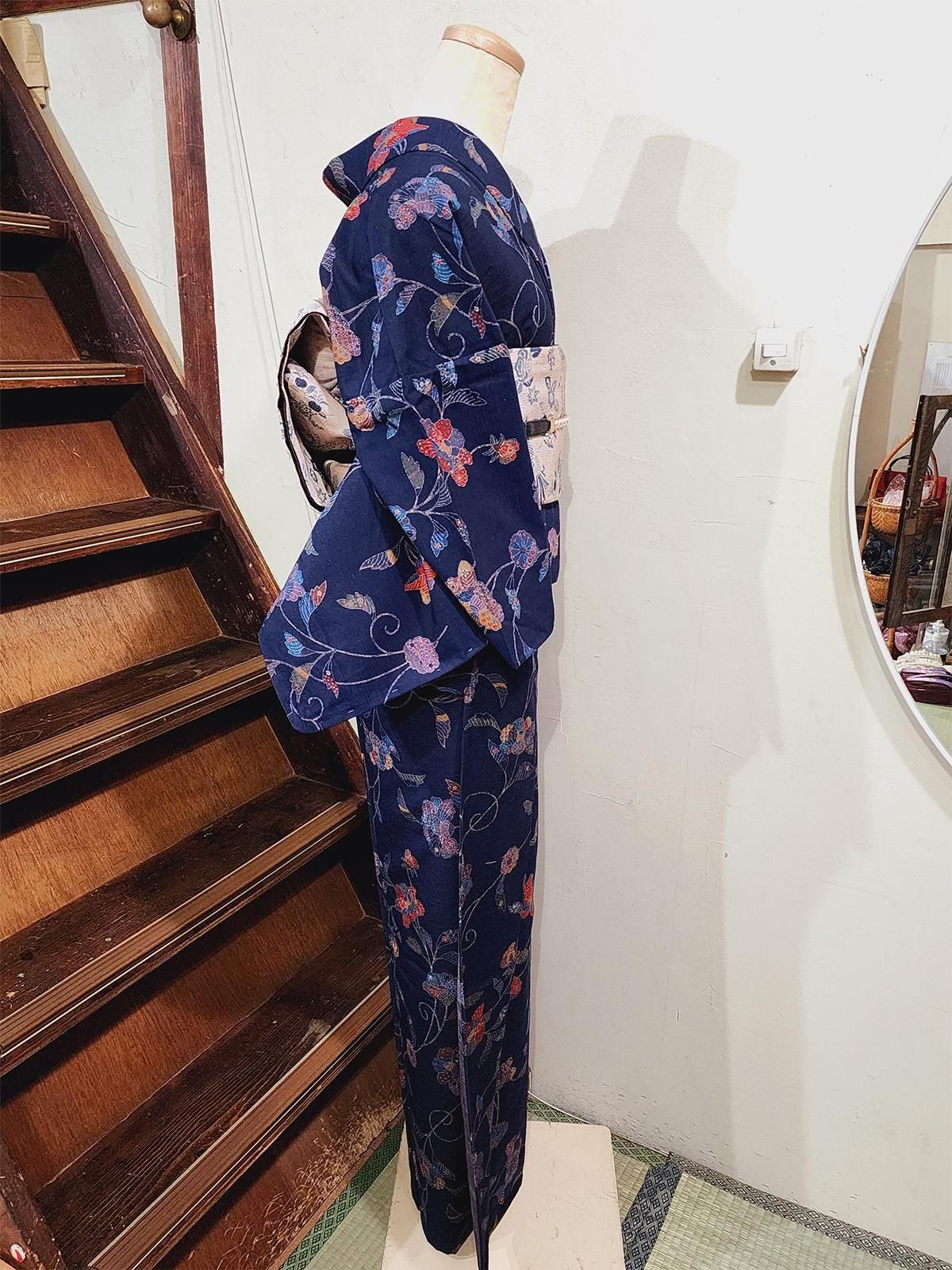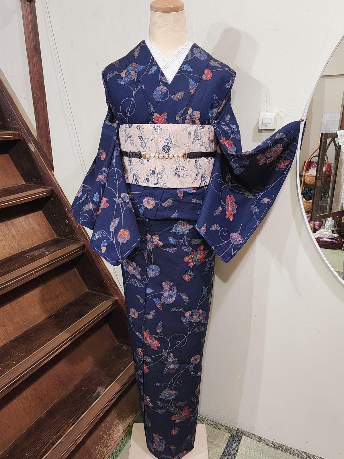 ネイビーに和更紗のような椿アラベスク美しいウール紬単着物 販売価格 14,800円(税込16,280円) 在庫数 在庫数:1 購入数 特定商取引法に基づく表記 (返品など) ダークネイビーに椿のアラベスクが優美に浮かぶウール紬単着物 デザイン: 深いネイビーを背景に、流れるようなアラベスク調の曲線で描かれた椿の花枝にうっとり。花や葉には更紗を思わせる繊細な装飾がほどこされた、和と洋が調和する華やかな意匠です。 印象: 落ち着いた色調の中に、遊び心ある更紗調のアラベスク文様が映え、知的で洗練された大人の遊び心を演出してくれます。 素材・着用感: ややざらっとした手触りの、紬のような節のでた、わずかにマットなツヤ感のあるしなやかな中厚のウール地です。もしかすると、ウールに若干化繊とシルクが混紡されているかもしれません。 季節・シーン: 秋から春までスリーシーズン活躍。カジュアル向きのお着物ですが、さりげないマットなツヤ感がきちんと感をプラスしてくれています。街歩きや観劇、美術館めぐりやカフェでのひとときなどの日常のお出かけから、ちょっとした食事会まで幅広く活躍。 コーデ提案: 緋色や芥子色、若草緑、青、鼠藤色など和の落ち着きを感じる様々な色が使われているので、幅広いカラーの帯にマッチ。正倉院文様や更紗柄の帯、バティックの帯をあわせてフォークロアな遊び心を楽しんでも素敵ですし、縞や格子などの幾何学模様の帯をあわせて、優雅な曲線ときりりとした直線のコントラストを効かせてもGOOD。 着物の種類:紬調シルクウール(ウール・絹・化繊混)/ 単仕立て / 染模様 ウール着物の魅力については下記の特集ページでもご紹介しています。ぜひご覧ください。 姉妹屋イチオシアイテム!ウール着物のススメ 仕立て: エリはバチ衿で手縫いです。※手縫いかどうかについての判断は、スソまわりとソデまわり、ソデ付け、脇線の縫い目で確認しております。それ以外の部分ミシン縫いの場合は見逃しがあることがございますので、ご了承ください。 サイズ(単位:cm) 身丈171cm 裄丈65cm 袖丈49cm 前幅23cm 後幅30.5cm 目安:身長 166cm〜176cm 前後の方向け トール丈 体型により個人差あり 着物サイズについて サイズなどのご相談はLINEでお気軽に! 発送日: 5営業日以内に発送いたします。 丈について: 肩山から裾までの長さです。 裄について: 裄の項目で、裄出しが可能な場合は 「(縫代◯cm)」 と表記しています。※縫代の記載がない商品は、裄出しの余裕がない、または袷仕立てのため判別できないものです。 実測サイズ: 平置きでの採寸のため、多少の誤差が生じる場合があります。 状態 写真に写らない若干の小汚れや小キズ、うっすらとしたヤケ、アクやクスミがありますが、昔のお着物に慣れた方であれば十分お召しになっていただけるかと思います。 検品にはできるだけ注意を払い、シミ・汚れ等を記載しておりますが、微小の汚れ等につきましては見落としがある場合もあります。ユーズド品であることにご理解のうえご購入をお願いいたします。 胴裏につきましては、ユーズド・アンティークの着物はホシやシミが生じているものが大半のため、状態が軽度のものにつきましては記載を省かせていただいております。 当店で取り扱いしている着物の状態については、「姉妹屋について」のページの「着物の状態について」をご参照ください。 その他注意事項 商品は、『着物または浴衣』のみになります。写真のその他のアイテムは別売りまたは撮影用の参考商品です。 写真につきましては、実際の商品に近くなるよう努めておりますが、モニターの違いや光のあたり具合により、色や雰囲気が実物とやや異なる場合がございます。あらかじめご了承ください。 この商品について問い合わせる この商品を友達に教える 買い物を続ける ツイート この商品をログピでつぶやく Yahoo!ブックマークに登録する はてなブックマークに登録する