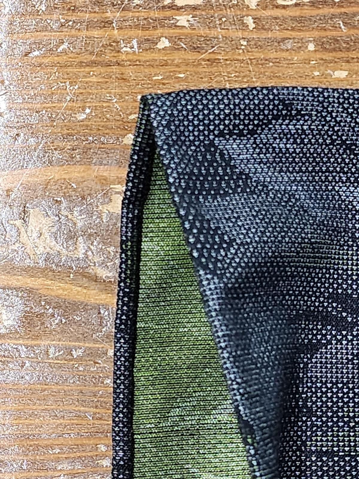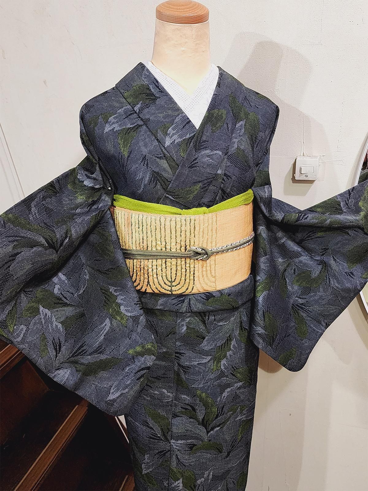 落ち着いたグレートーン✕ハーバルグリーンのモリスのファブリックのようなリーフモチーフのが美しいシルクウール単着物