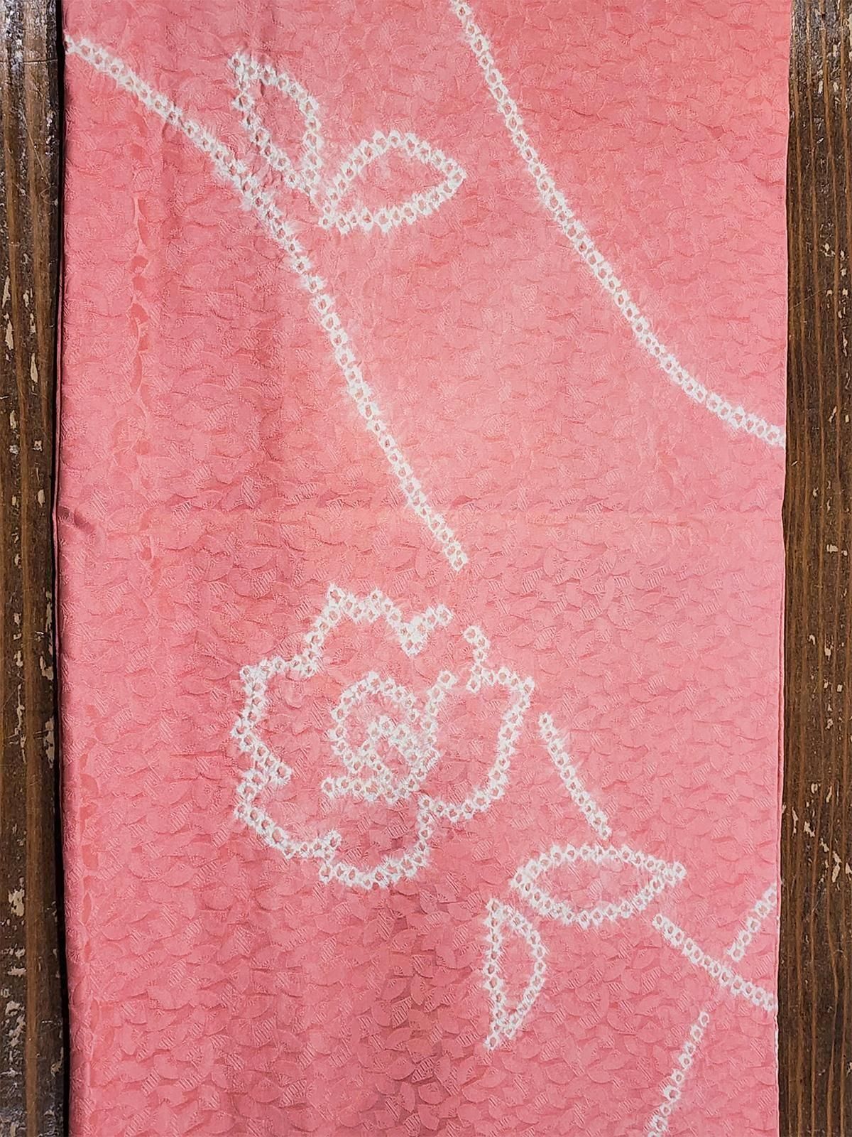 繊細な地紋が光をまとうコーラルピンクに、ふんわりと咲く薔薇の花がロマンチックな正絹本絞りの袷着物