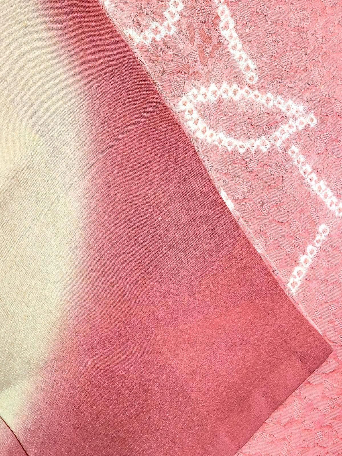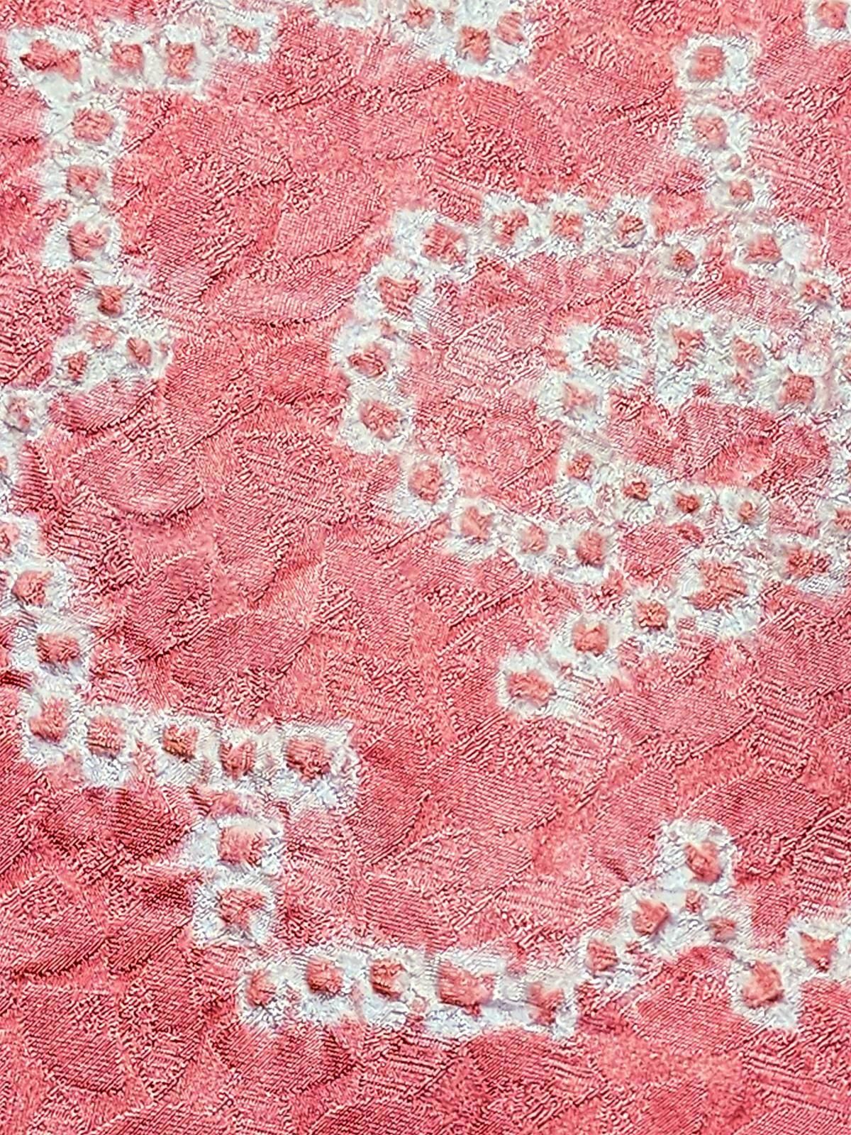 - デザイン: 繊細な扇の地紋が一面に浮かぶ、こっくりとした深みと、つややかな光沢のあるコーラルピンクに、鹿の子の本絞りで描きだされた薔薇の花が可憐に咲くデザイン。流れるようなラインが全体にリズミカルな動きをプラスします。