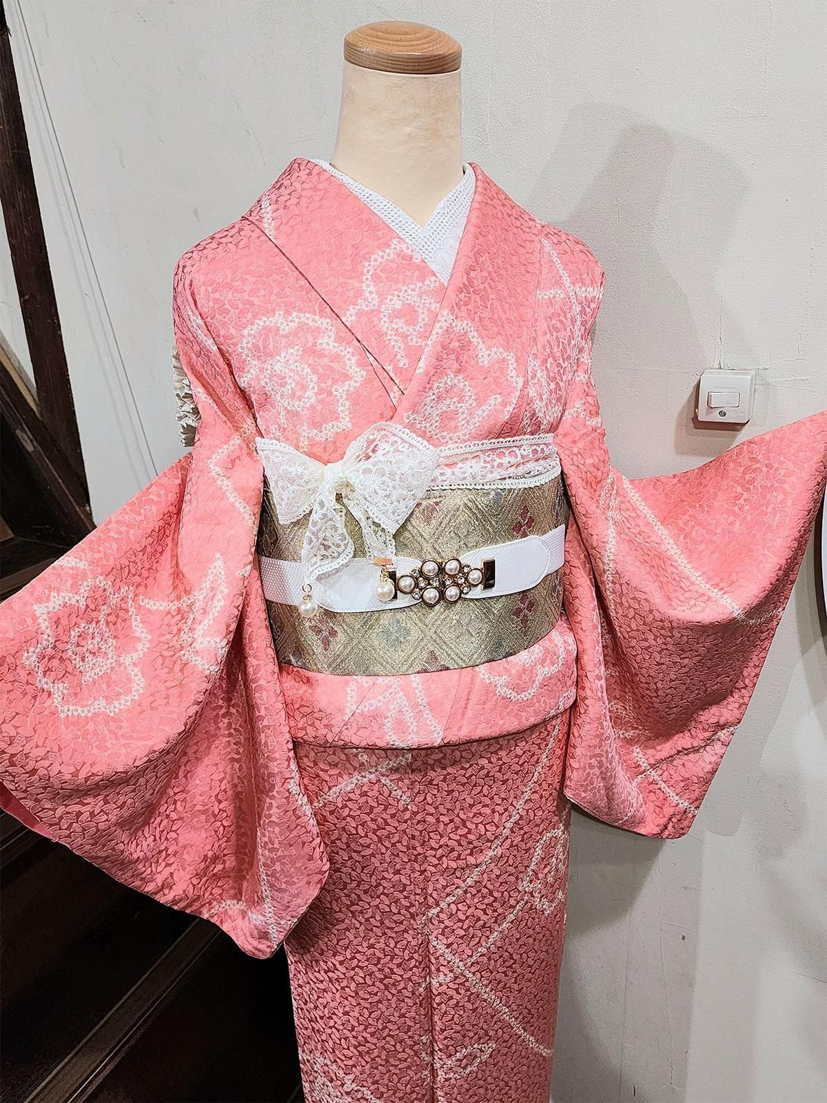 繊細な地紋が光をまとうコーラルピンクに、ふんわりと咲く薔薇の花がロマンチックな正絹本絞りの袷着物
