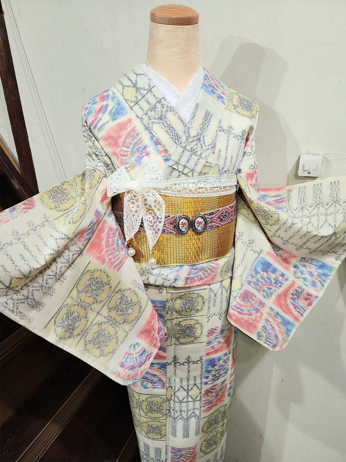 パープルやブルーの帯をあわせると素敵。水玉やボーダーなどのアートな幾何学模様の帯をオンしても遊び心がひきたちます。