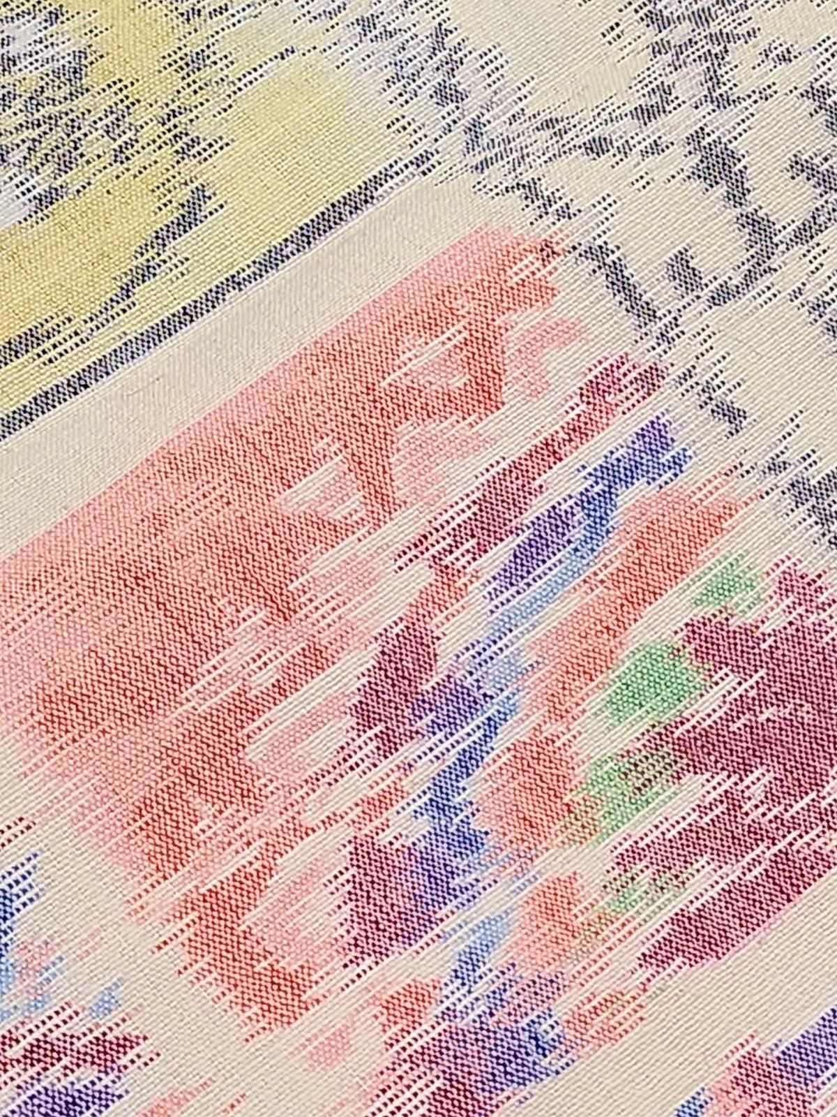 - デザイン: ベージュ地に、ヨーロッパの建築を彩るような花窓やロートアイアン風の装飾模様がパッチワークのように織りだされた装飾模様に心ときめく一枚。絣のようにほどけるパステル調のやわらかな色彩が夢見るような物語を紡ぎ出します。