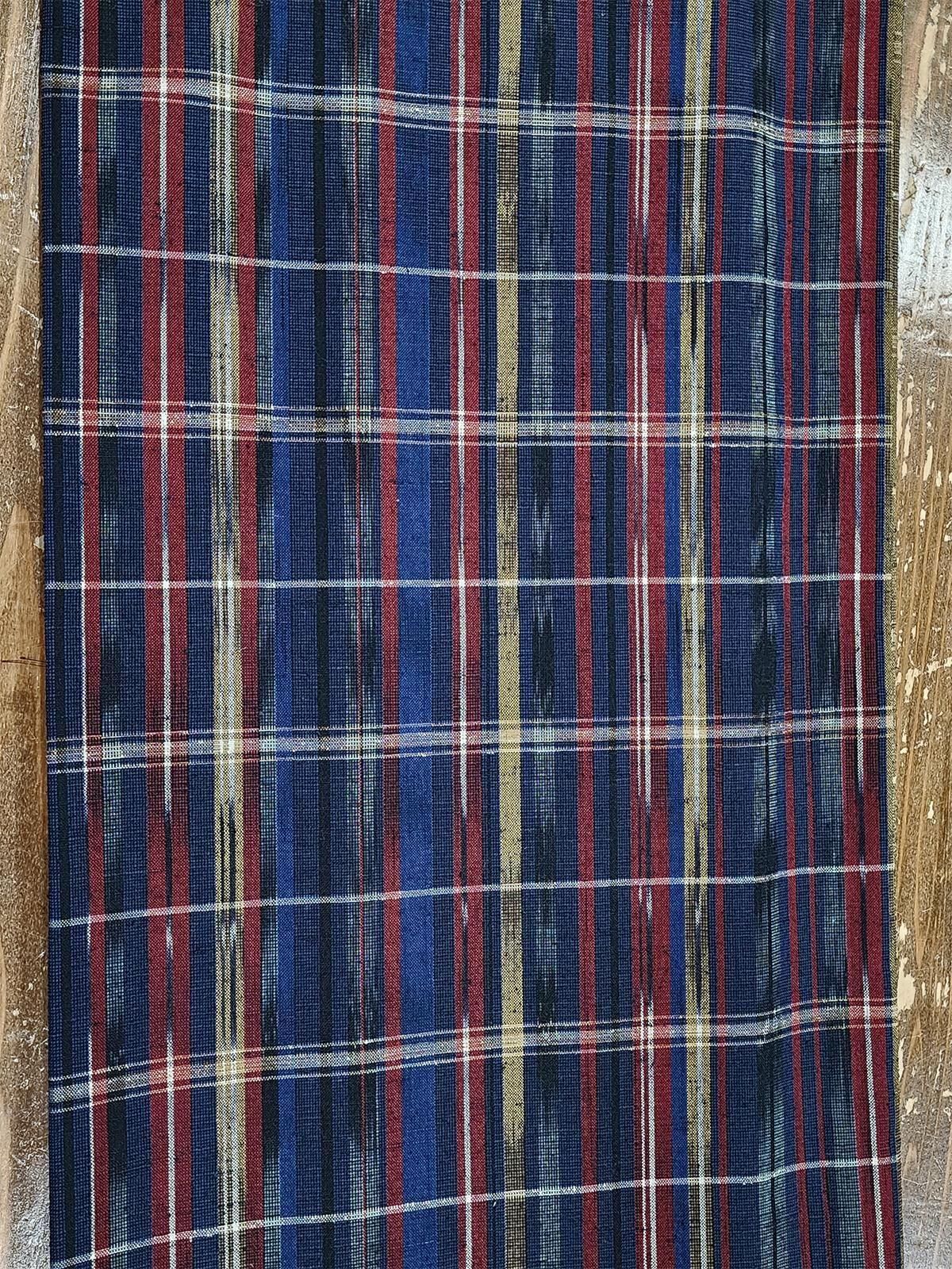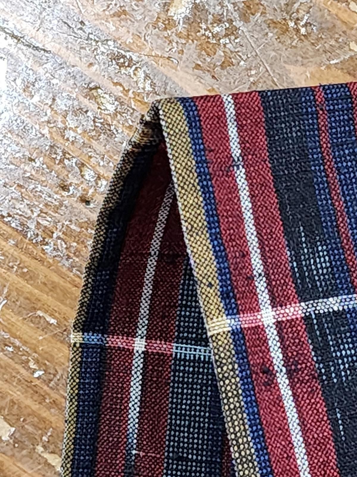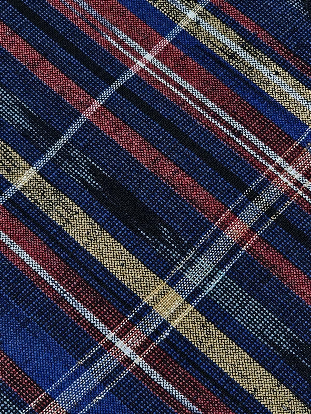 - デザイン:シックなダークネイビーに、ルージュとマスタードの縦ライン、白の横ラインが重なった大胆なチェックパターンに、絣模様が手仕事のニュアンスを添えるデザイン。紬風の節がナチュラルな風合と立体感をプラスして、シンプルかつ奥行きと深みのある一枚になっています。