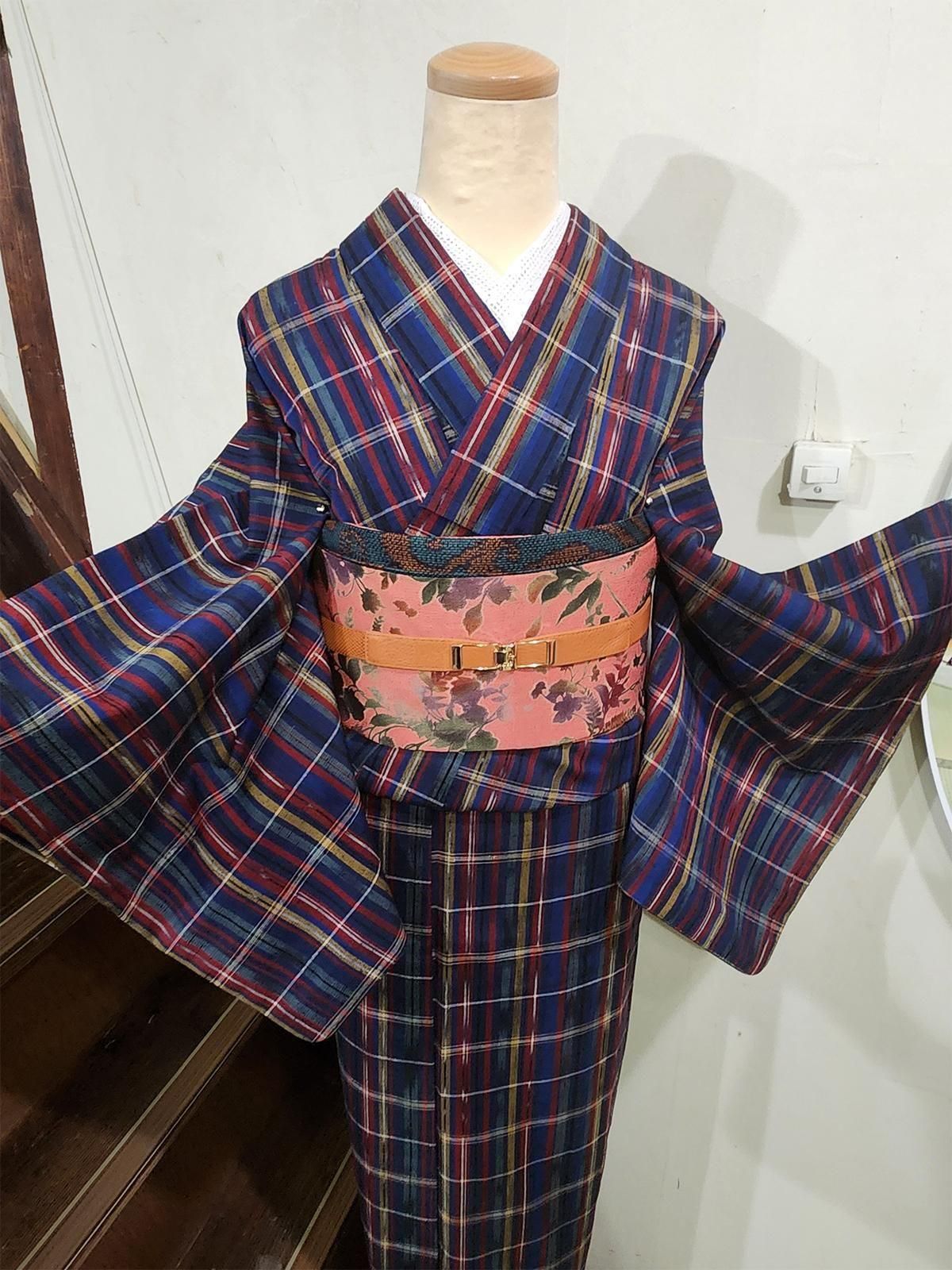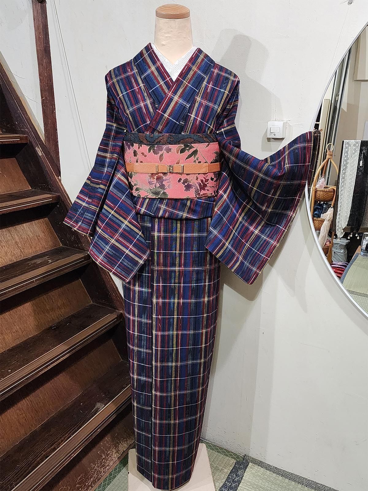 ダークネイビーに絣チェックがナチュラルモダンなウール紬単着物 販売価格 11,800円(税込12,980円) 在庫数 在庫数:1 購入数 特定商取引法に基づく表記 (返品など) ダークネイビーにルージュとマスタード、オフホワイトのラインが交差したナチュラルトーンチェックがモダンなウール紬単着物 デザイン:シックなダークネイビーに、ルージュとマスタードの縦ライン、白の横ラインが重なった大胆なチェックパターンに、絣模様が手仕事のニュアンスを添えるデザイン。紬風の節がナチュラルな風合と立体感をプラスして、シンプルかつ奥行きと深みのある一枚になっています。 印象: 深みのあるダークトーンで落ち着きがありつつ、赤と黄の差し色がほどよい存在感をプラス。モダンで洗練されたムードとリラックスした自然体の心地よさを兼ね備えたこなれ感のある大人のカジュアルスタイルをつくりだしてくれます。 素材・着用感: ざらりとした手触りの、所々に紬のような節感のある中厚のウール地で、シワになりにくく、ご自宅で気軽にお洗濯できる扱いやすさも魅力です。 季節・シーン: 初秋〜春までのスリーシーズンに活躍。街歩きや旅行、雨の日のお出かけ、気軽な食事会などデイリーカジュアルに。 コーデ提案: 無地や幾何学模様の帯でシンプルに仕上げても、花柄やモチーフアイテムを重ねてミックス感ある装いにしても。温かみのある小物(キャメル・ボルドー・深緑)とも好相性。 着物の種類:ウール着物 / 単仕立て / 織模様 ウール着物の魅力については下記の特集ページでもご紹介しています。ぜひご覧ください。 姉妹屋イチオシアイテム!ウール着物のススメ 仕立て: エリはバチ衿で仕立てはミシンと部分手縫いです。スソまわりやソデまわりなど着用時目につくところは手まつりです。 サイズ(単位:cm) 身丈160cm 裄丈65cm(縫代4cm) 袖丈49cm(縫代3cm) 前幅23.5cm 後幅30.5cm 目安:身長 155cm〜165cm 前後の方向け トール丈 体型により個人差あり 着物サイズについて サイズなどのご相談はLINEでお気軽に! 発送日: 5営業日以内に発送いたします。 丈について: 肩山から裾までの長さです。 裄について: 裄の項目で、裄出しが可能な場合は 「(縫代◯cm)」 と表記しています。※縫代の記載がない商品は、裄出しの余裕がない、または袷仕立てのため判別できないものです。 実測サイズ: 平置きでの採寸のため、多少の誤差が生じる場合があります。 状態 写真に写らない若干の小汚れや小キズ、うっすらとしたヤケ, アクやクスミがあります。 昔のお着物に慣れた方であれば十分お召しになっていただけるかと思います。 検品にはできるだけ注意を払い、シミ・汚れ等を記載しておりますが、微小の汚れ等につきましては見落としがある場合もあります。ユーズド品であることにご理解のうえご購入をお願いいたします。 胴裏につきましては、ユーズド・アンティークの着物はホシやシミが生じているものが大半のため、状態が軽度のものにつきましては記載を省かせていただいております。 当店で取り扱いしている着物の状態については、「姉妹屋について」のページの「着物の状態について」をご参照ください。 その他注意事項 商品は、『着物または浴衣』のみになります。写真のその他のアイテムは別売りまたは撮影用の参考商品です。 写真につきましては、実際の商品に近くなるよう努めておりますが、モニターの違いや光のあたり具合により、色や雰囲気が実物とやや異なる場合がございます。あらかじめご了承ください。 この商品について問い合わせる この商品を友達に教える 買い物を続ける ツイート この商品をログピでつぶやく Yahoo!ブックマークに登録する はてなブックマークに登録する