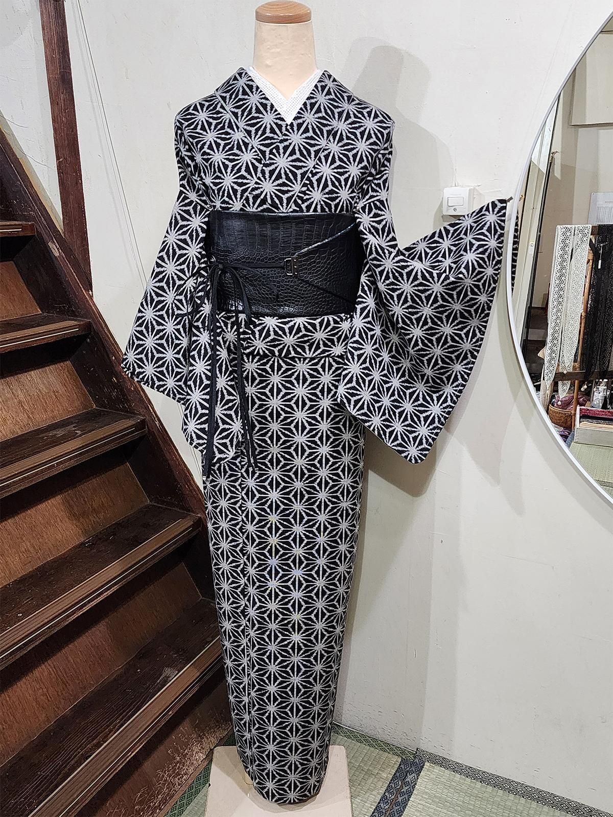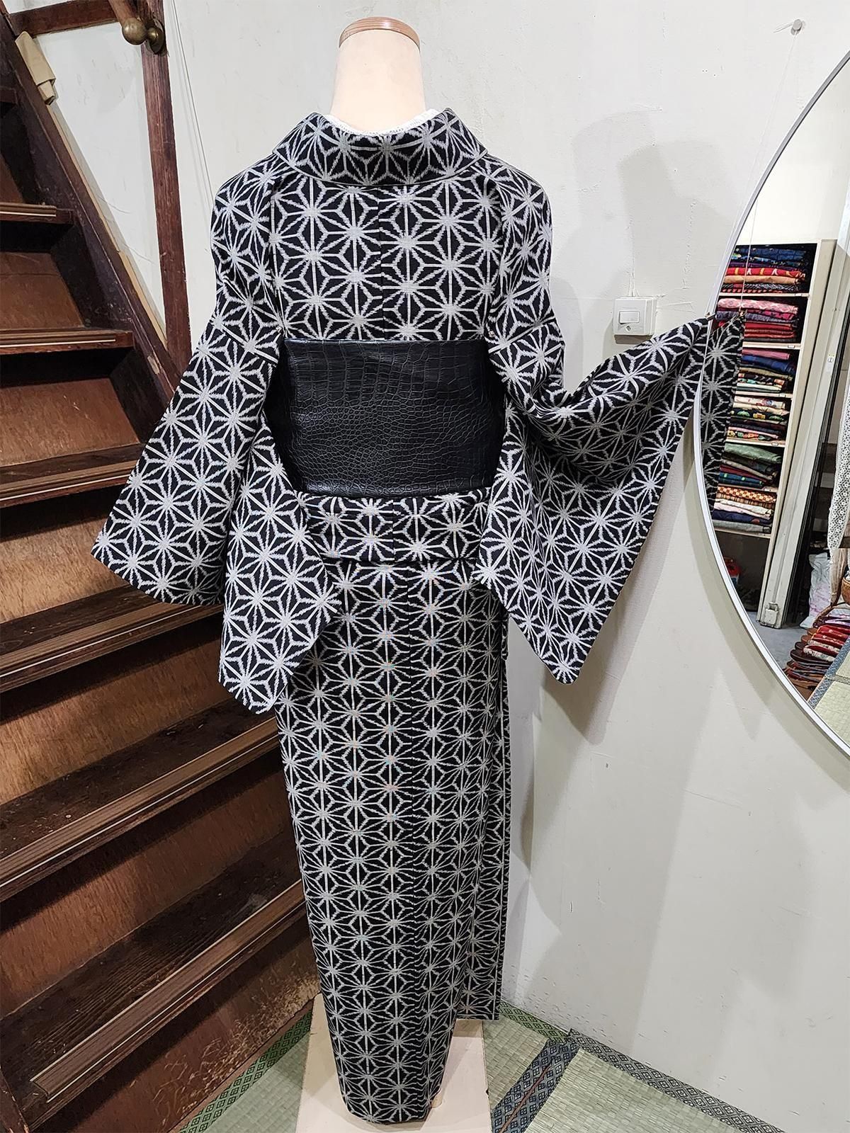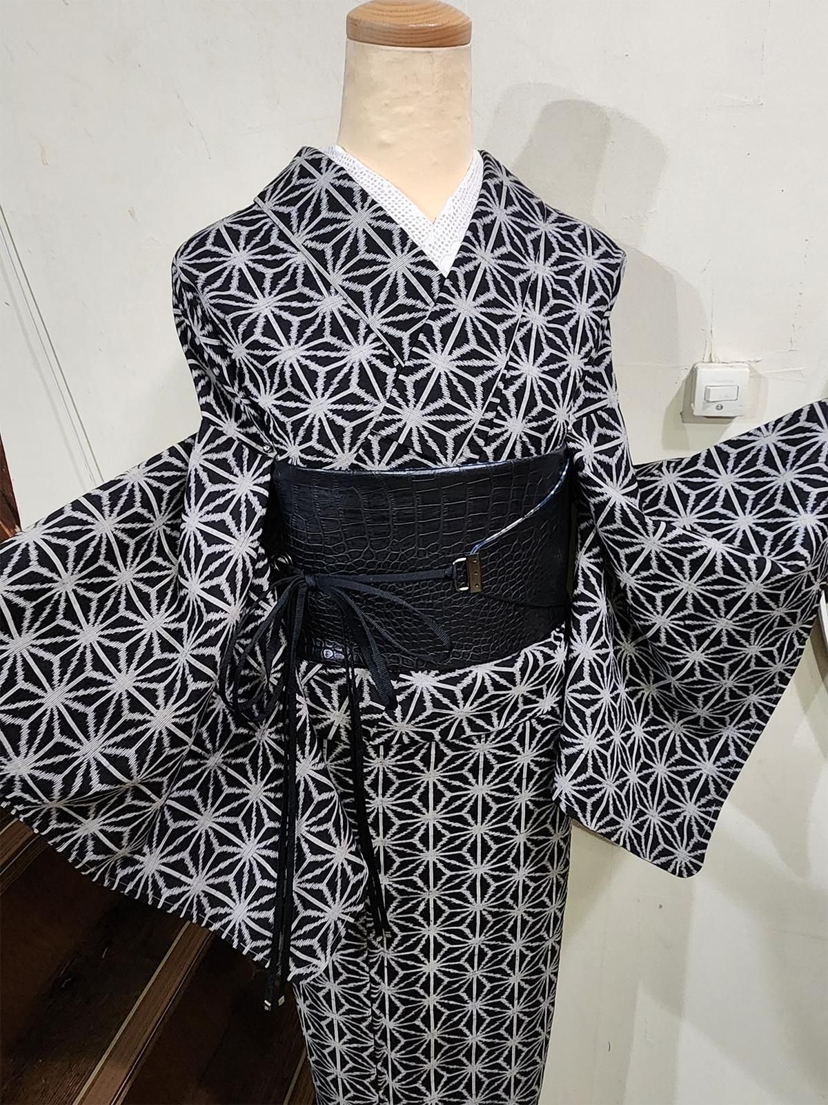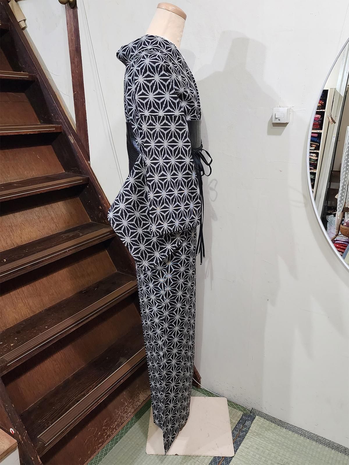 モノクローム麻の葉模様格が粋なウール単着物 販売価格 11,800円(税込12,980円) 在庫数 在庫数:1 購入数 特定商取引法に基づく表記 (返品など) シックなブラックにきりりと浮かぶ大胆な麻の葉の幾何学模様。シャープにきまるウール単着物 デザイン: モノトーンで織りだされた麻の葉模様が潔い一枚。絣のニュアンス感がグラフィカルな幾何学模様に軽やかな遊び心とさりげない抜け感をプラスし、こなれ感のある洗練された着こなしを作り出してくれます。 印象: キレのあるモノトーンが格好良く、モダンにもクラシカルにも楽しんでいただけるアイテム。甘さ控えめの端正な佇まいで、ユニセックスなスタイルにもぴったり。大人の魅力をひきたてます。 素材・着用感:ざらりとした手触りの中厚のウール地で、シワになりにくく、ご自宅で気軽にお洗濯できる扱いやすさも魅力です。 季節・シーン: 裏地のない軽やかな単仕立てですが、ウールなので真冬も暖か。暑さが落ち着いた初秋から春までスリーシーズン活躍。カジュアル向きのお着物で、街歩きや旅行、カフェ巡り、雨の日のお出かけなどデイリーに楽しめます。 コーデ提案: 黒や白の帯でミニマルに、差し色の帯をあわせてモードに。レザーやデニムなど異素材ミックスも大人っぽくおしゃれにきまります。 着物の種類:ウール着物 / 単仕立て / 織模様 ウール着物の魅力については下記の特集ページでもご紹介しています。ぜひご覧ください。 姉妹屋イチオシアイテム!ウール着物のススメ 仕立て: エリはバチ衿で手縫い仕立てです。 ※手縫いかどうかについての判断は、スソまわりとソデまわり、ソデ付け、脇線の縫い目で確認しております。それ以外の部分ミシン縫いの場合は見逃しがあることがございますので、ご了承ください。 サイズ(単位:cm) 身丈157.5cm 裄丈63.5cm(縫代6cm) 袖丈49.5cm 前幅25cm 後幅30.5cm 目安:身長 152.5cm〜162.5cm 前後の方向け 体型により個人差あり 着物サイズについて サイズなどのご相談はLINEでお気軽に! 発送日: 5営業日以内に発送いたします。 丈について: 肩山から裾までの長さです。 裄について: 裄の項目で、裄出しが可能な場合は 「(縫代◯cm)」 と表記しています。※縫代の記載がない商品は、裄出しの余裕がない、または袷仕立てのため判別できないものです。 実測サイズ: 平置きでの採寸のため、多少の誤差が生じる場合があります。 状態 写真に写らない若干の小汚れや小キズ、うっすらとしたヤケ, アクやクスミがあります。 昔のお着物に慣れた方であれば十分お召しになっていただけるかと思います。 検品にはできるだけ注意を払い、シミ・汚れ等を記載しておりますが、微小の汚れ等につきましては見落としがある場合もあります。ユーズド品であることにご理解のうえご購入をお願いいたします。 胴裏につきましては、ユーズド・アンティークの着物はホシやシミが生じているものが大半のため、状態が軽度のものにつきましては記載を省かせていただいております。 当店で取り扱いしている着物の状態については、「姉妹屋について」のページの「着物の状態について」をご参照ください。 その他注意事項 商品は、『着物または浴衣』のみになります。写真のその他のアイテムは別売りまたは撮影用の参考商品です。 写真につきましては、実際の商品に近くなるよう努めておりますが、モニターの違いや光のあたり具合により、色や雰囲気が実物とやや異なる場合がございます。あらかじめご了承ください。 この商品について問い合わせる この商品を友達に教える 買い物を続ける ツイート この商品をログピでつぶやく Yahoo!ブックマークに登録する はてなブックマークに登録する