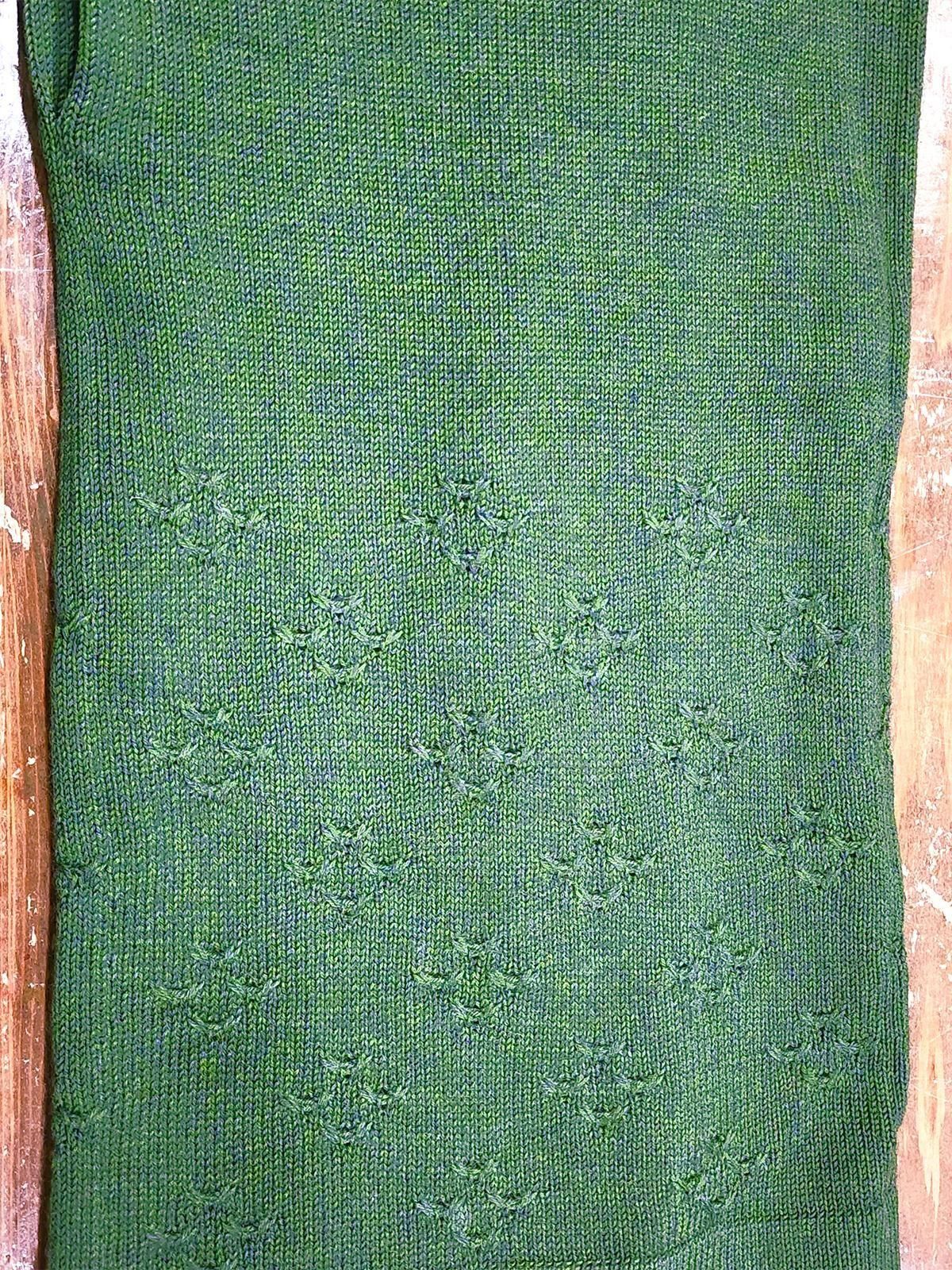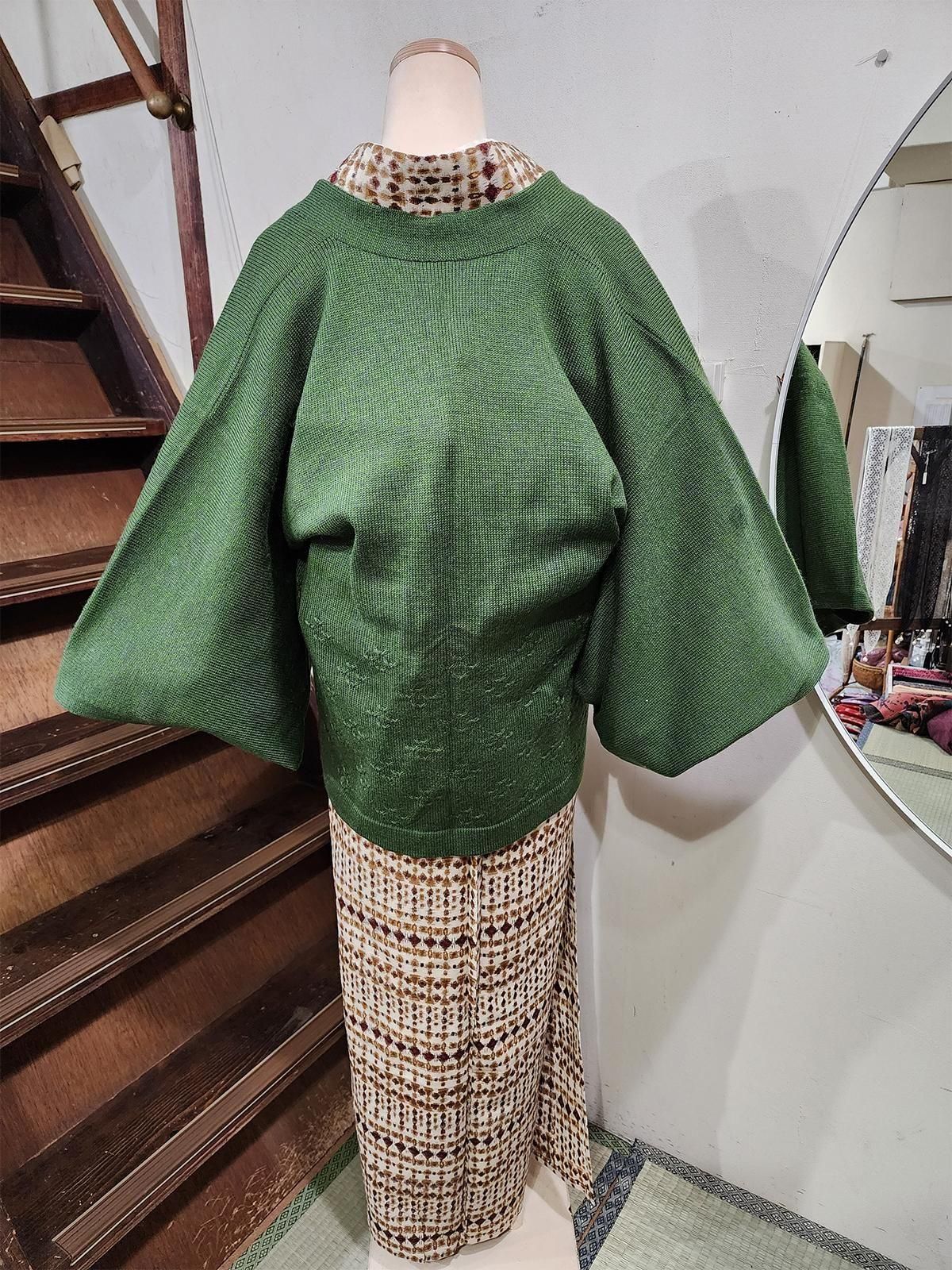 - デザイン: 深みのあるオリーブグリーンの無地に、花にも星にも見える小さな編み模様がさりげなく浮かぶ一枚。ガウンやカーディガンのように気取りのない軽やかなスタイルを楽しんでいただけます。