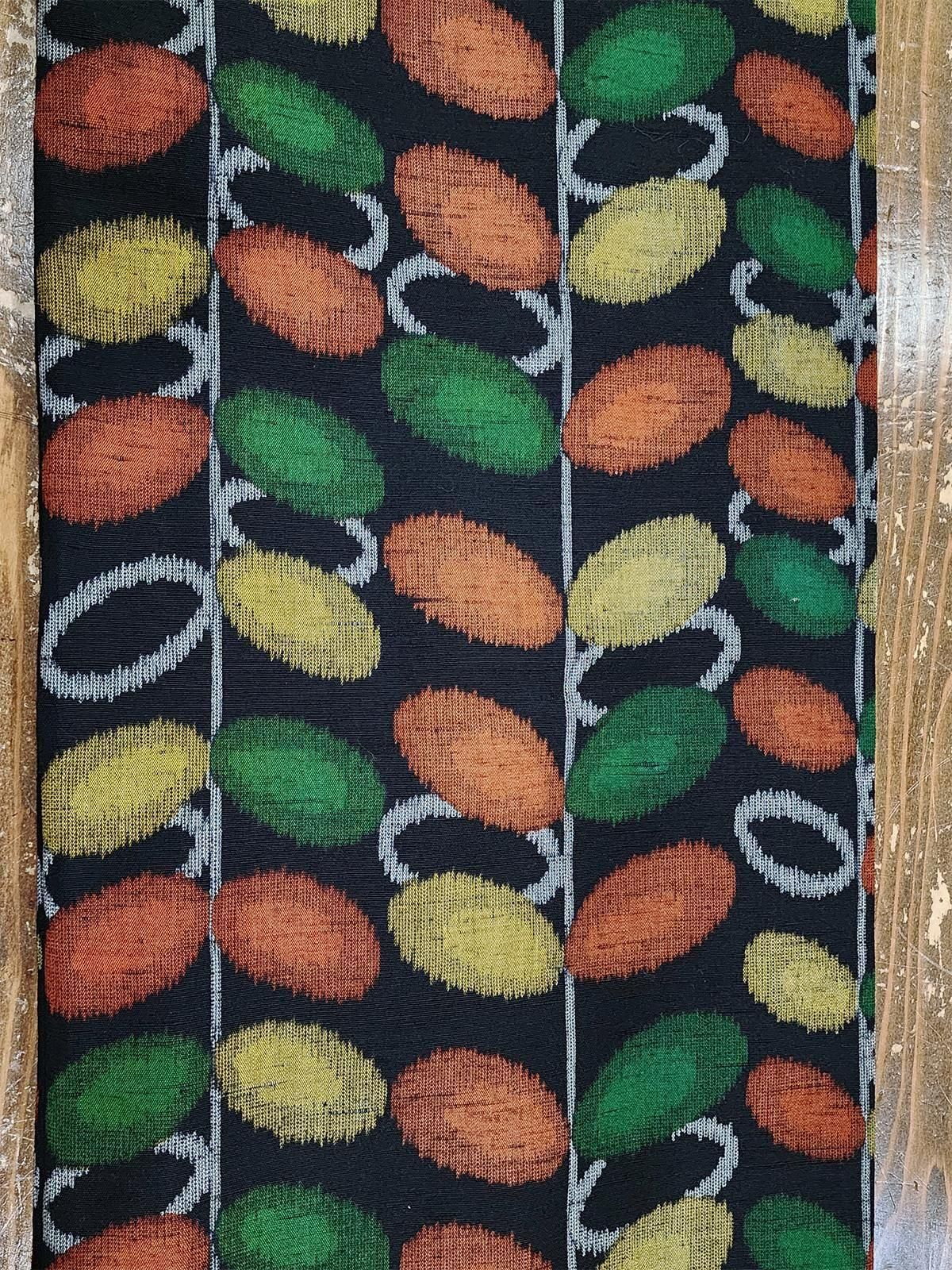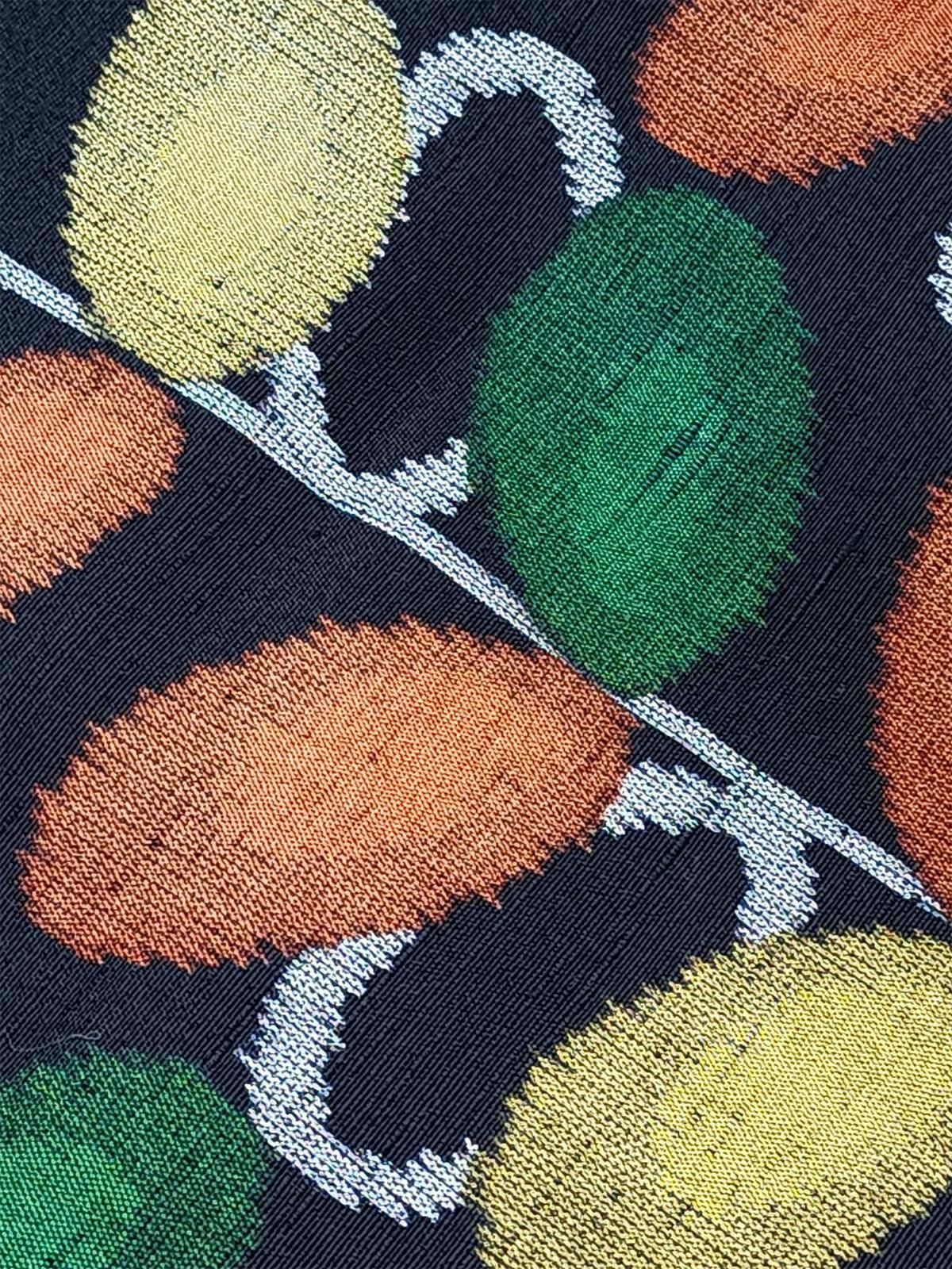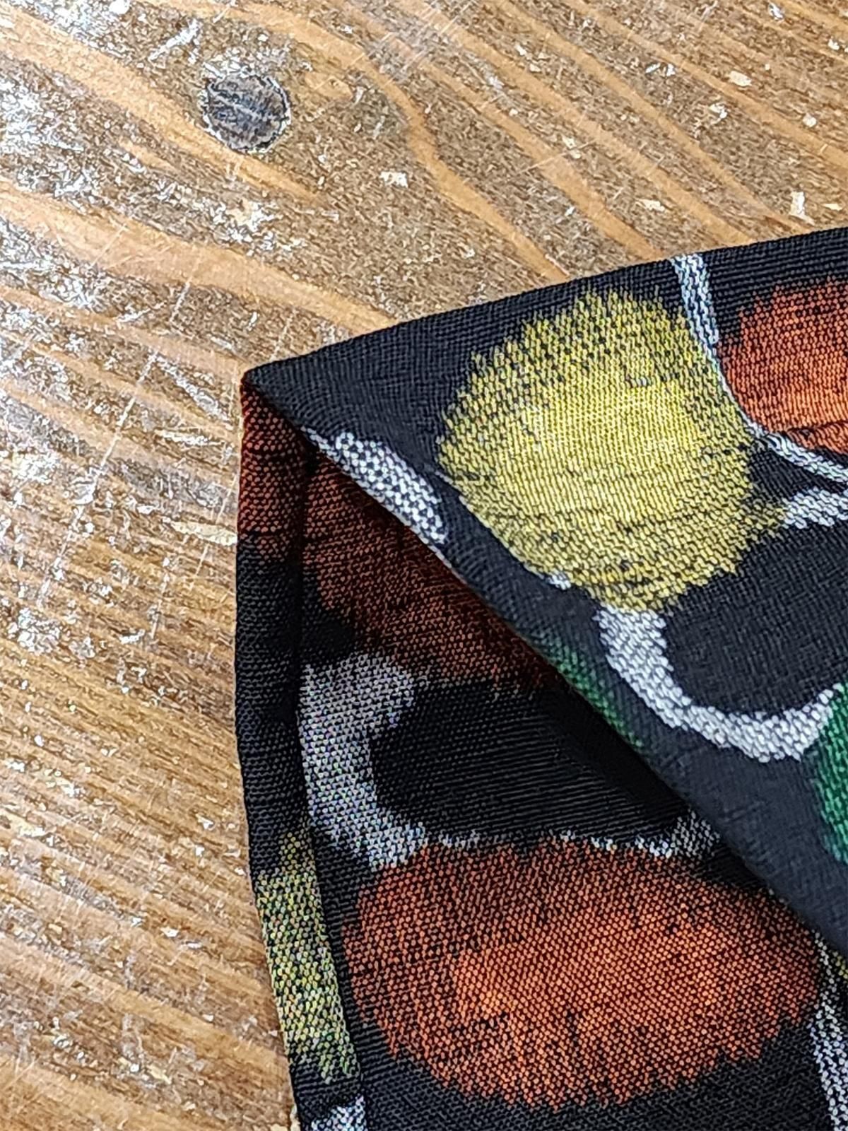 - デザイン: 楕円の葉を連ねた枝葉をモチーフにしたミッドセンチュリーのグラフィックアートを思わせる抽象的なデザイン。黒地にクリームイエロー、フォレストグリーン、テラコッタオレンジ、グレイッシュホワイトのリズミカルな配色が弾みます。