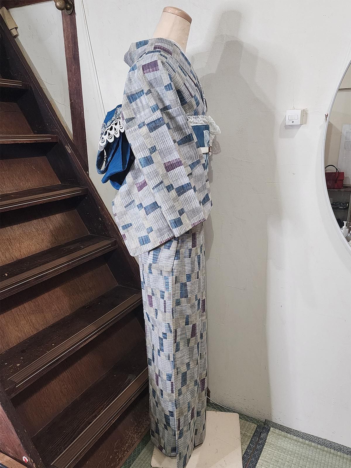 - コーデ提案: 柄が強すぎず無地着物のように着まわしやすいため、帯や小物によってモダンにもクラシカルにもポップにもナチュラルにも印象をチェンジ。シンプル帯と合わせれば 、すっきり上品に。華やかな帯や個性的な帯もベストマッチ。