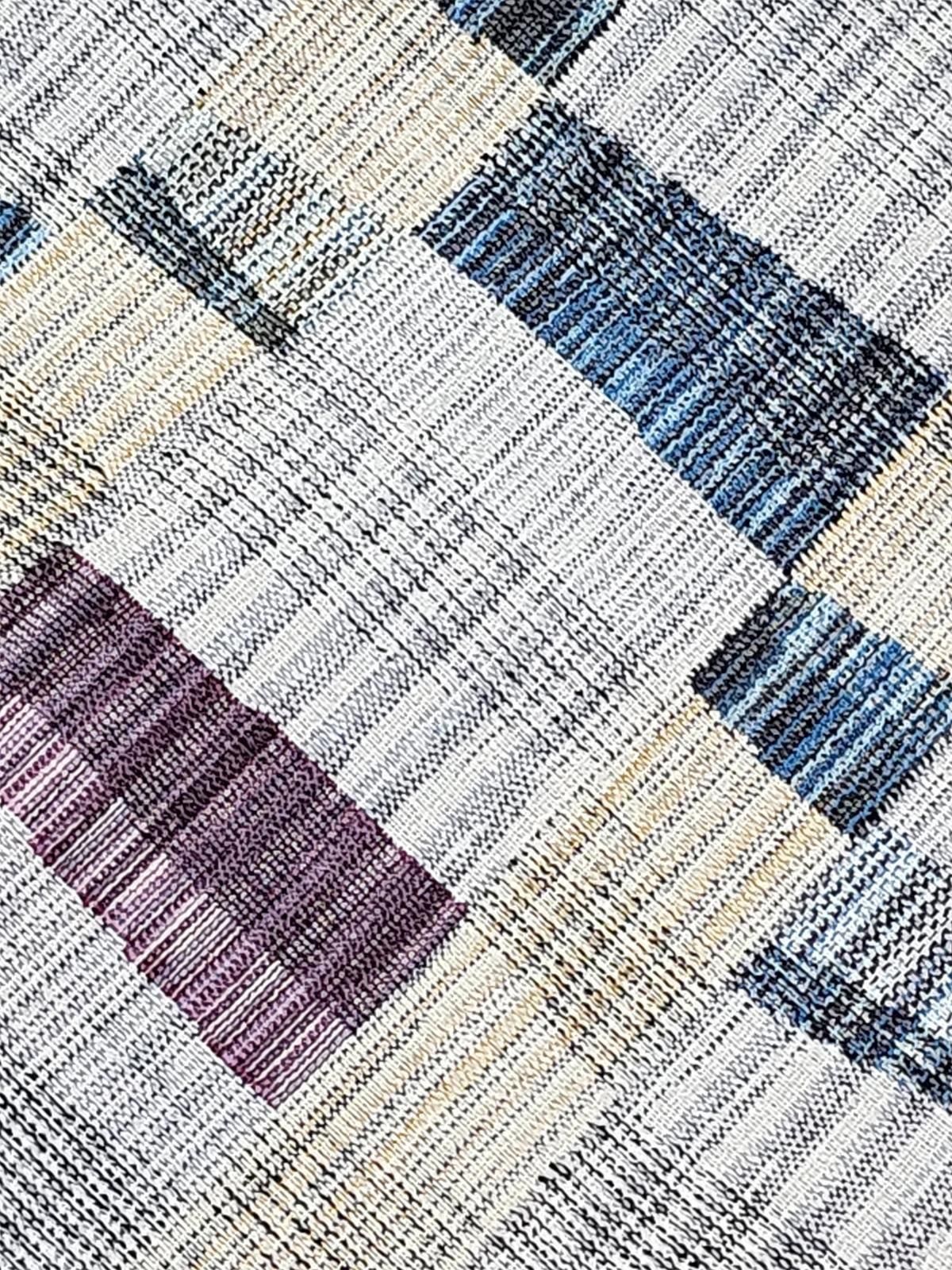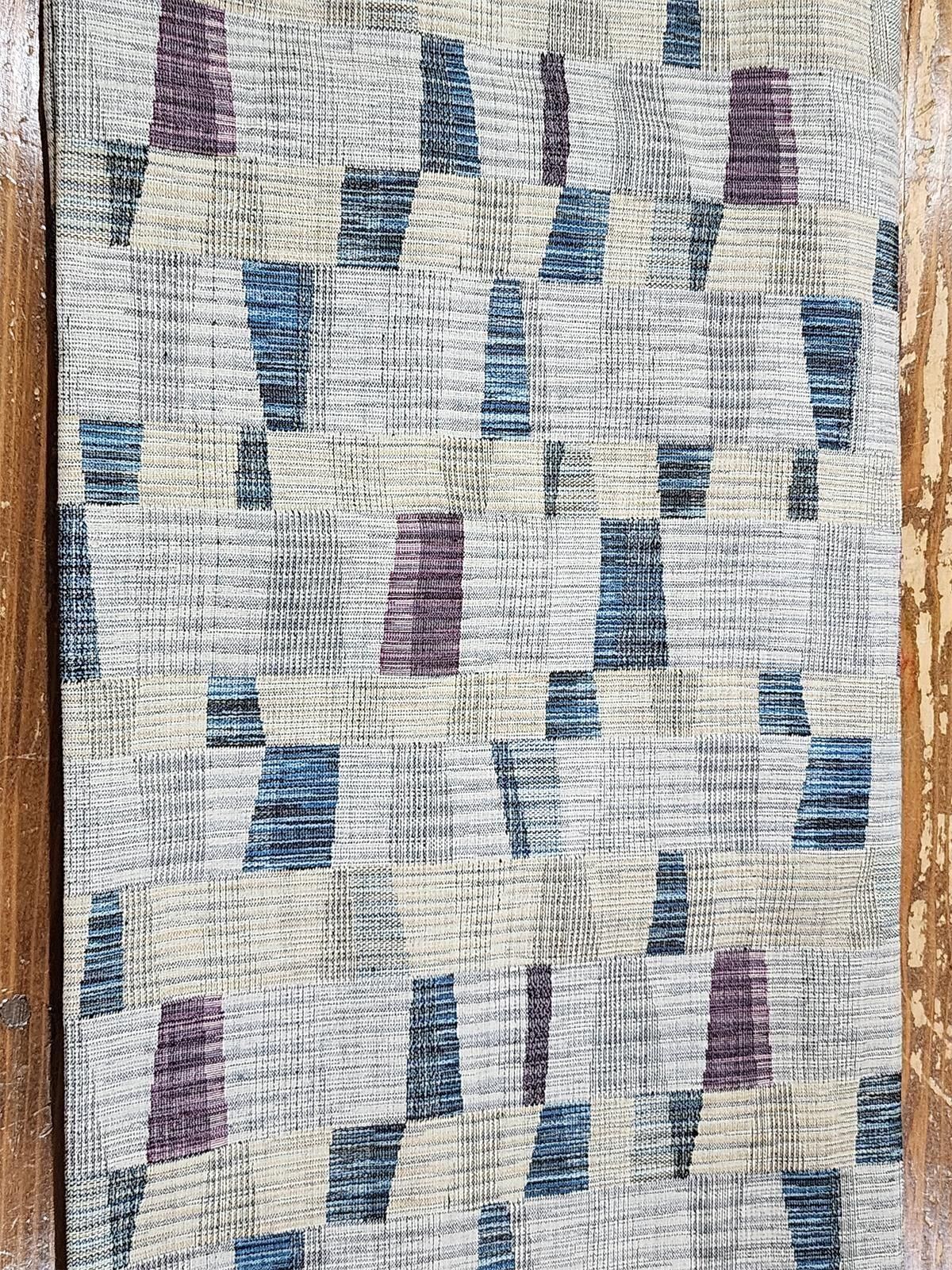 - デザイン: 細やかな線を重ねたグリッドの上に、スモークブルー、スモークピンク、グレージュのブロックを配した幾何学模様。1950年代の北欧インテリアテキスタイルのような落ち着きと遊び心を感じさせるデザインで、彩度を抑えた色が織りなすパターンはクラシックなのに新鮮。風景やシーンに調和しながら、さりげない個性を演出してくれます。
