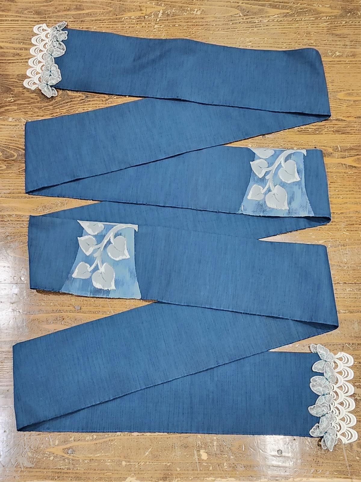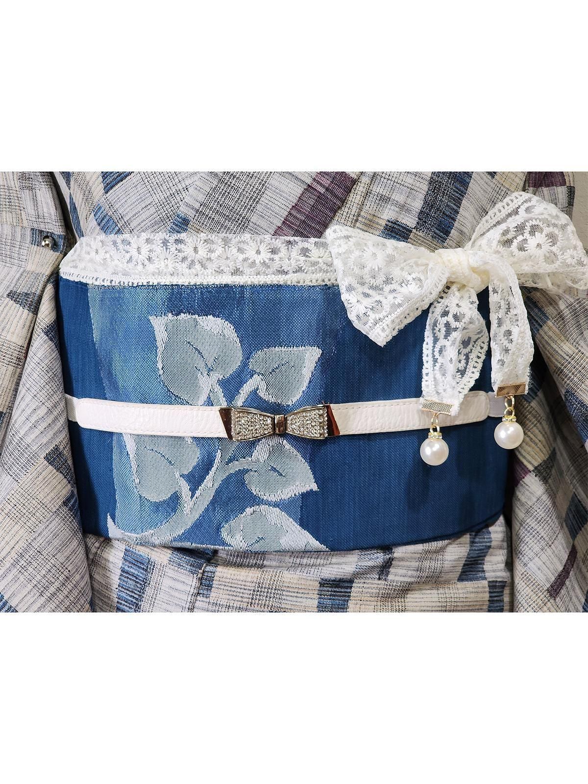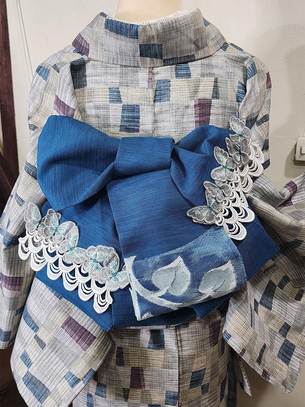 湖面のようなブルーに、ホワイトのリーフモチーフが幻想的に浮かび、きらめく蝶々とレースのトリムが繊細な物語を添える、夢のように可憐なリファイン半幅帯