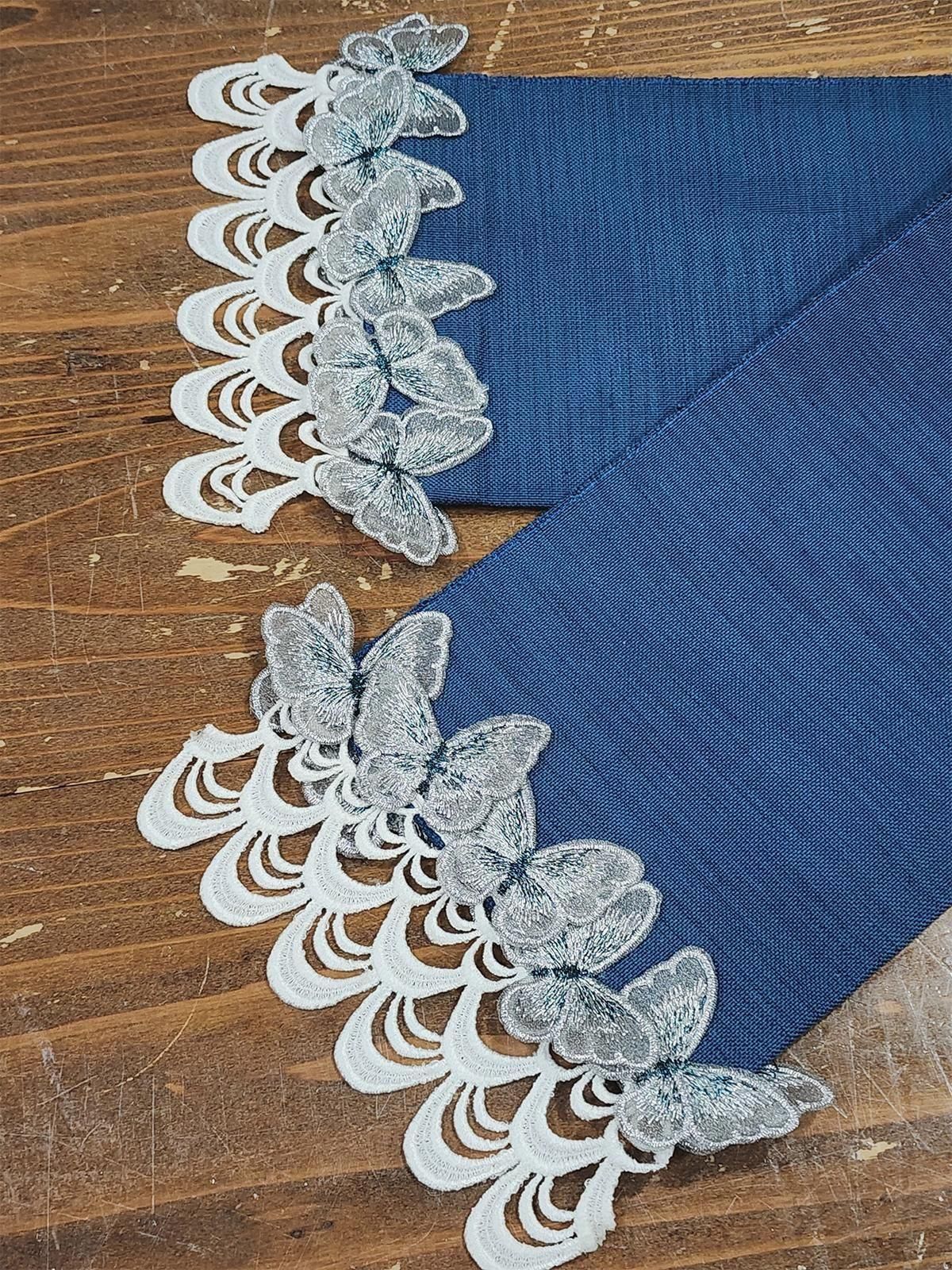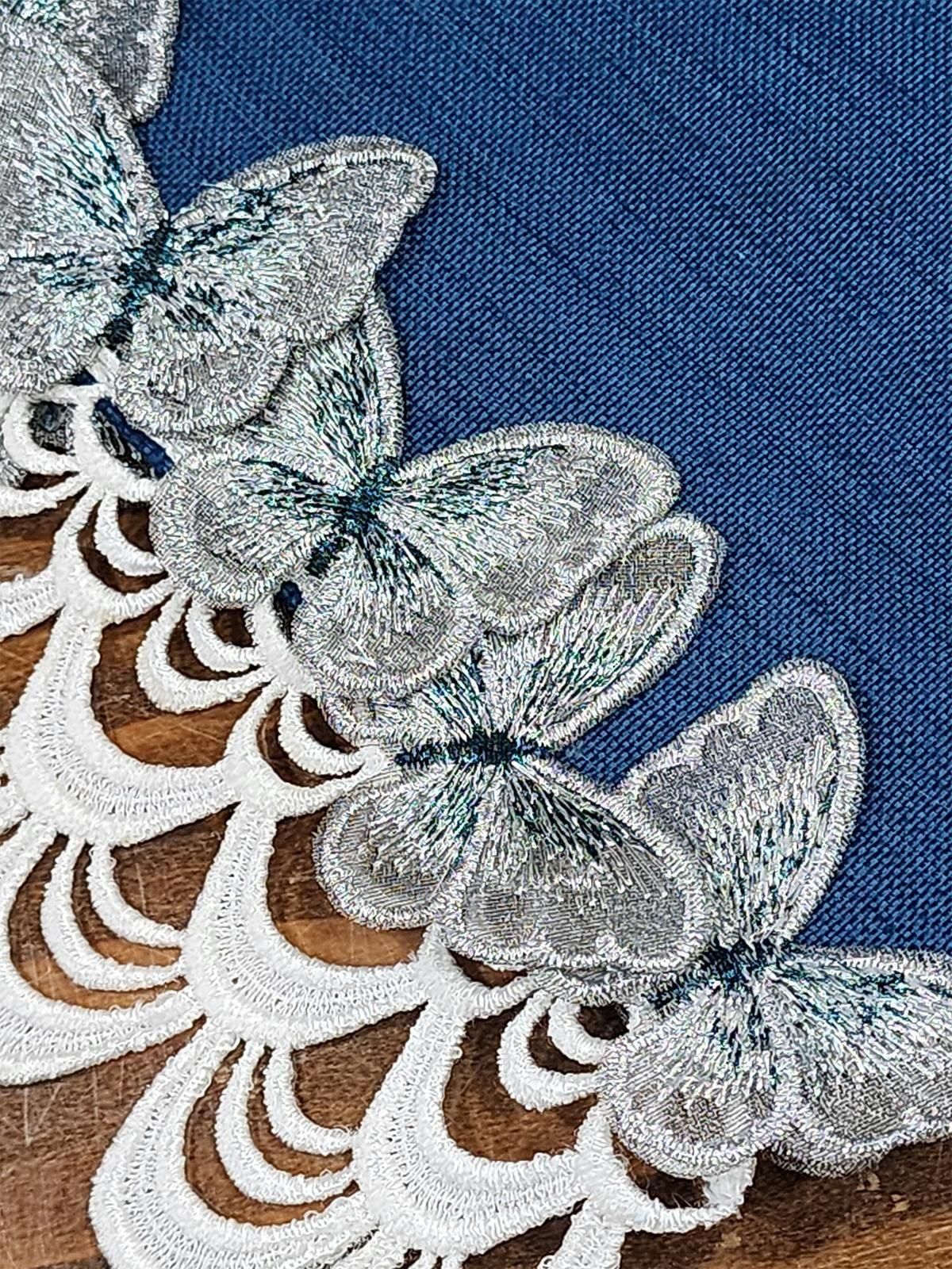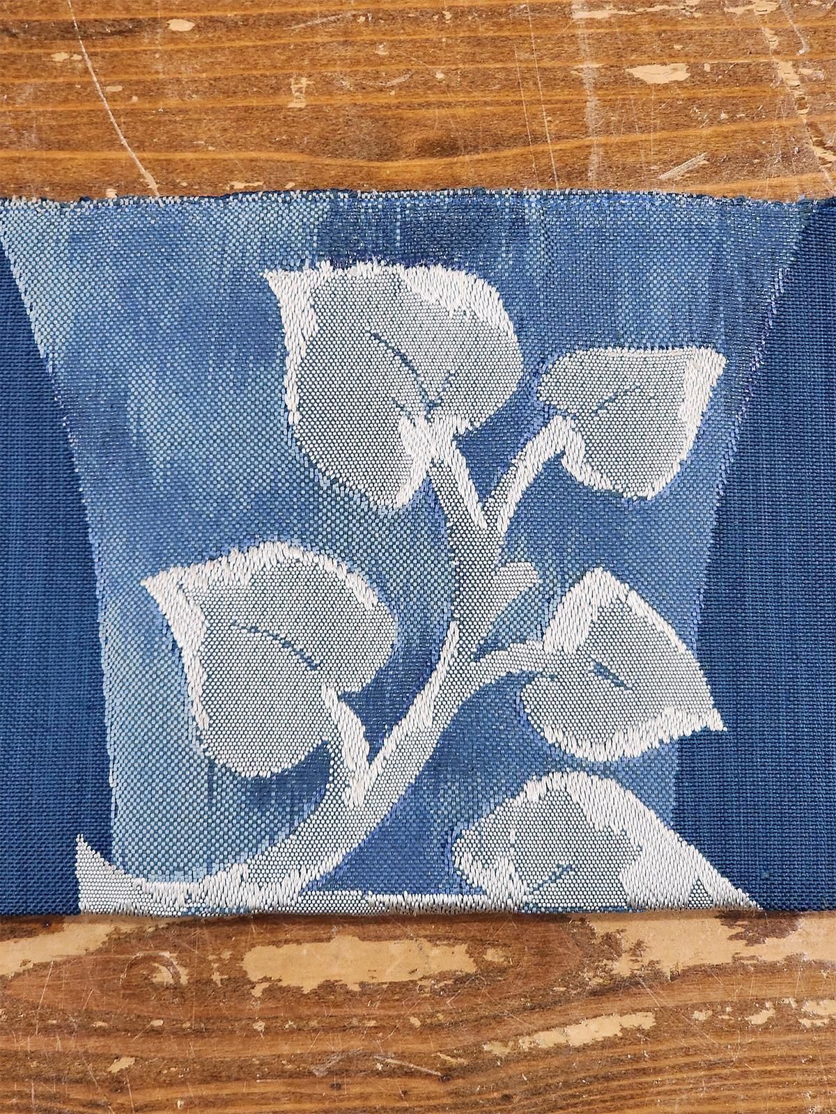 湖面のようなブルーに、ホワイトのリーフモチーフが幻想的に浮かび、きらめく蝶々とレースのトリムが繊細な物語を添える、夢のように可憐なリファイン半幅帯