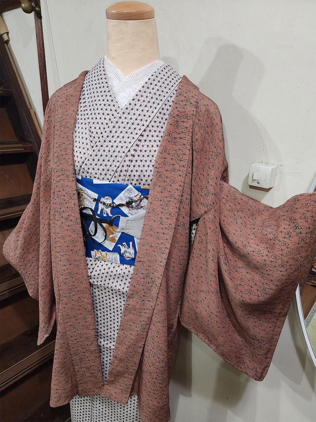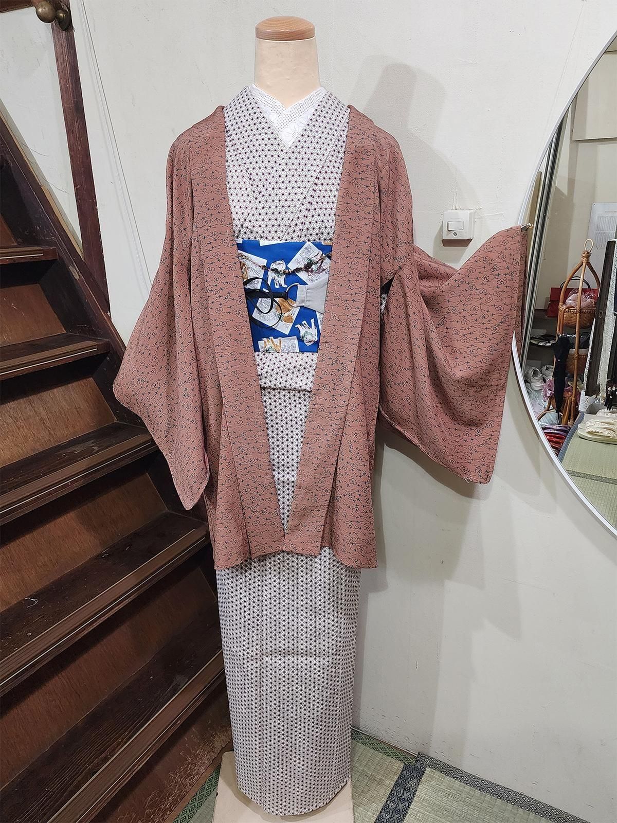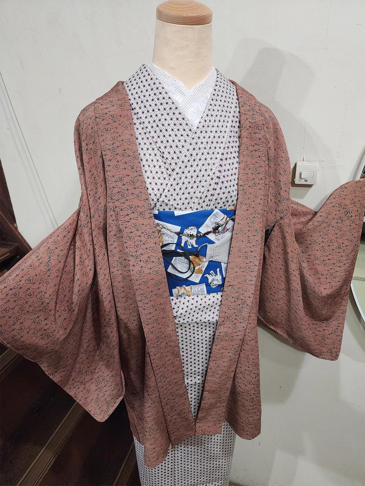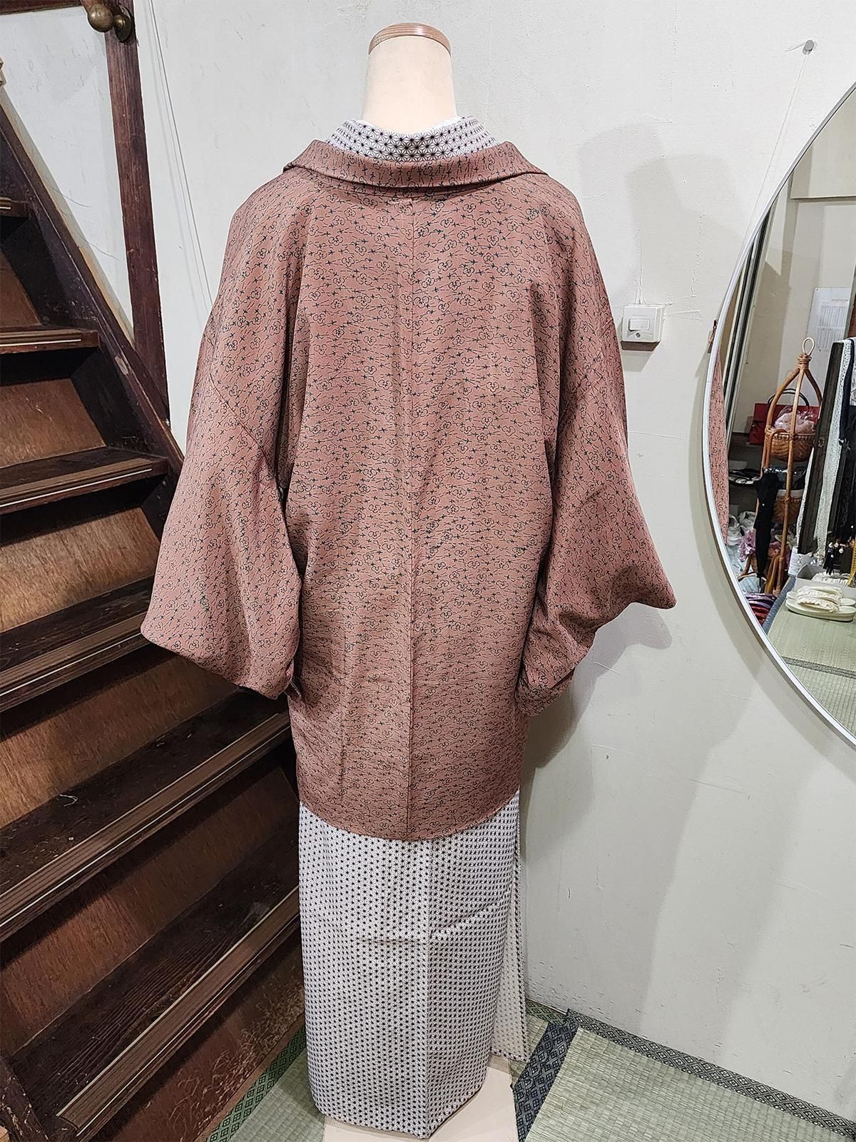 - 印象: あたたかみのあるニュアンスカラーと端正な古典柄が着姿を穏やかにまとめてくれます。一見シンプルですが近くで見ると粋な洒落っ気と遊び心を感じる上品な一枚で、日常にも、ちょっとおめかししたスタイルにも馴染む大人の羽織ものです。