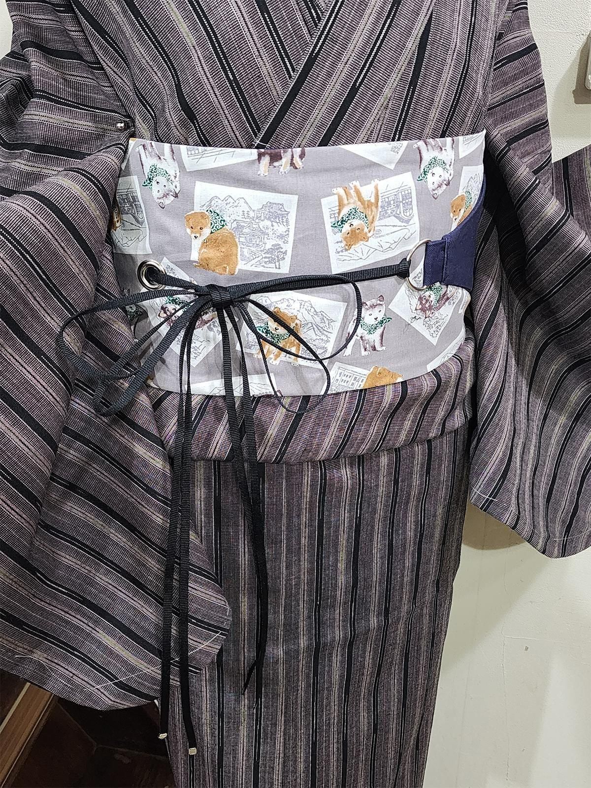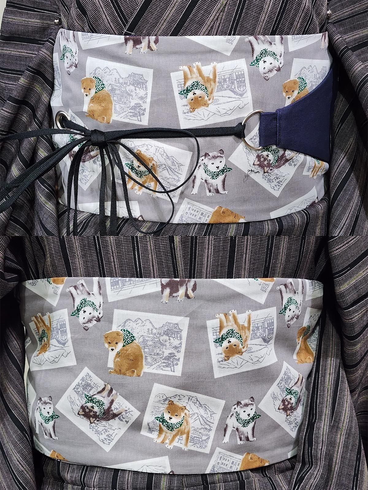 ベルトみたいに“通して結ぶだけ”。洗練されたライトグレーをベースに、絵葉書のようなノスタルジックな風景とおすまし顔の柴犬たちがデザインされた、愛犬といっしょに旅するようなワクワク感を身にまとう「ベルタル帯」