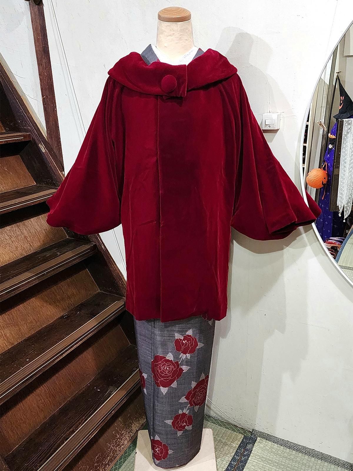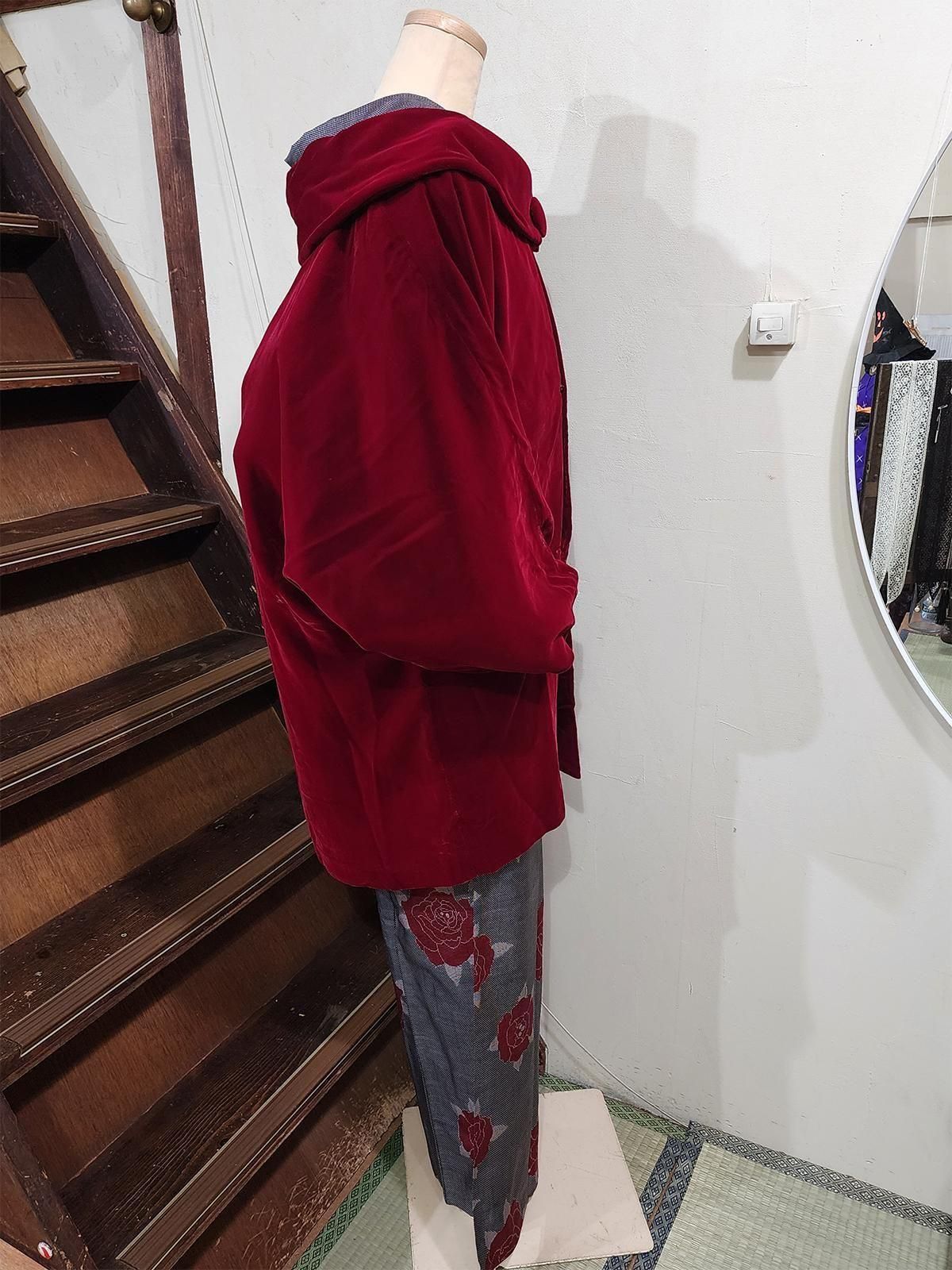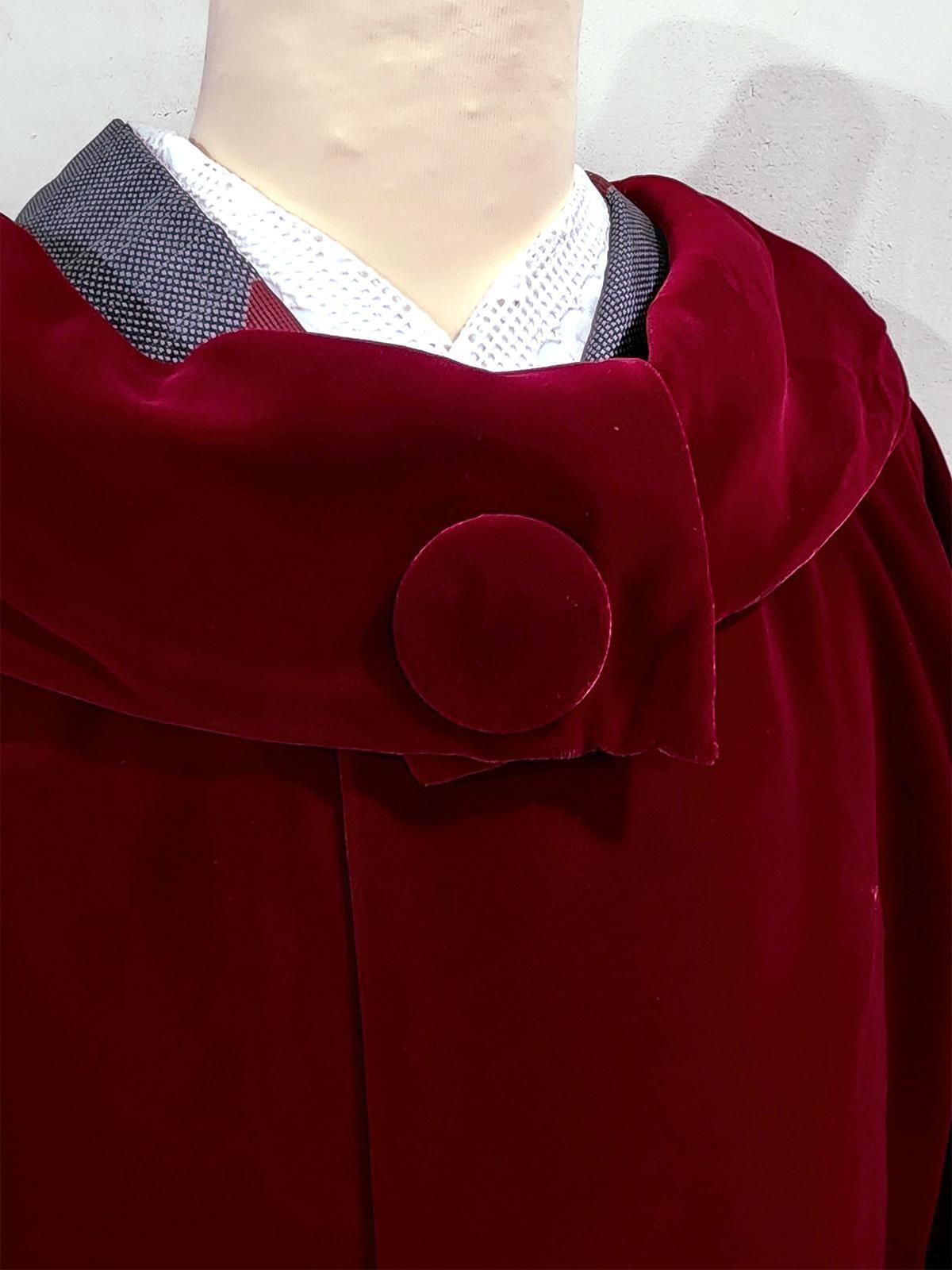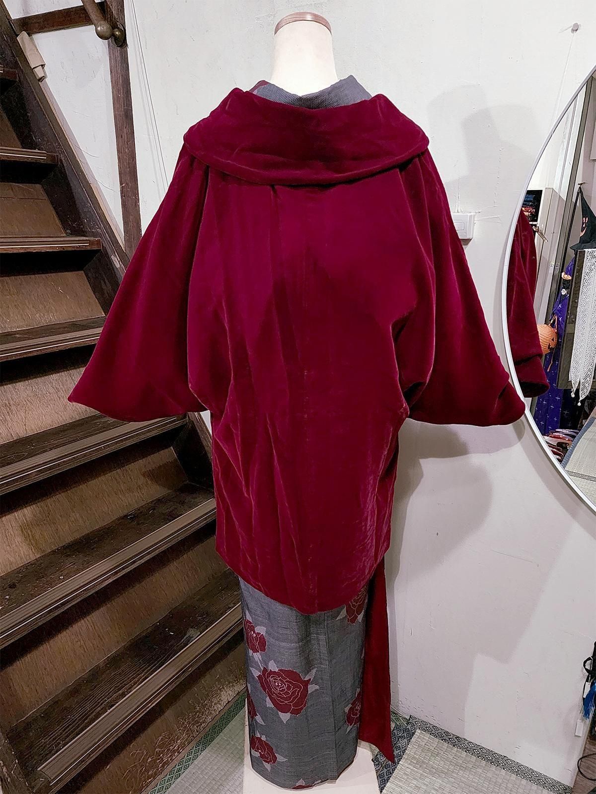 バーガンディールージュが艶めく、モードな衿が主役のビテージ・ベロア着物コート。