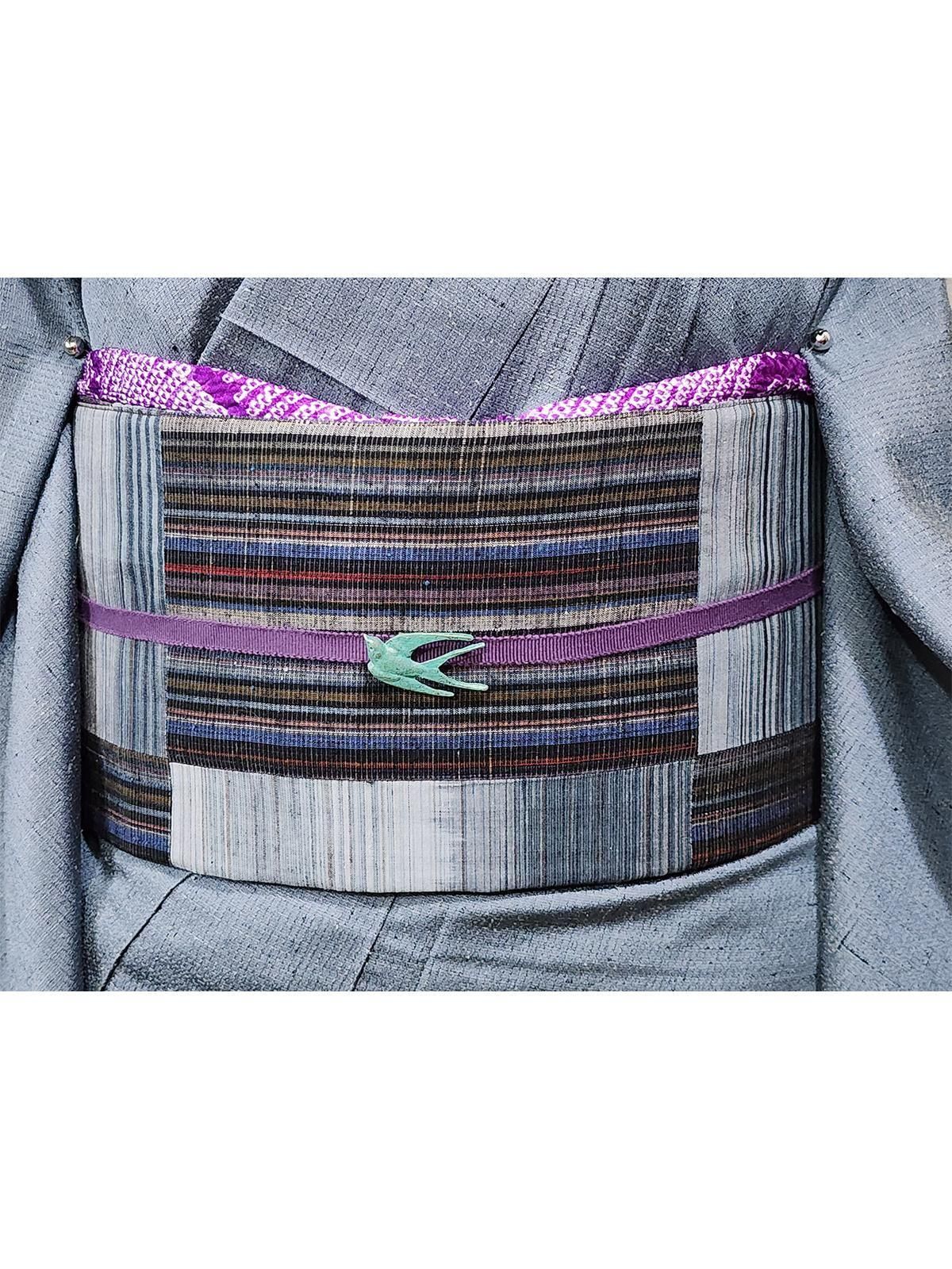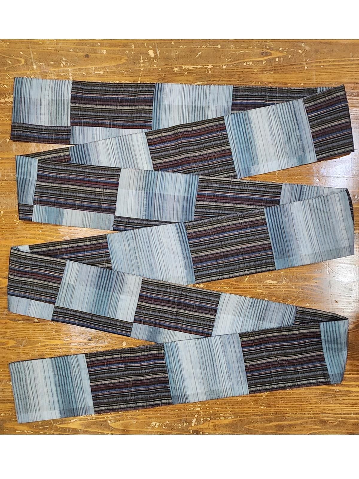 繊細な縞が美しい正絹紬地をパッチワークのように切り嵌めた民芸の美とモダンな遊び心が響き合うロングサイズ・リファイン半幅帯。