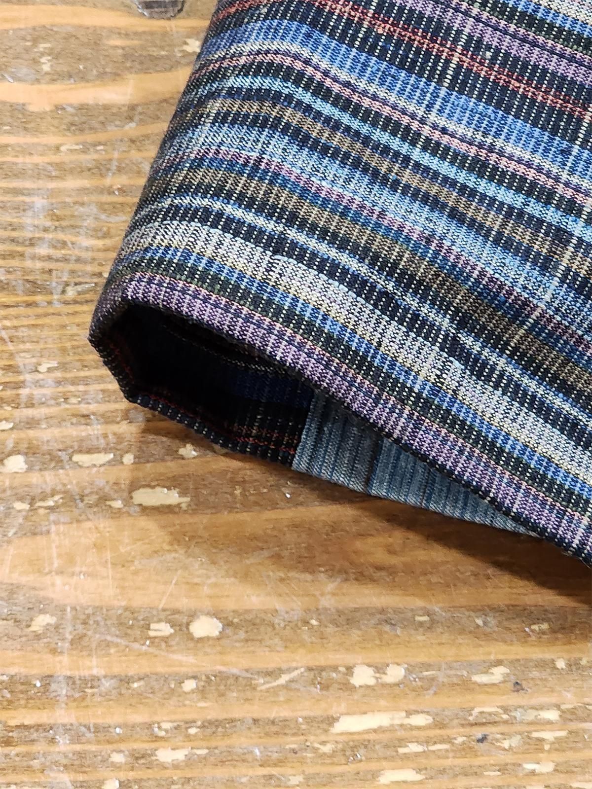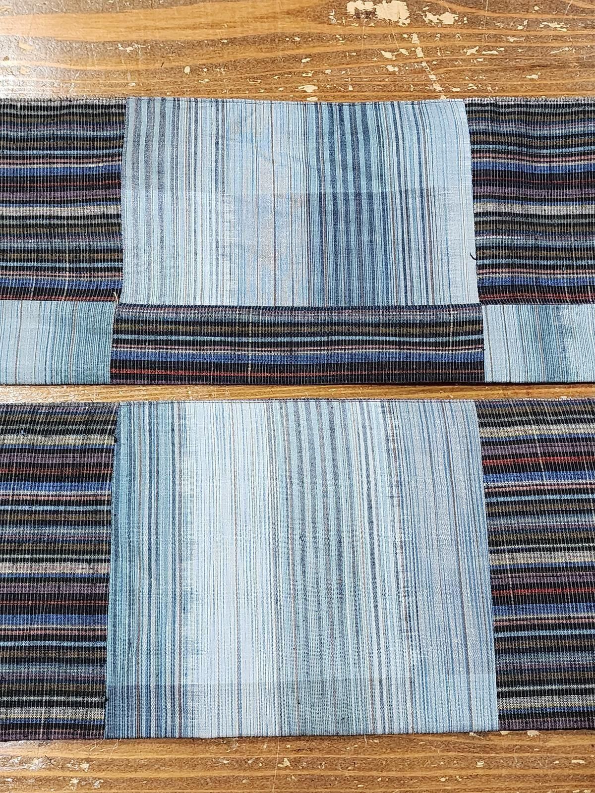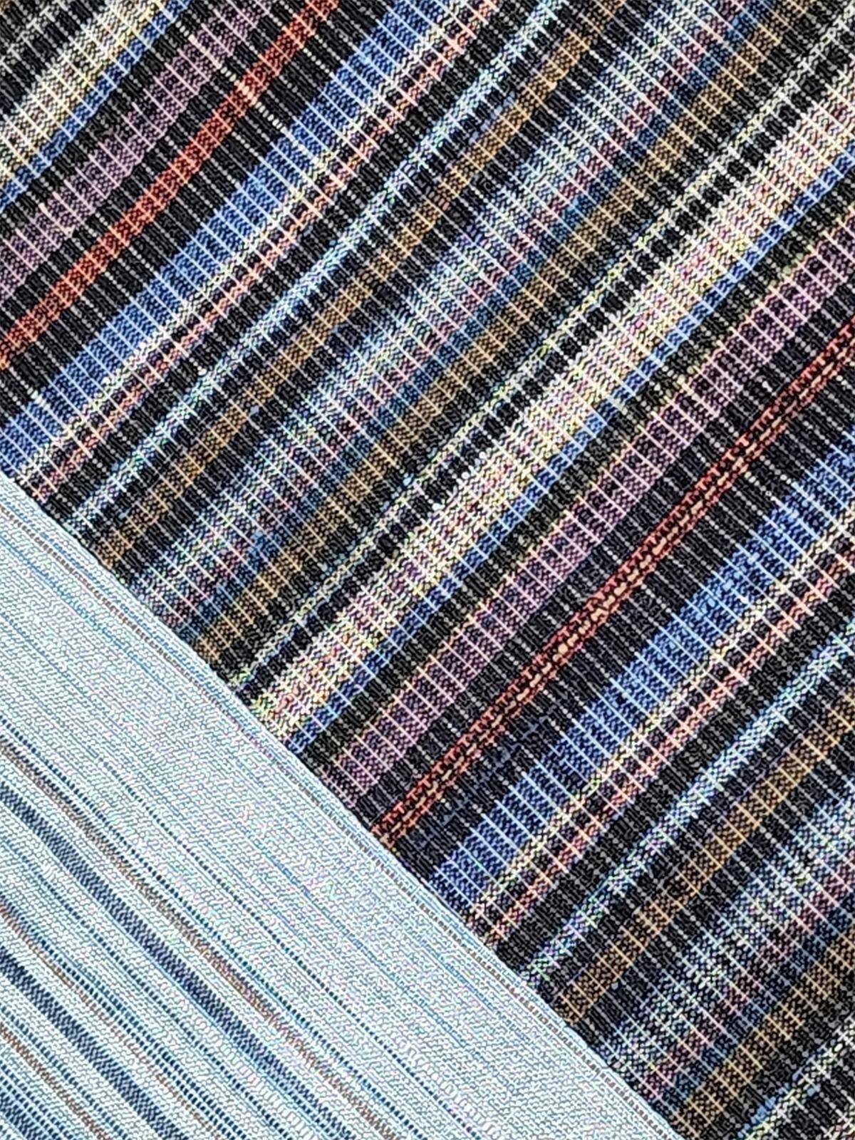 - デザイン:藍染のような繊細な青の濃淡が生み出す清流のような繊細な縞、藍墨と青の深色に薄紅や淡桃、薄茶、薄黄などの色糸が織り込まれた縞の2パターンの縞模様が織りだされた正絹紬地を、切り嵌めでつなぎ合わせたパッチワークデザイン。繊細な糸が描く縞のゆらぎが、手仕事の温かみを伝えます。