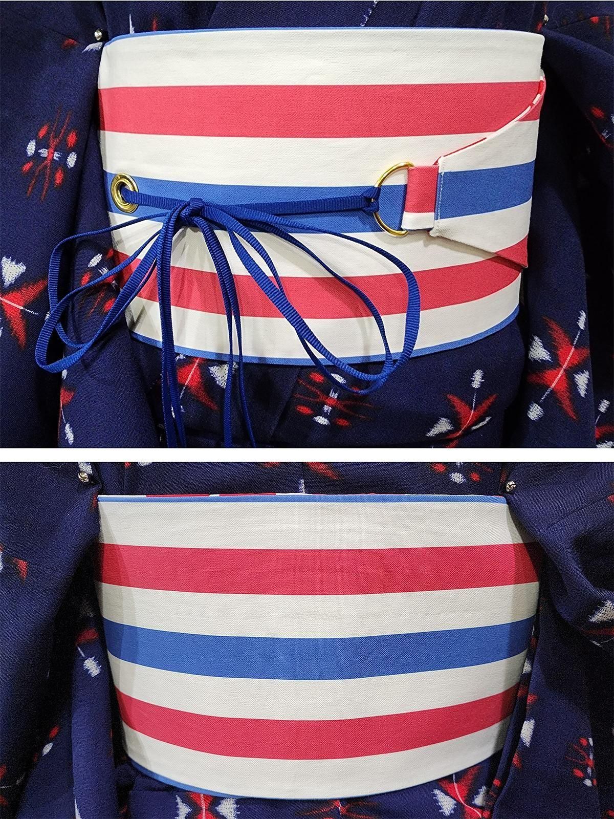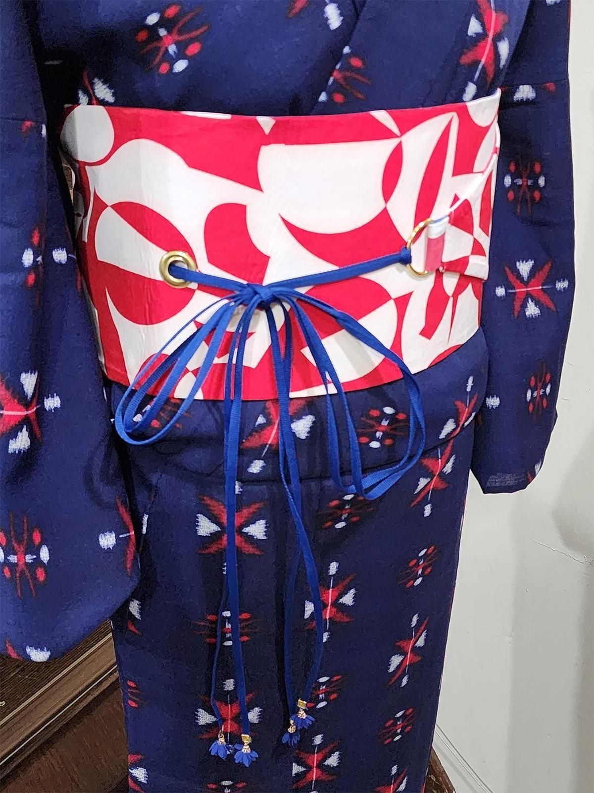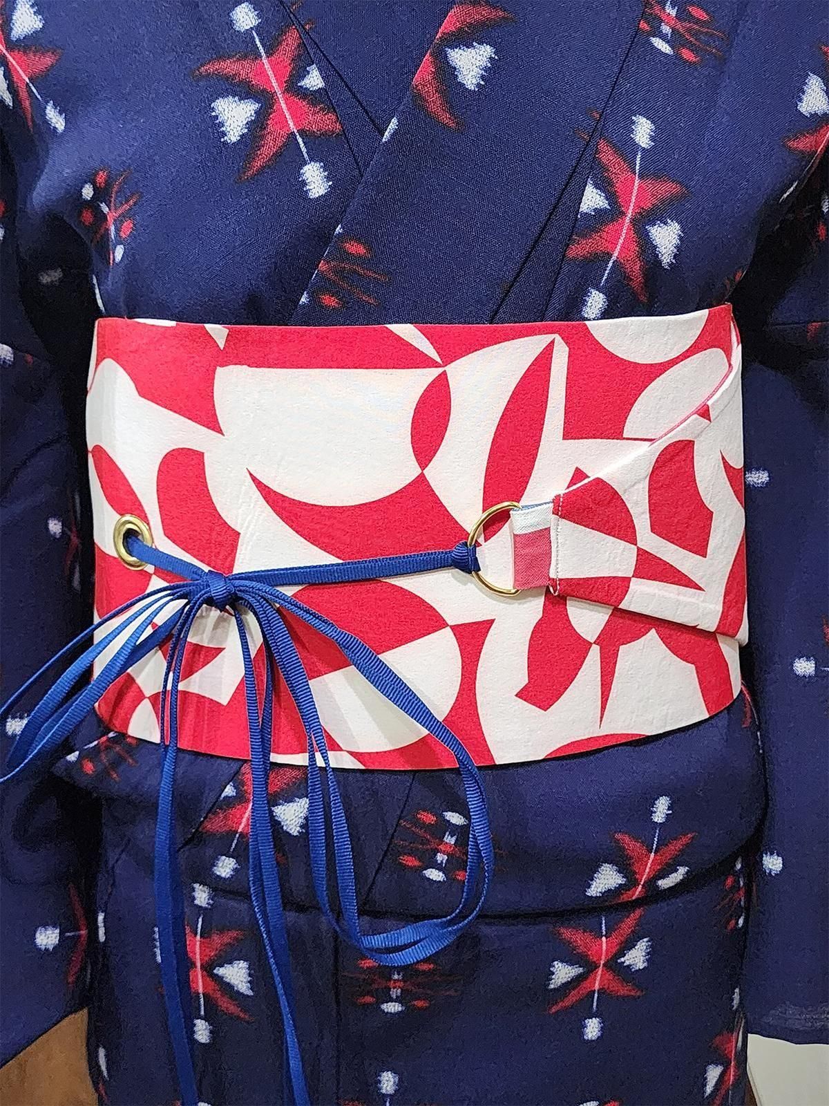 ベルトみたいに“通して結ぶだけ”。フレンチポップなトリコロールのボーダーパターン&モダンアートな赤の抽象デザインのリバーシブル「ベルタル・オビ」。(※紐の長さを変更した改良バージョンです)