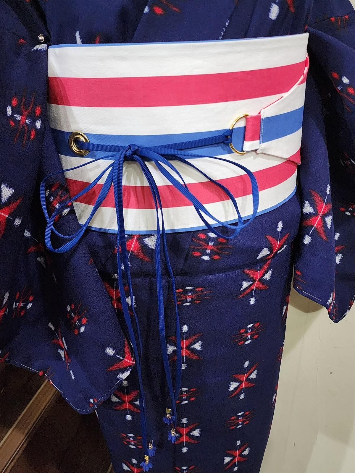 - ベルタル・オビとは: まるでベルト感覚で着用できる簡単帯。帯状の生地の両端に紐が付いていて、紐を本体のハトメ穴に通して前で結ぶだけでスタイリングが完成。紐は取り外しOKで、リボン結びや片蝶結びなどアレンジ自在、スカーフ等への付け替えも可能です。