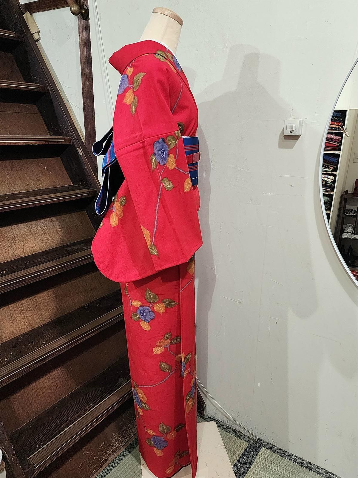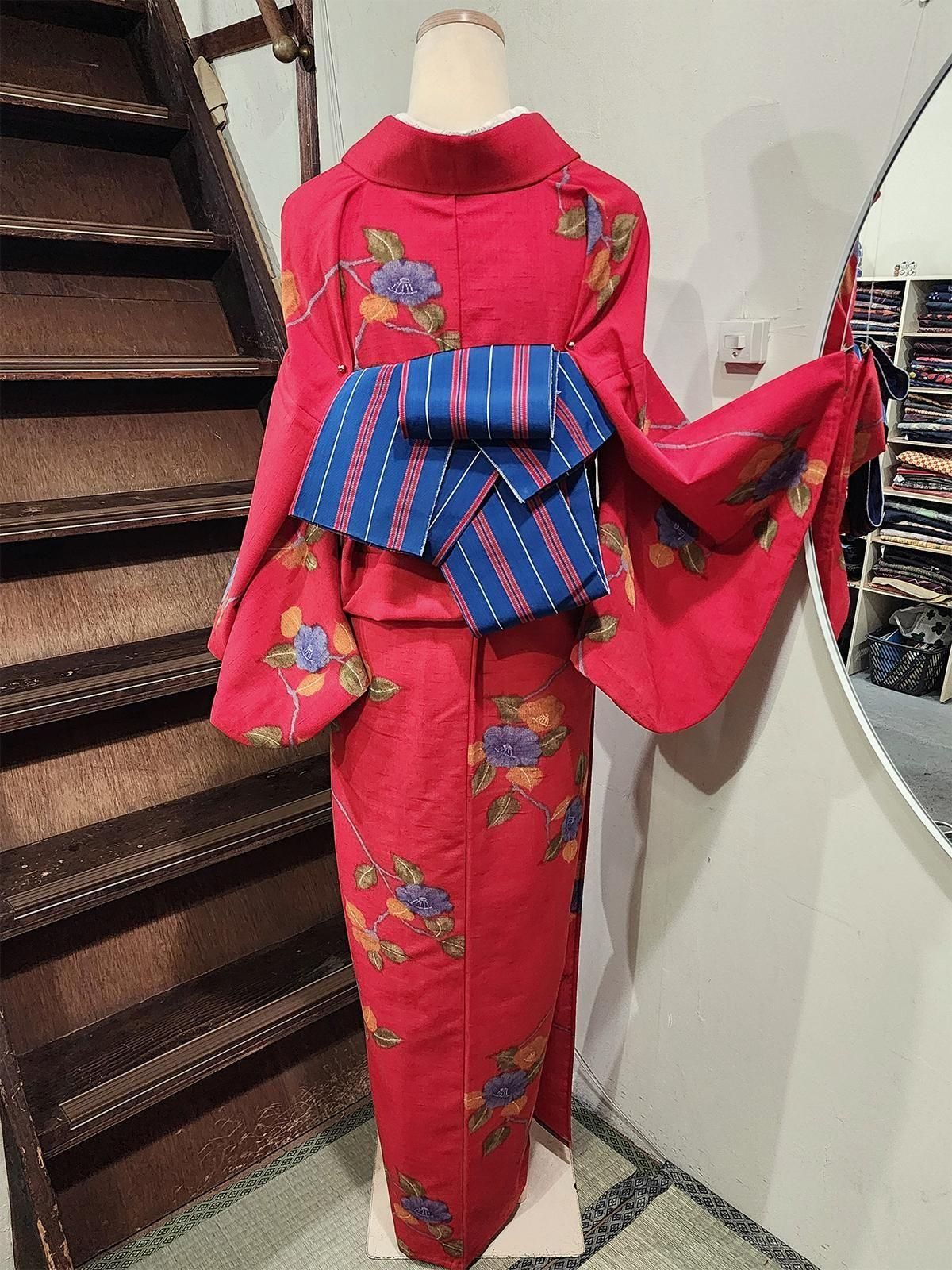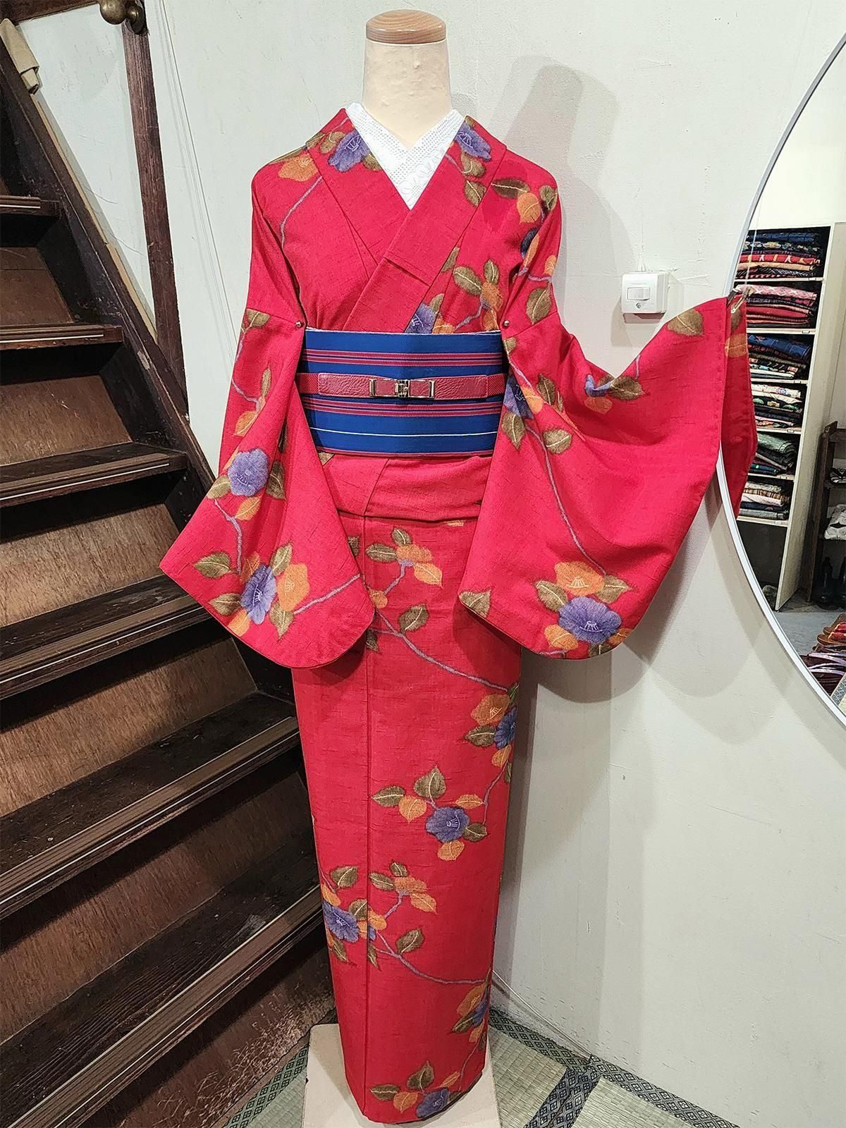 - コーデ提案: 写真のようにブルーやネイビーの帯できりっと引き締めて大人っぽく。ブラウンやマスタード、オレンジ系の帯でナチュラルかつぬくもりのある装いにしても素敵。紫の帯をあわせると華やかな個性がひきたちます。
