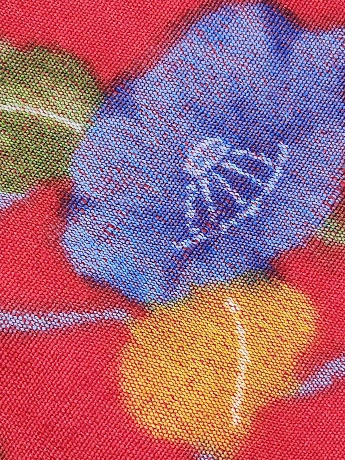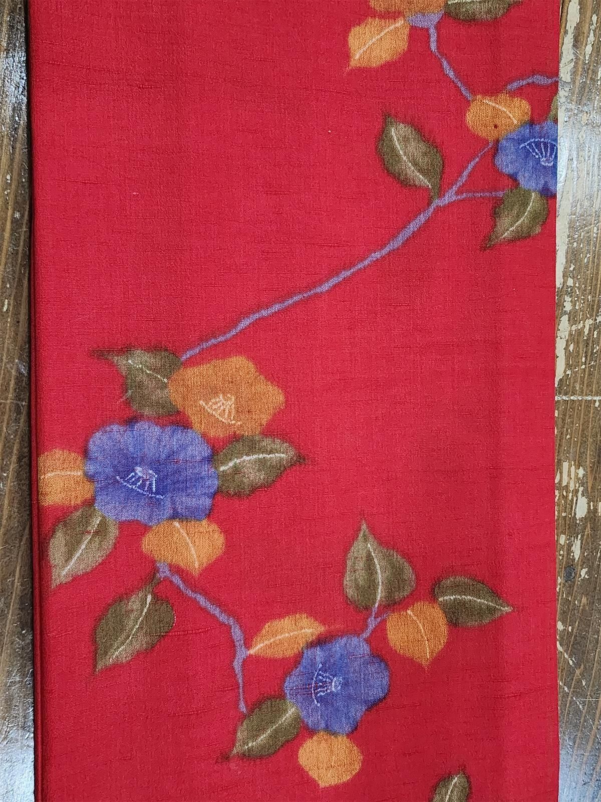 - デザイン: 鮮やかな朱赤を背景に、橙と藤紫色の椿の花枝が、ぼかしをきかせた優しい絣織りで織りだされた一枚。余白を活かした日本画を思わせる美しい構図と明るい赤の中に柔らかな色彩が溶け込む色使いのバランスが完璧。華やかな色柄に洗練された間を生み出し、大人の装いにもよりそう気品を生み出しています。