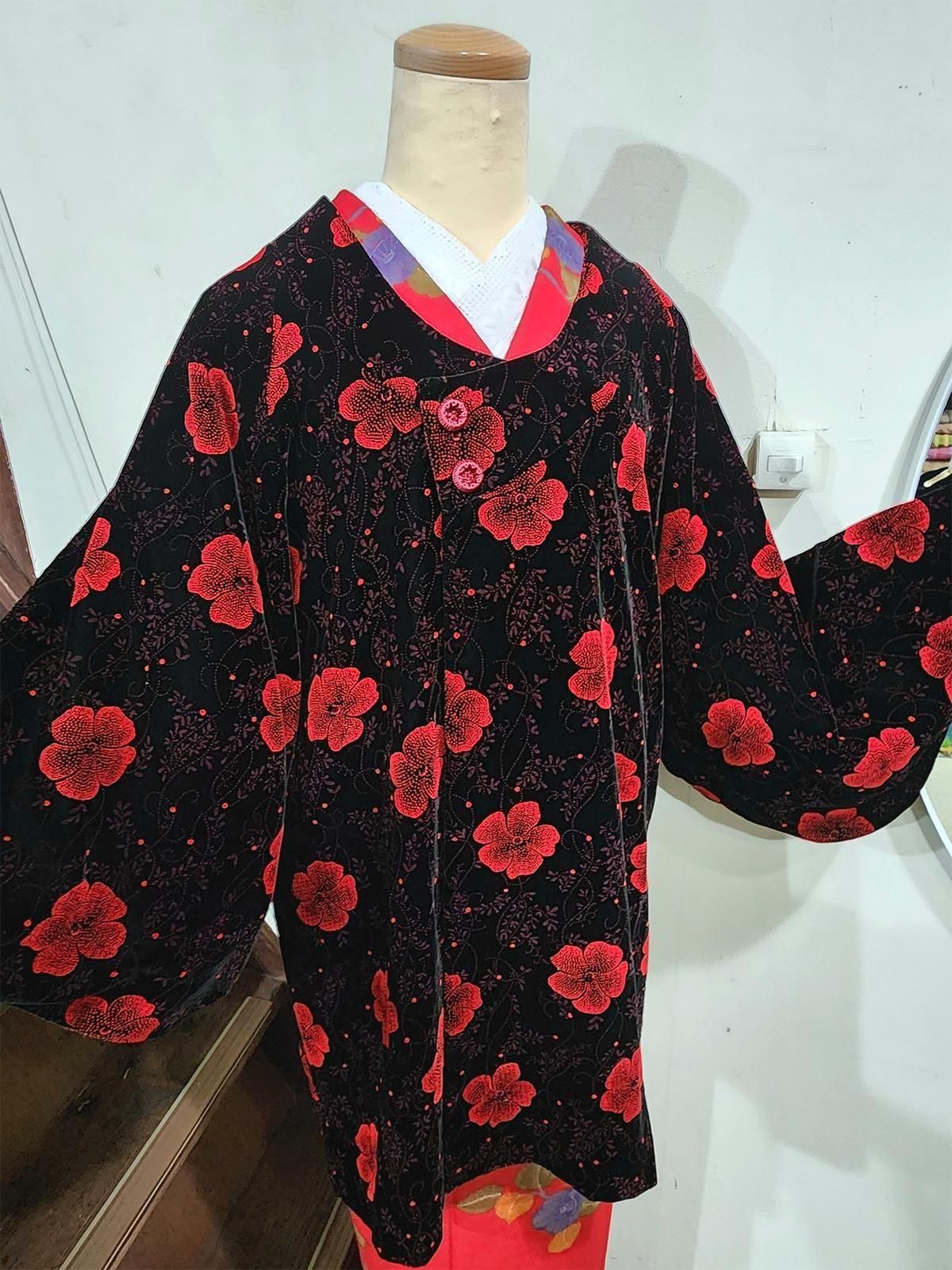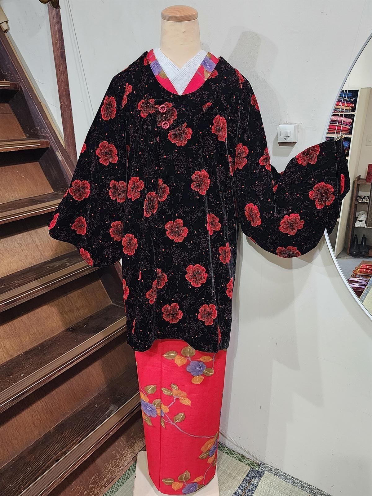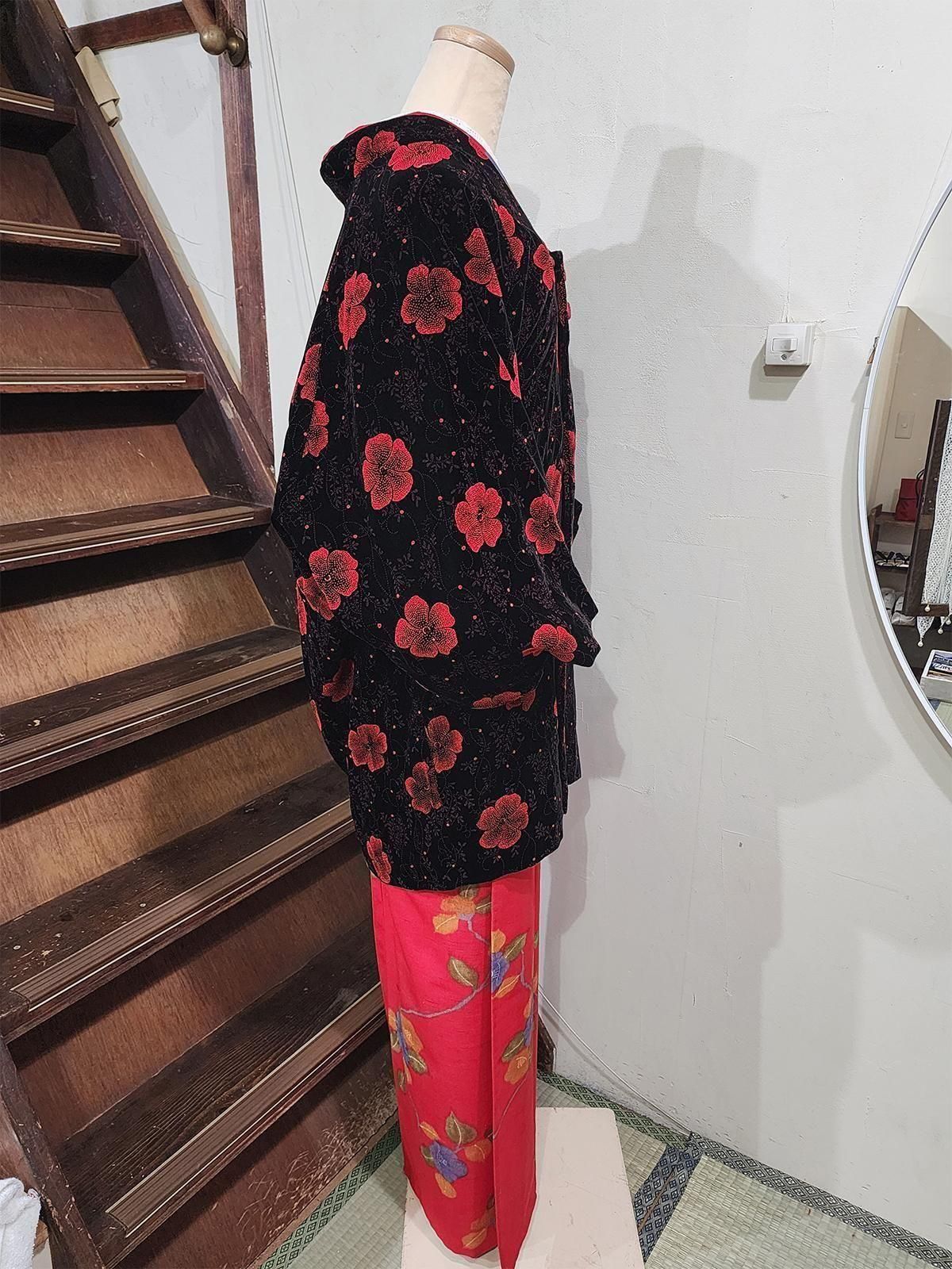 つややかなブラックベルベットに、点描美しいスカーレットの花が咲くビンテージ着物コート