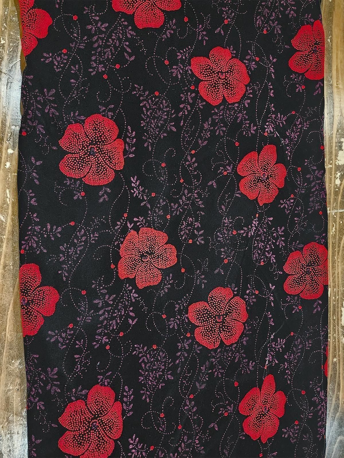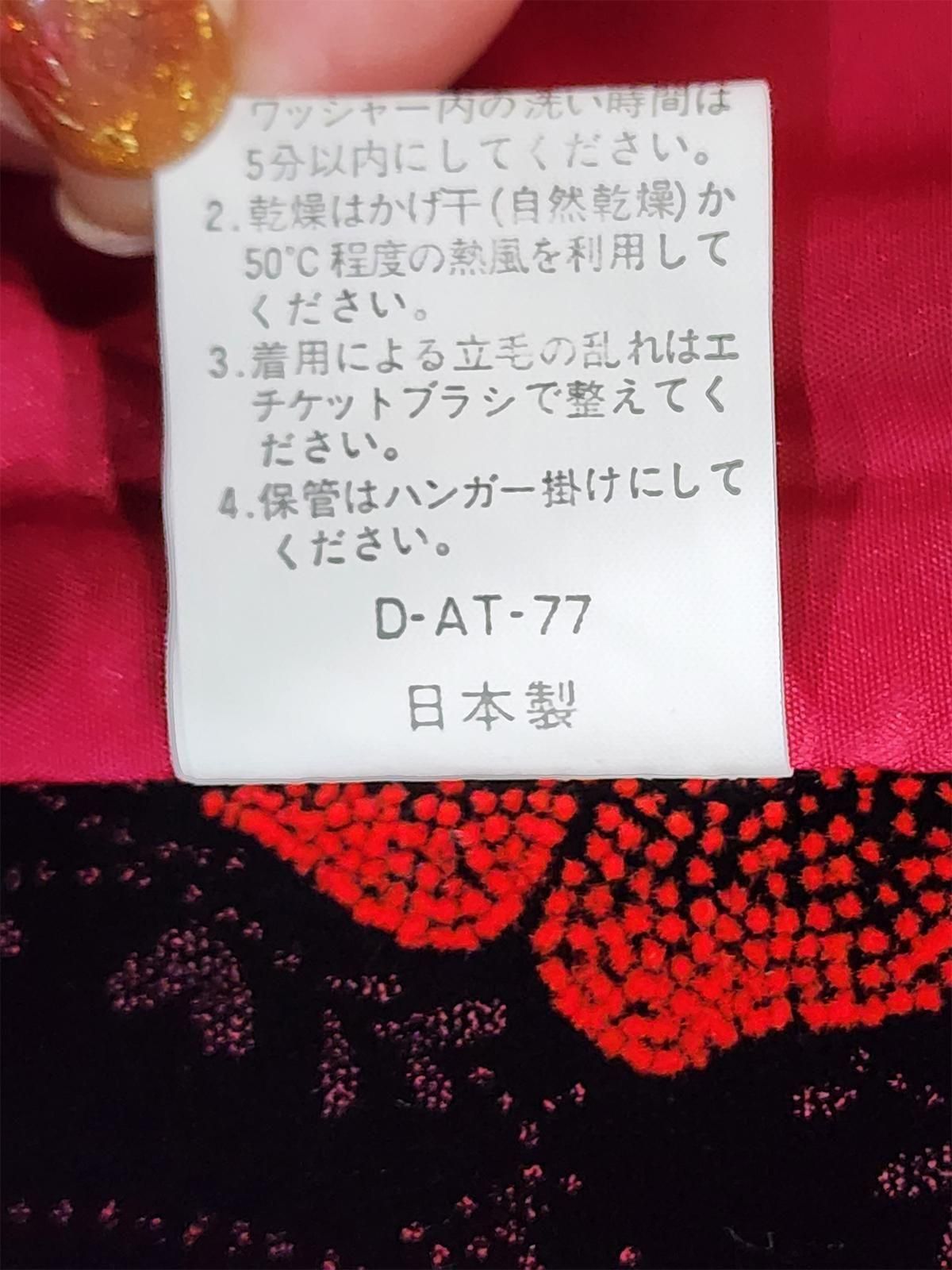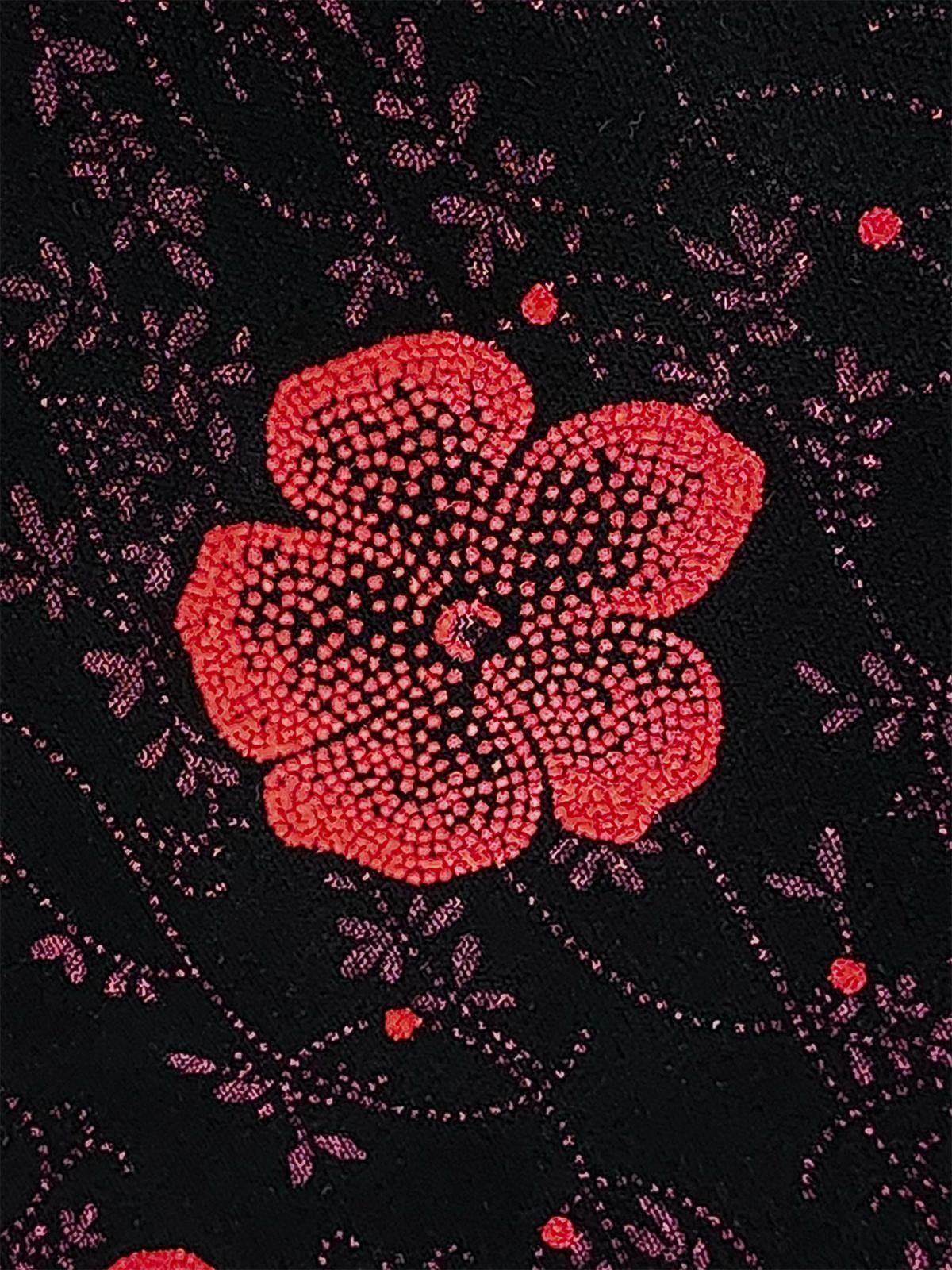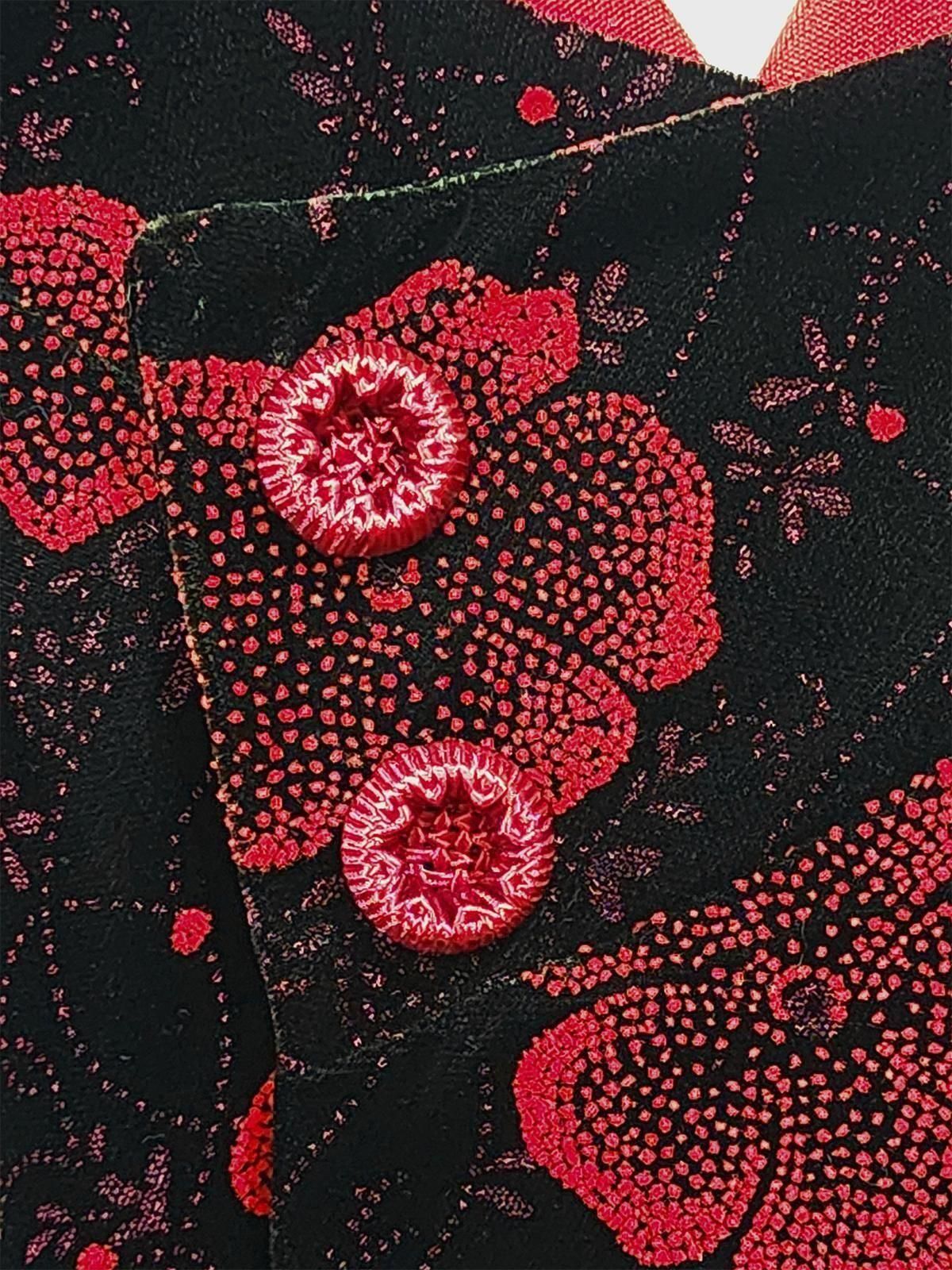 - デザイン: 深い黒のベルベット地に、立体的な点描で描かれたスカーレットルージュのフラワーモチーフが浮かぶドラマチックなデザイン。繊細で優雅なアラベスク調のリーフモチーフが、花模様の華やかな存在感をひきたてます。ドーセットボタンのようなレトロボタンが衿元にビンテージらしいクラシックなアクセントを添えます。