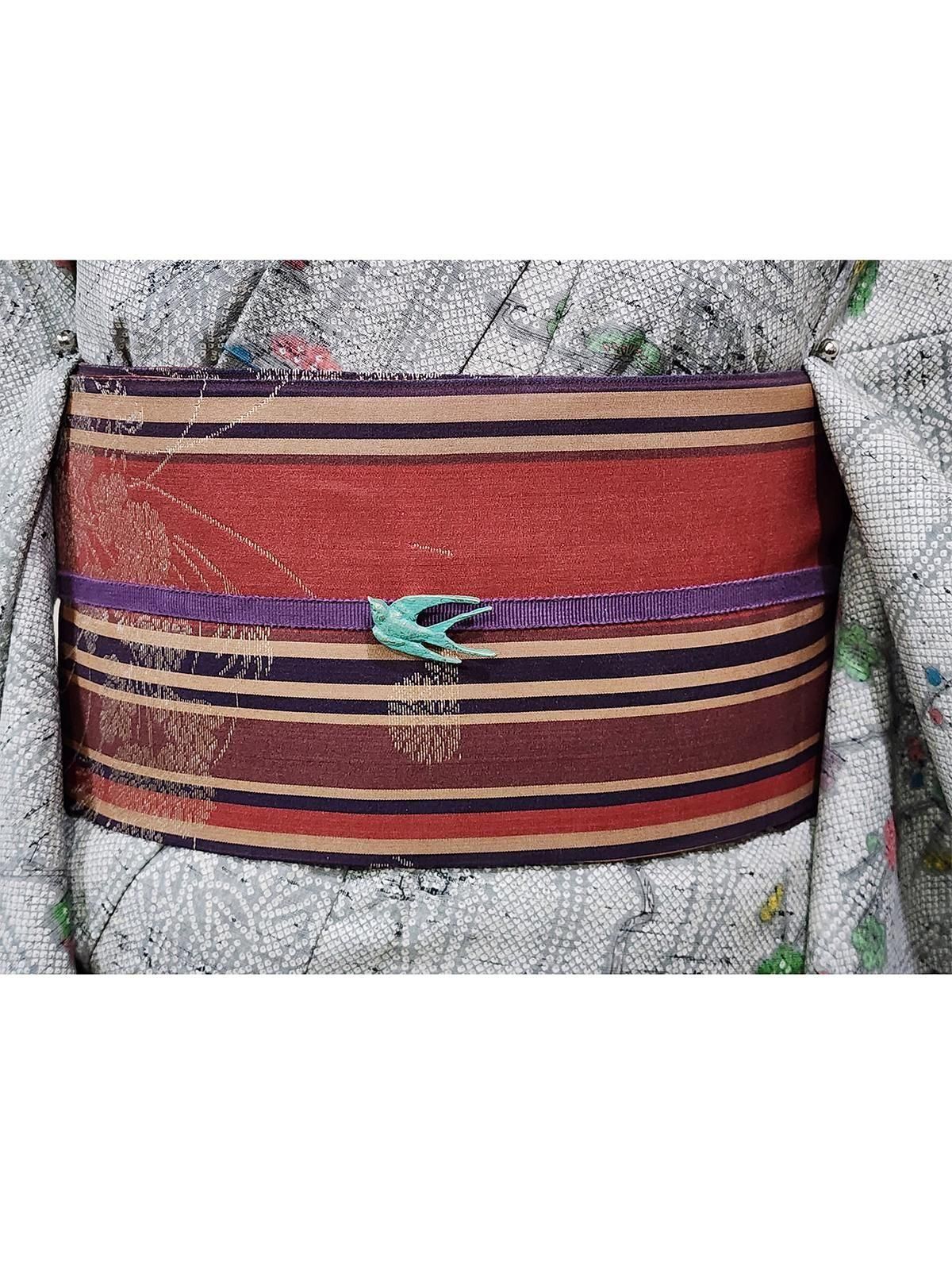 - コーデ提案: 黒やグレー、白や象牙色などのベーシックカラーの着物に華やかなアクセントを添えてくれます。紺や青などの寒色系にも、朱や紅、橙などの暖色系にもよくあい、芥子色や緑、紫などの中間色の着物にあわせても素敵。原色や彩度が高い色みよりも、スモークがかった色味のお着物によくあいます。