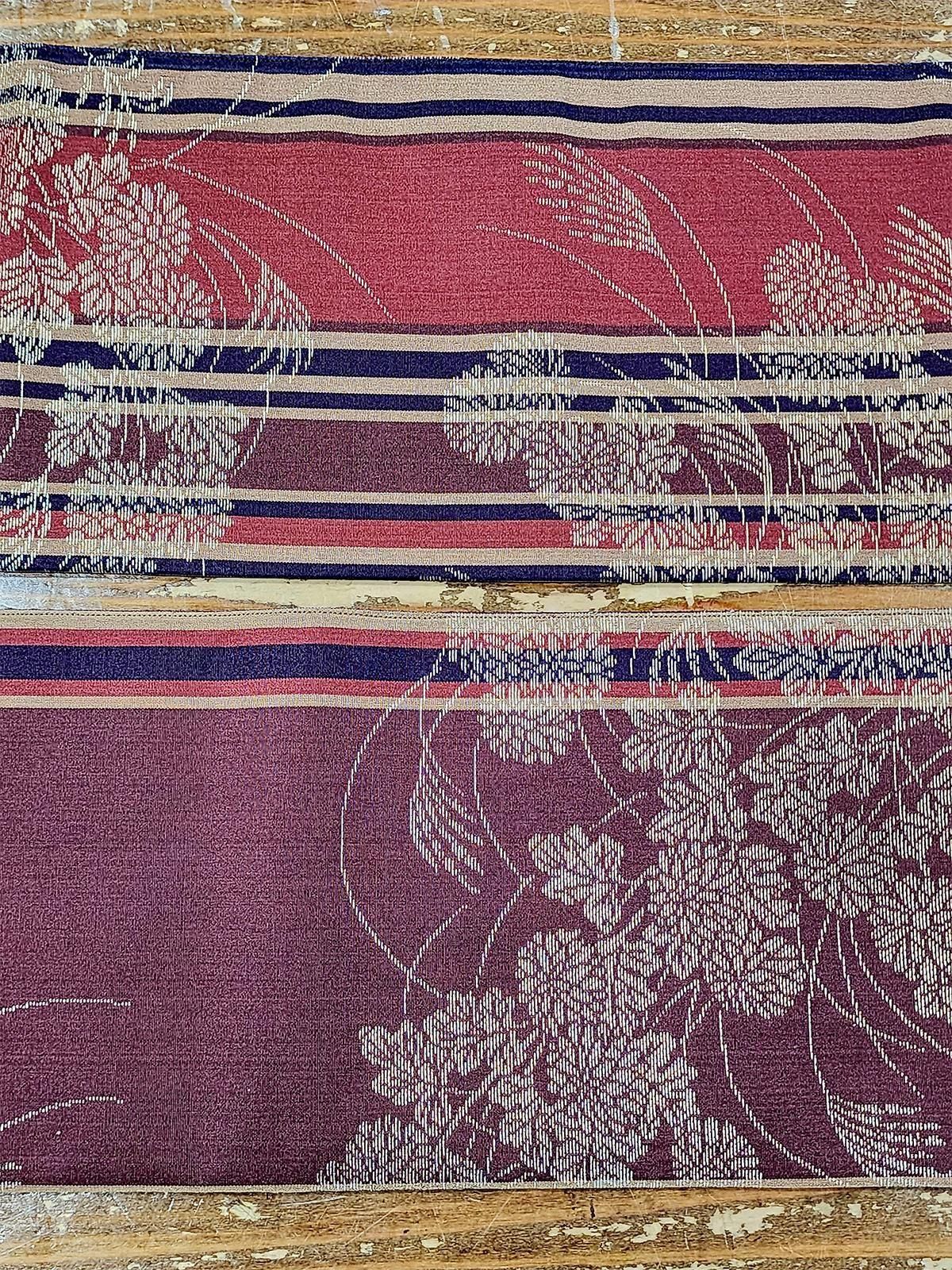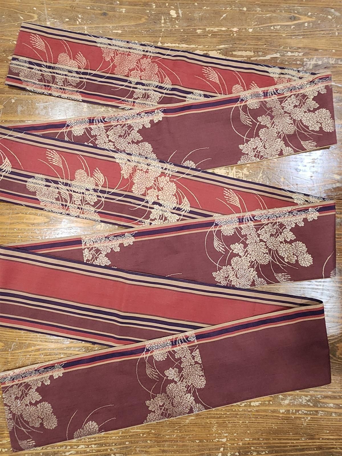 銀朱と蘇芳と紫紺の和の趣のある彩り美しい縞に、金糸の秋草が繊細にきらめくロンズサイズのリファイン半幅帯